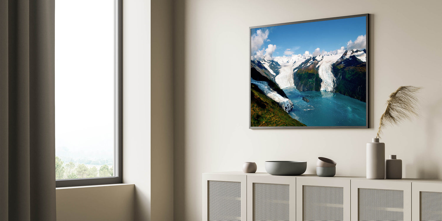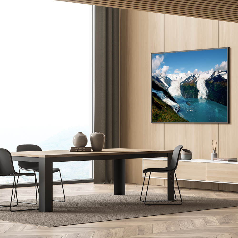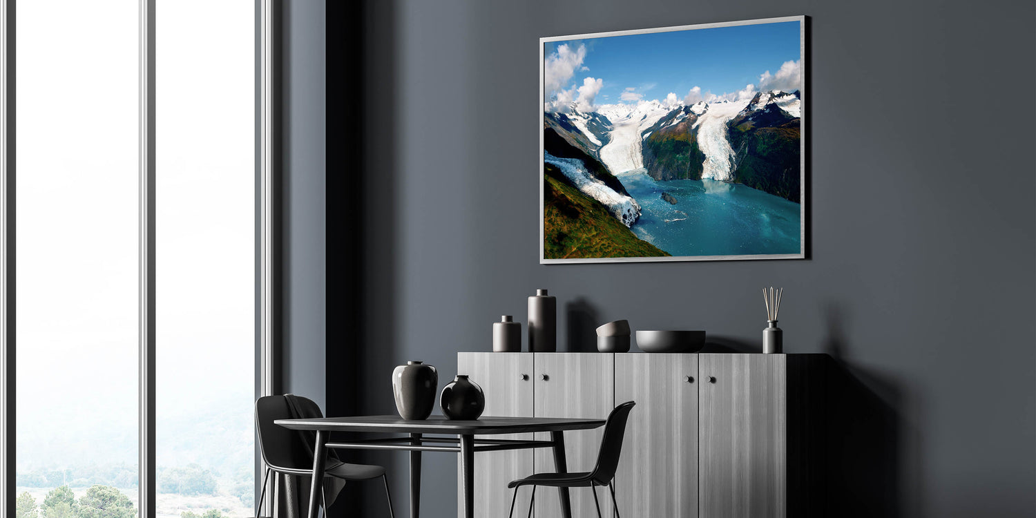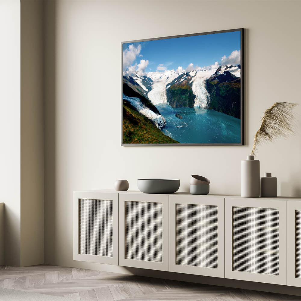 This glacier art piece is perfect for anyone who appreciates the awe-inspiring beauty of nature. Add this scenic glacier and mountain landscape to your collection and bring a sense of peace and grandeur to your surroundings.
