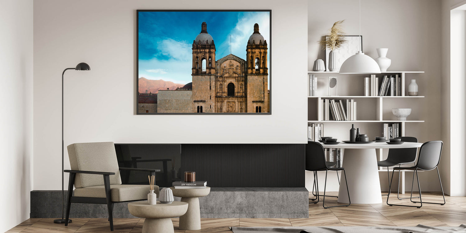 Capture the grandeur and elegance of Oaxaca’s iconic architecture with this stunning wall art featuring the majestic Santo Domingo Cathedral. Set against a backdrop of vivid blue skies and distant mountains, the intricate details of the cathedral’s facade evoke a sense of history and cultural richness. This artwork is a perfect way to bring a touch of Oaxaca’s heritage and timeless beauty into your home or office.