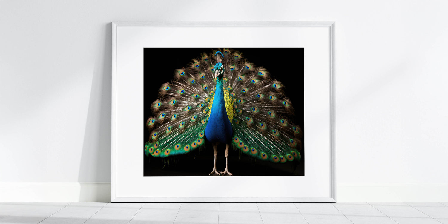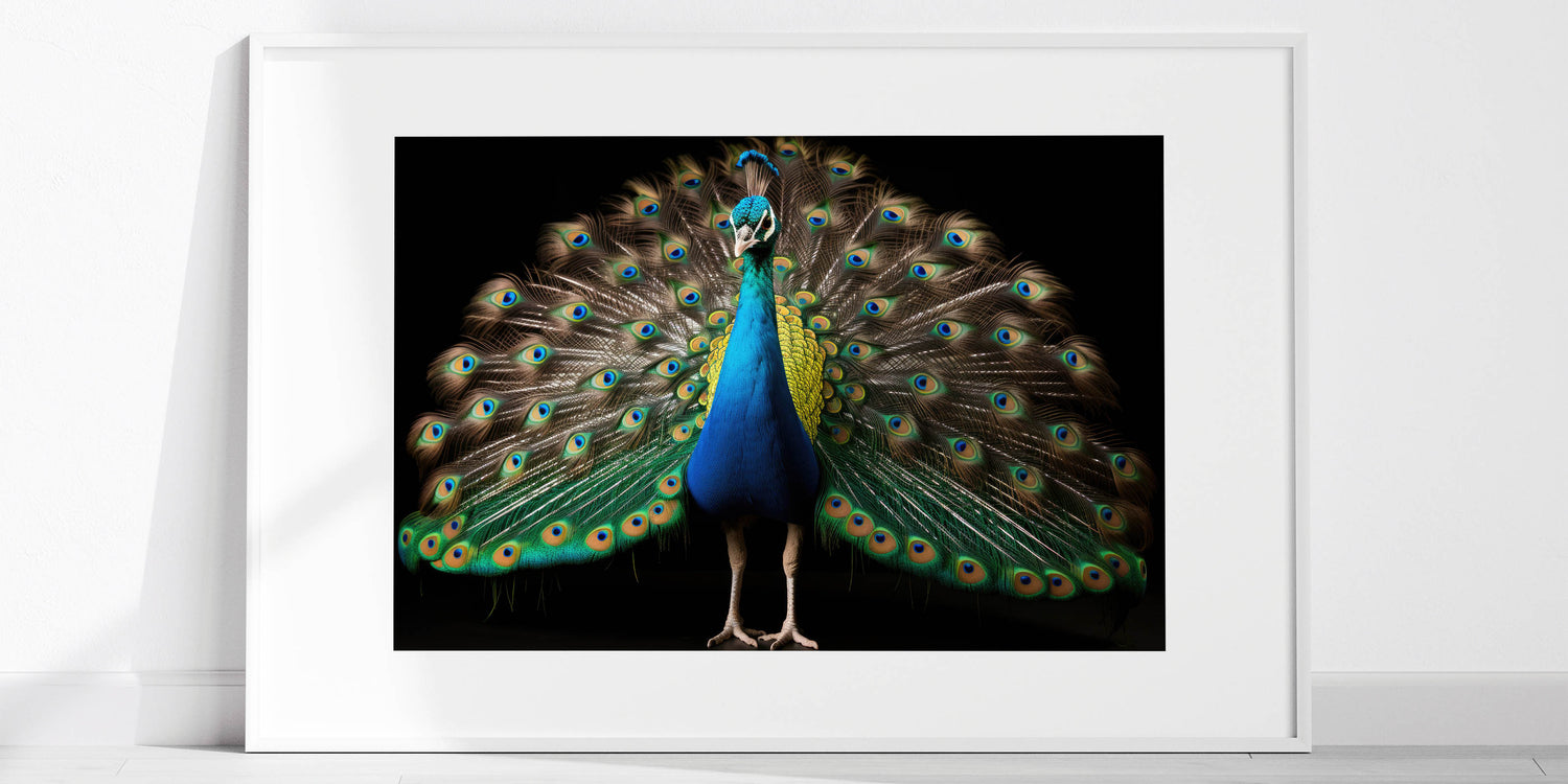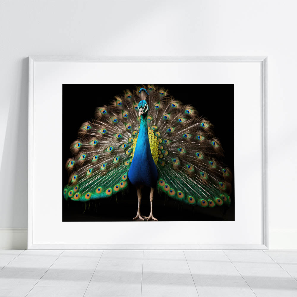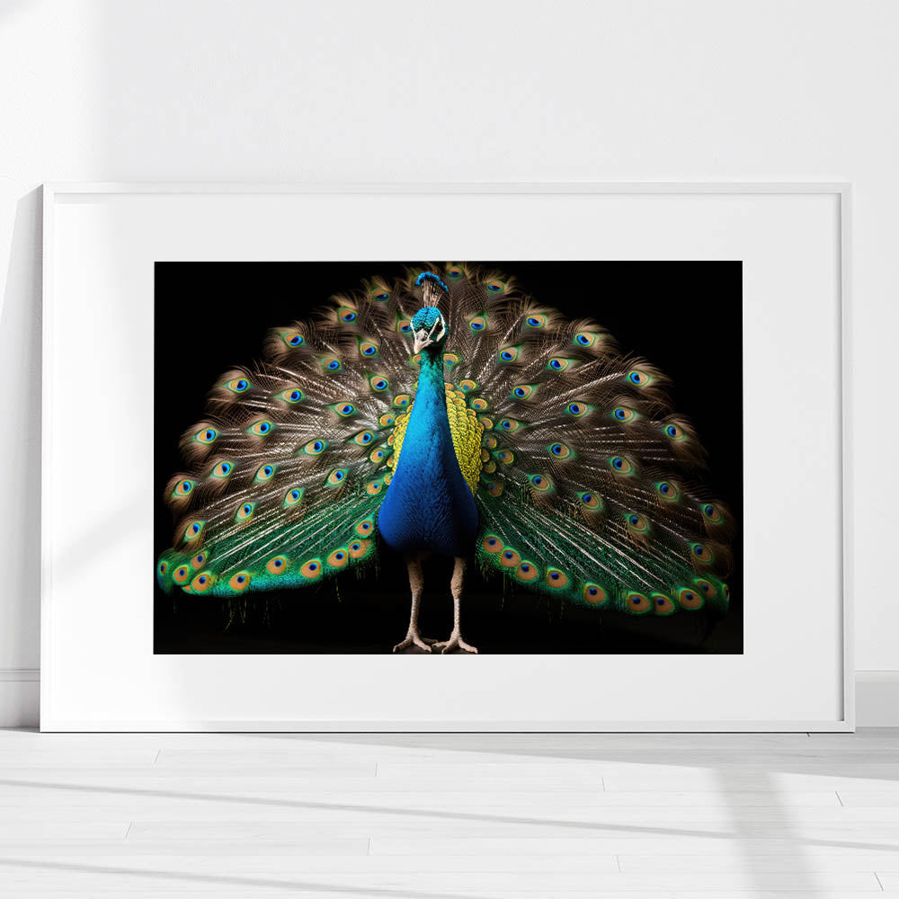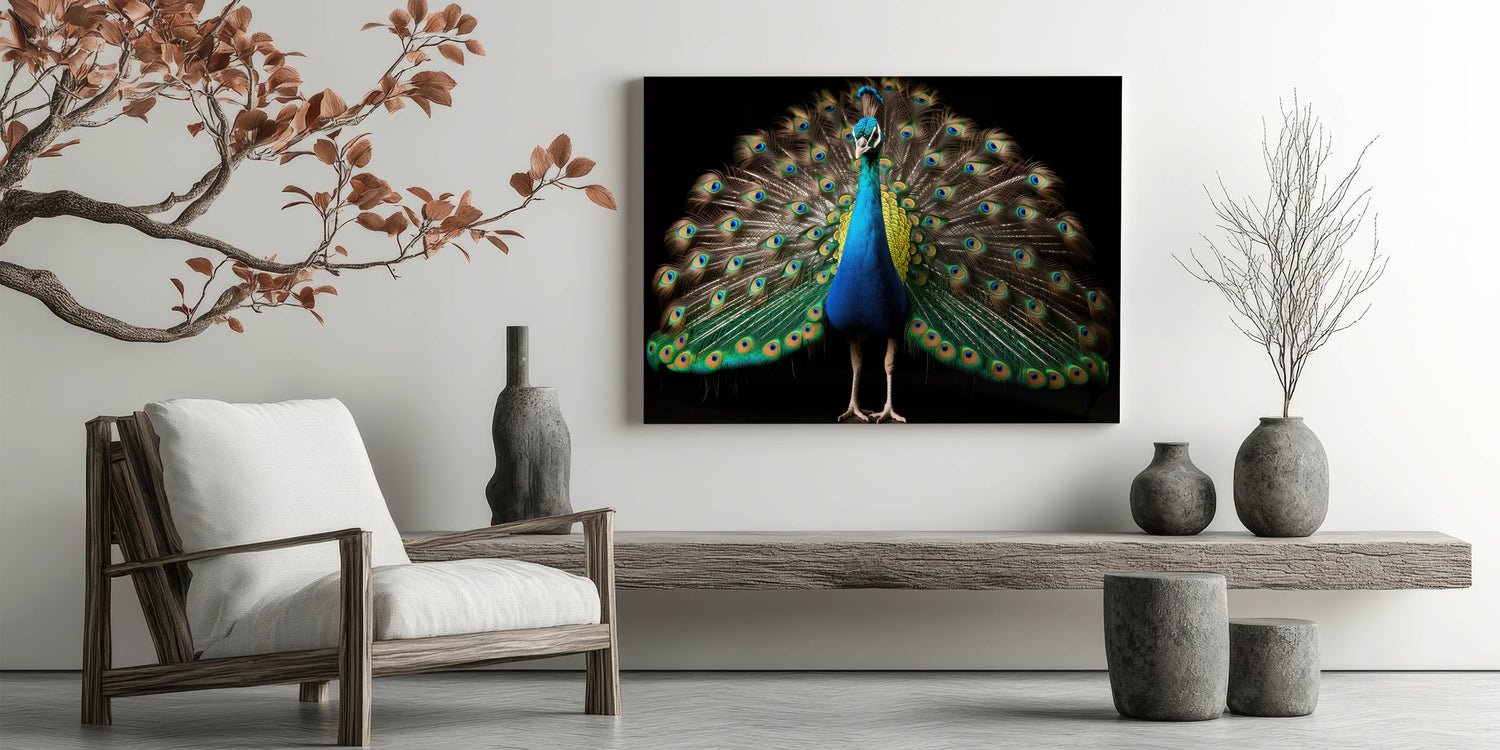 Make a bold statement in your home with this Majestic Peacock Display Wall Art. This striking artwork features a regal peacock in full display, showcasing its vibrant feathers in a stunning array of blues, greens, and yellows against a deep black background. The intricate details and vivid colors of the peacock’s plumage create a powerful visual impact, making this piece a perfect focal point for any room. Available in a range of formats, including stretched canvas, framed canvas, acrylic glass, and rolled prints, this artwork is versatile and can enhance any decor style, from modern to traditional.