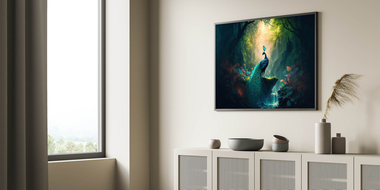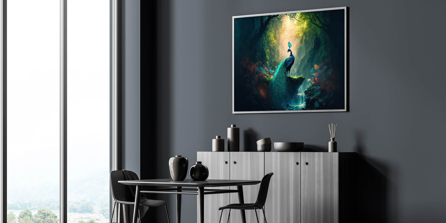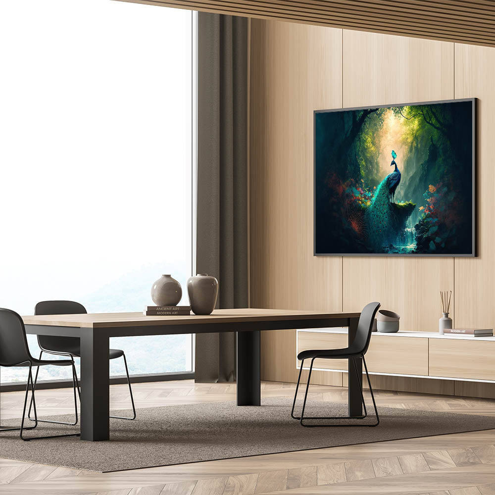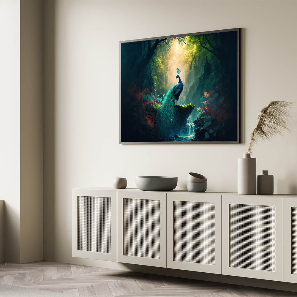Transform your space into an enchanting retreat with our Majestic Peacock in Mystical Rainforest Art. This captivating canvas print captures the serene beauty of a peacock perched on a lush cliff, surrounded by vibrant foliage and a tranquil waterfall. The ethereal lighting and rich, deep colors create a mystical atmosphere, making this artwork a perfect statement piece for any room.