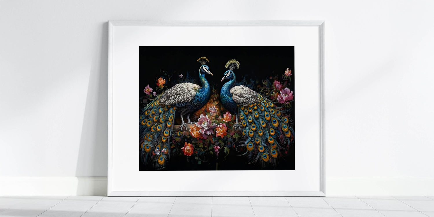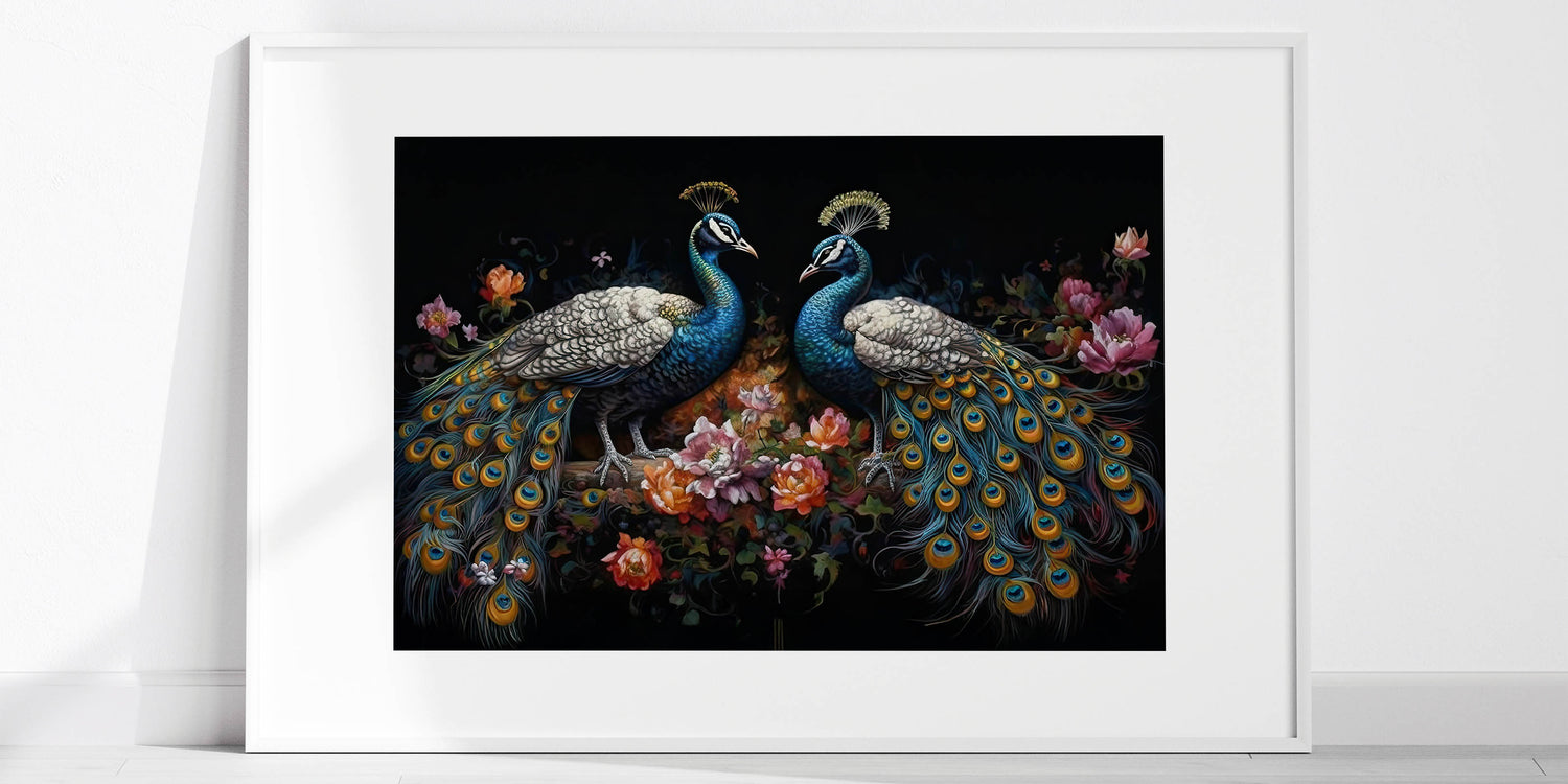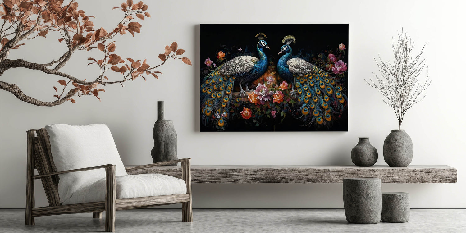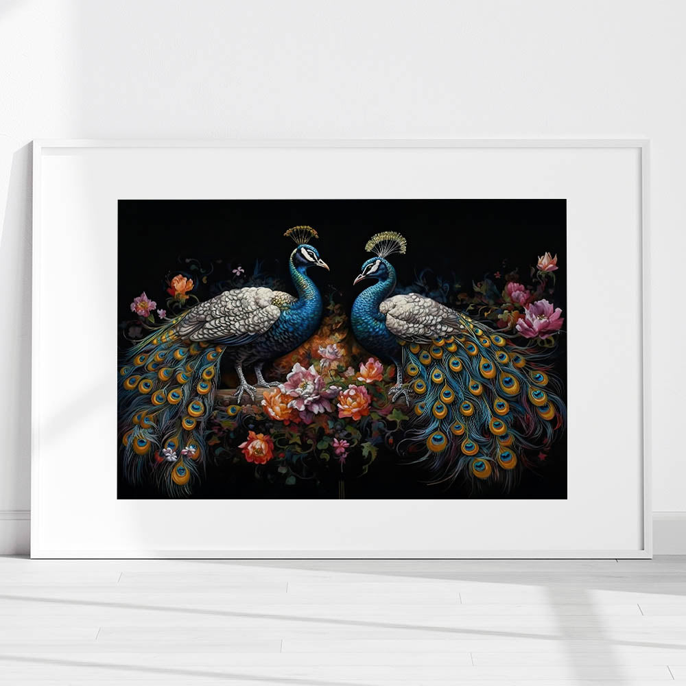 Enhance your home with this Majestic Peacock Pair Wall Art, a stunning piece that beautifully captures the elegance of two peacocks amidst a lush floral background. The vibrant blues and greens of the peacocks’ feathers, combined with the rich floral accents, create a visually captivating artwork that brings luxury and charm to any room. This masterpiece is available in multiple formats, including stretched canvas, framed canvas, acrylic glass, and rolled prints, offering versatile options to suit your decor preferences.
