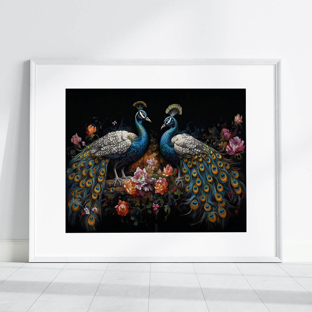 • Vibrant Colors and Detail: Features a pair of majestic peacocks in rich hues of blue and green, surrounded by intricate floral designs.