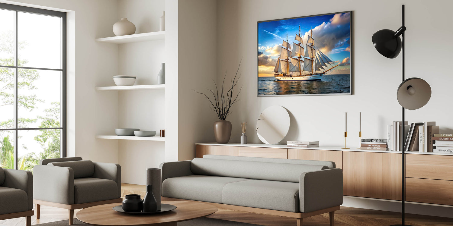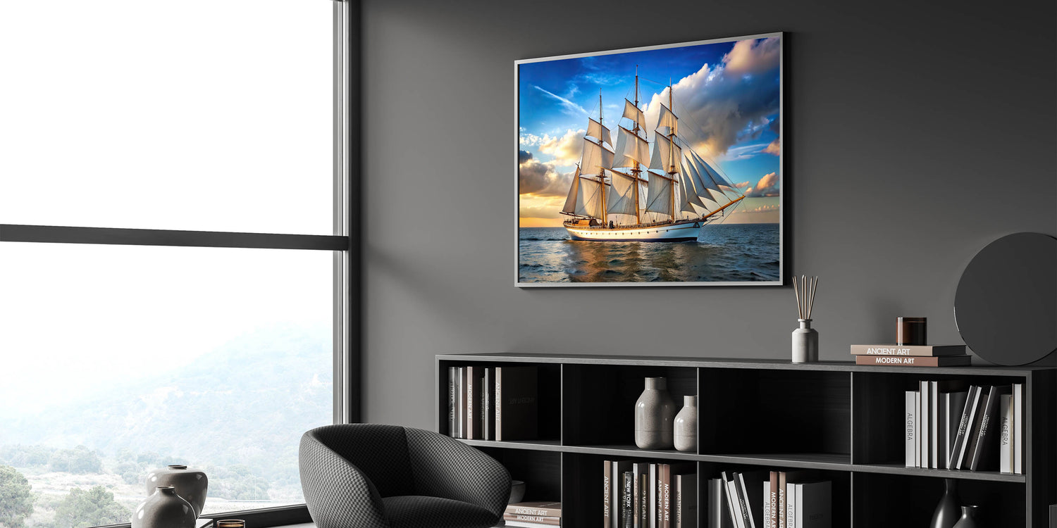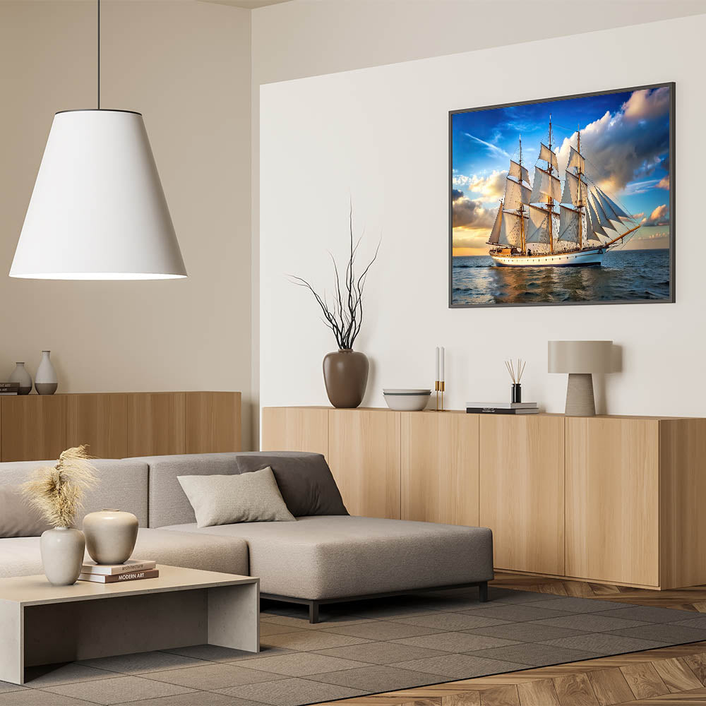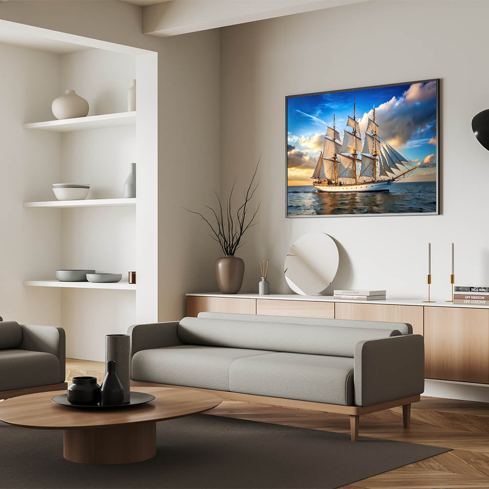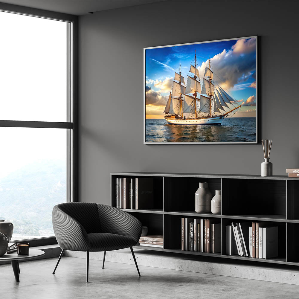 Experience the grandeur of the open sea with this breathtaking "Majestic Sailing Ship Wall Art." This piece features a stunning depiction of a classic tall ship with full sails catching the wind as it navigates the vast ocean. Perfect for those who appreciate maritime history and the beauty of ocean exploration, this artwork adds a powerful and dynamic element to any room. Available in multiple formats such as stretched canvas, framed canvas, acrylic glass, and framed prints, this versatile design complements any coastal or nautical-themed decor.
