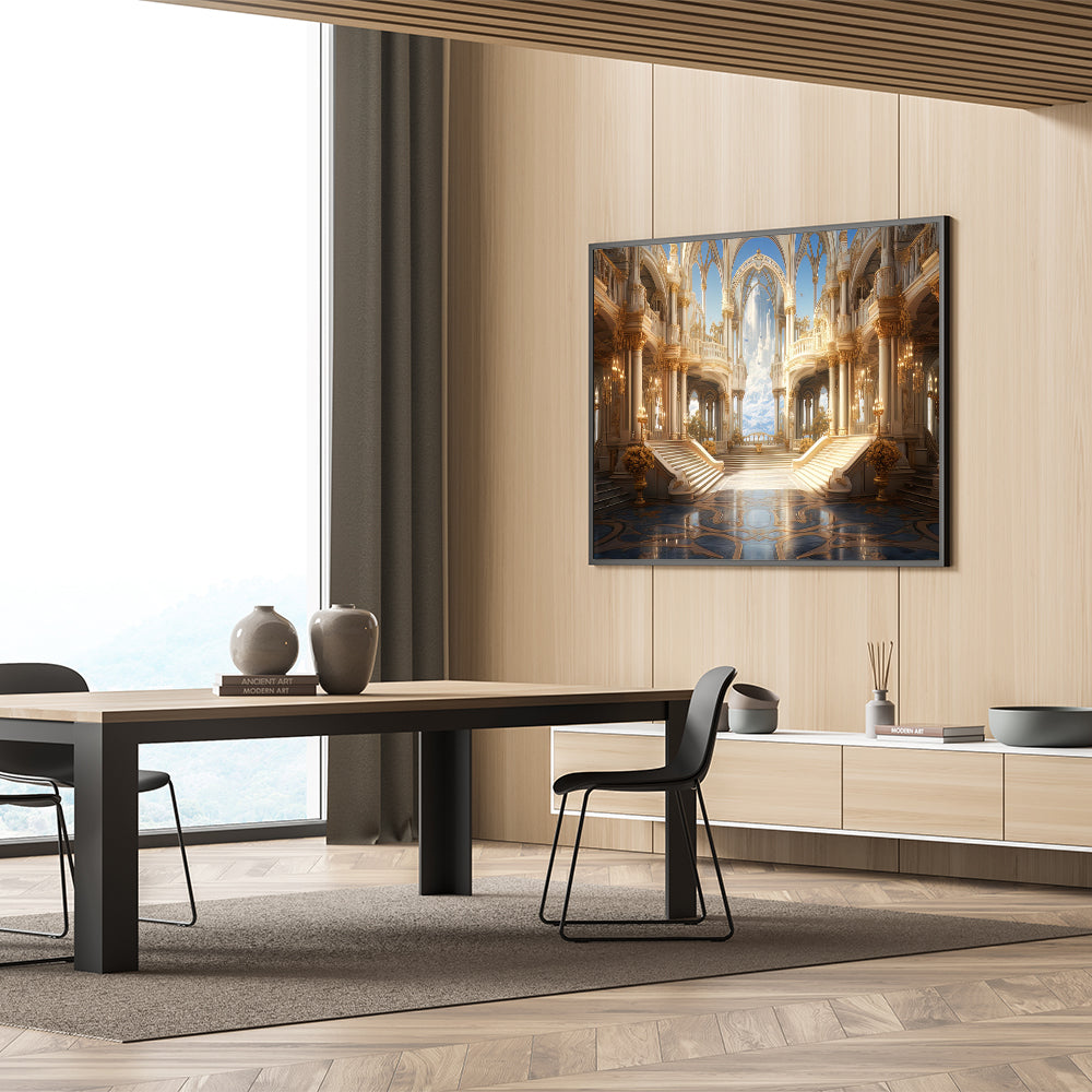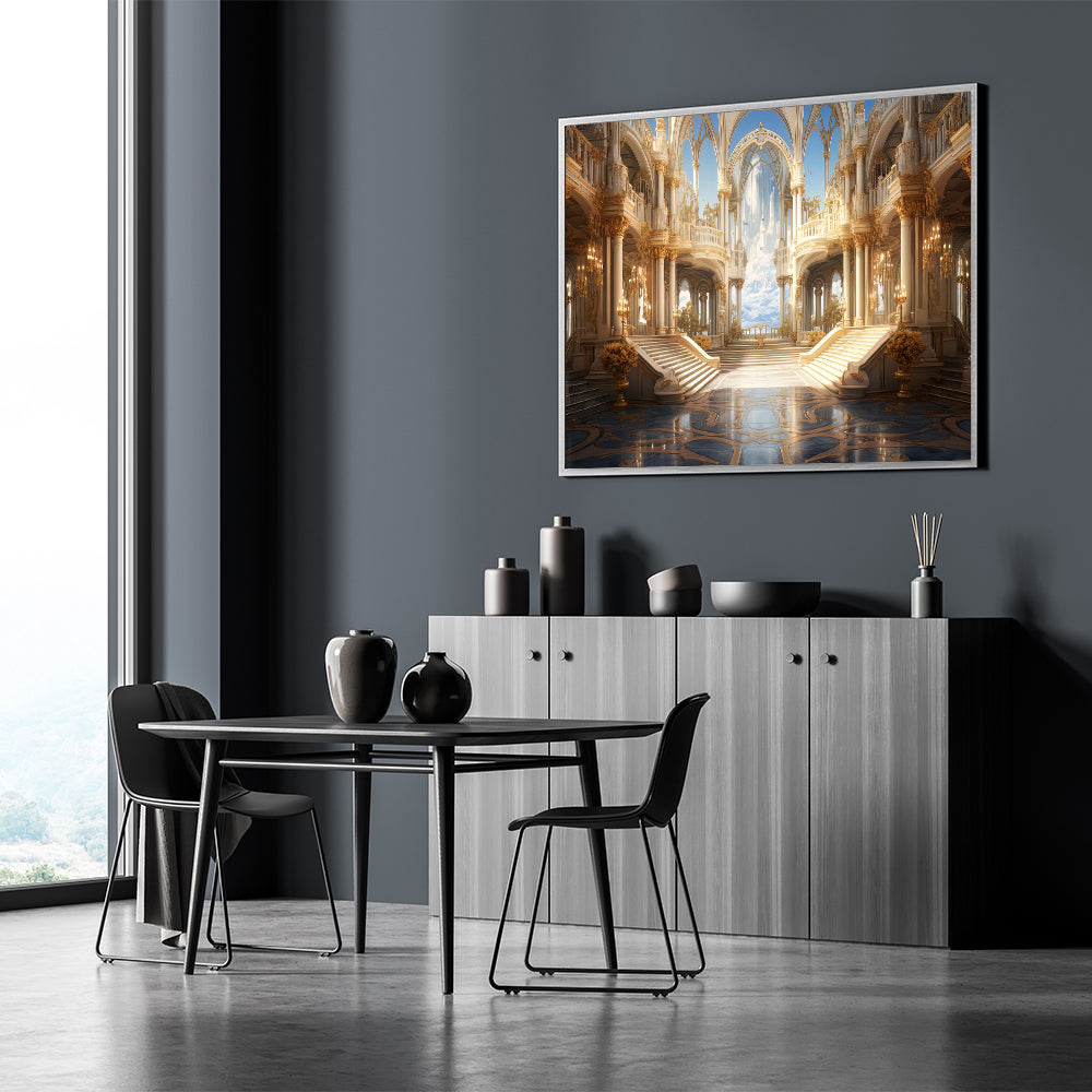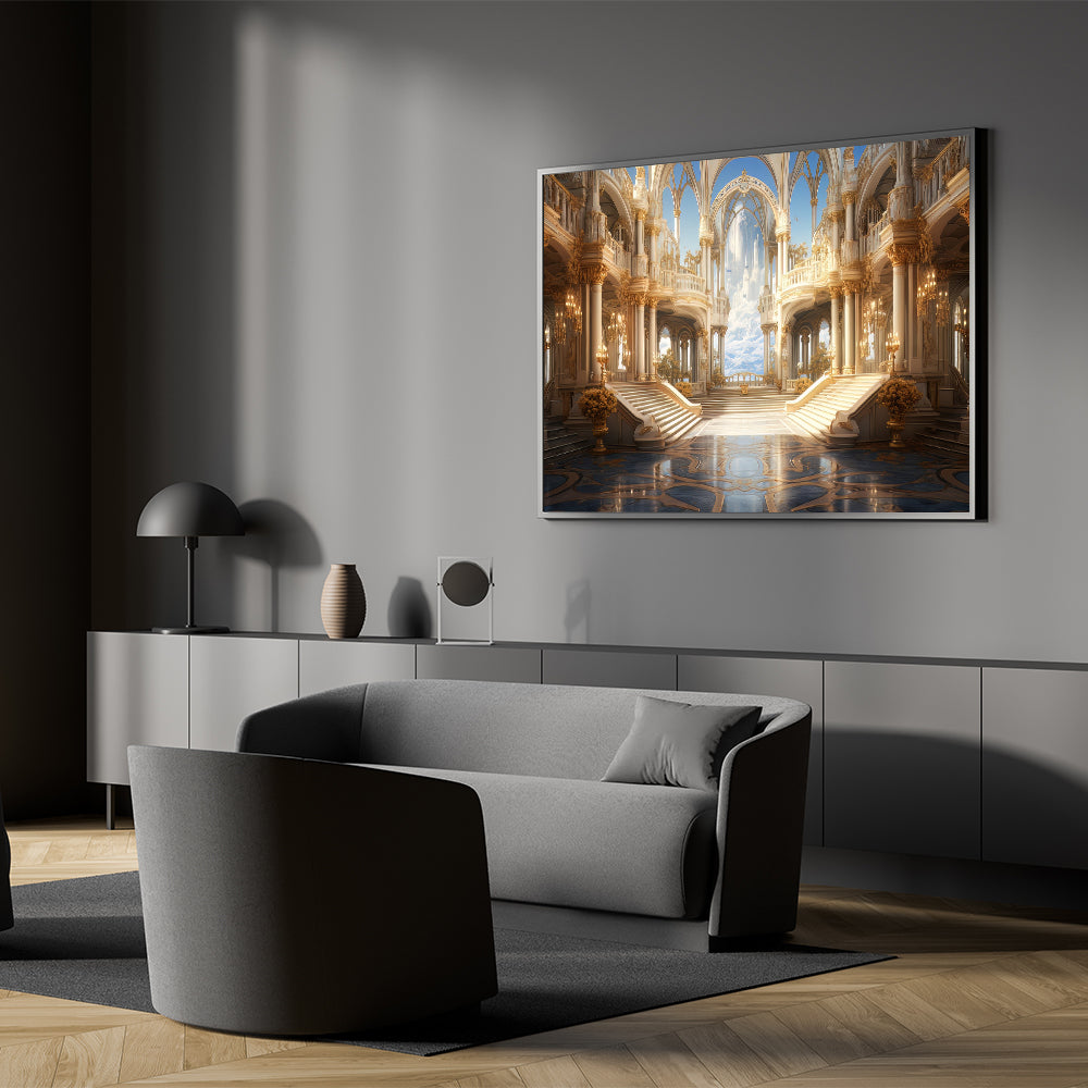 Elevate your space with the breathtaking beauty of this majestic grand palace interior, bathed in golden sunlight. The intricate arches, grand staircases, and luxurious decor come together to create a vision of regal elegance and splendor. This artwork captures the opulence and architectural brilliance of a royal palace, making it a stunning addition to any sophisticated home or office decor.
