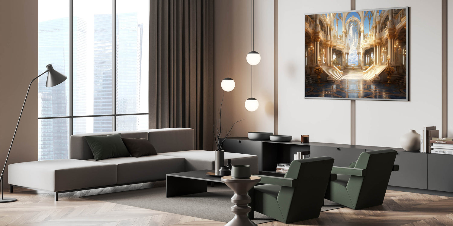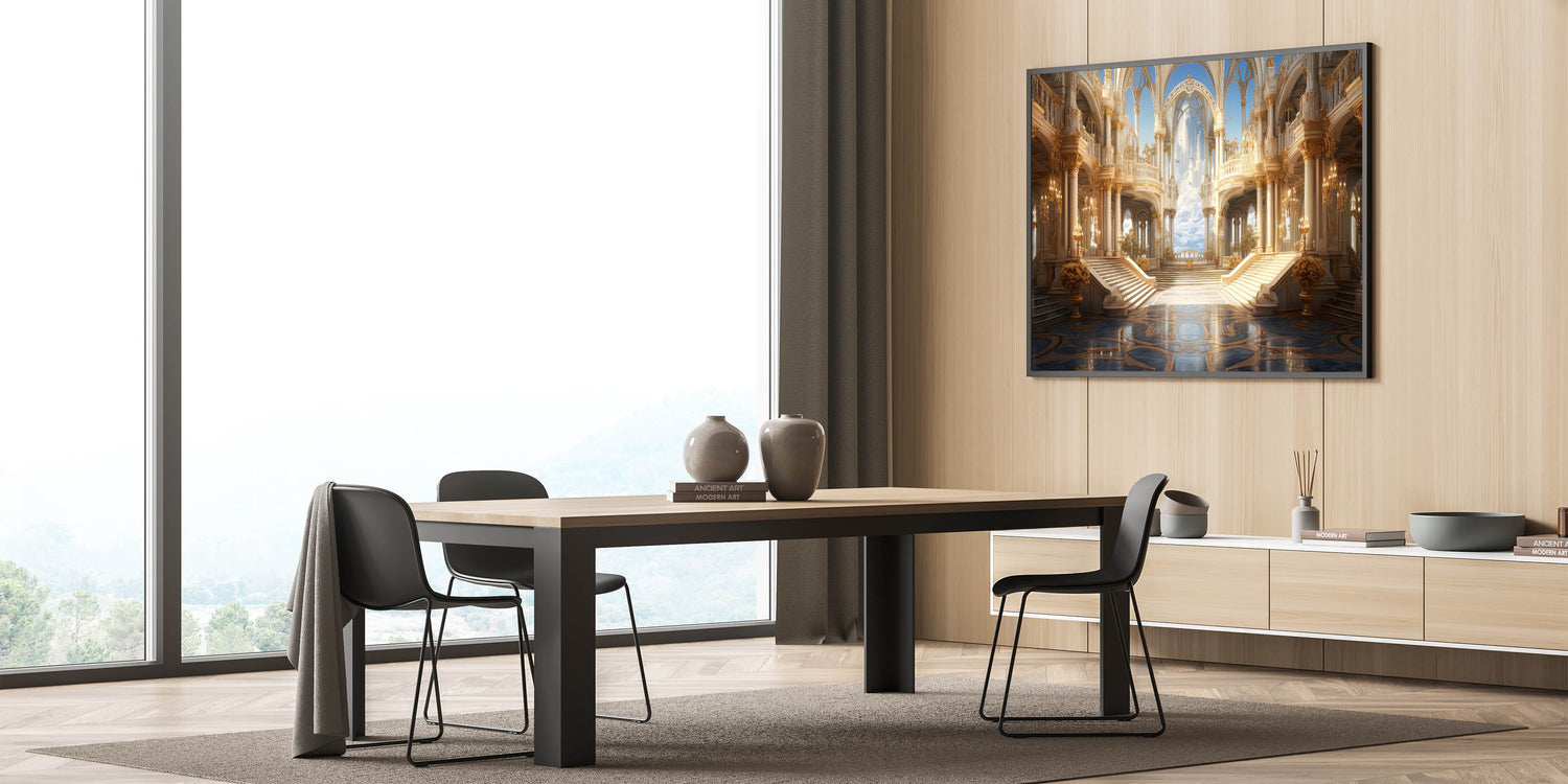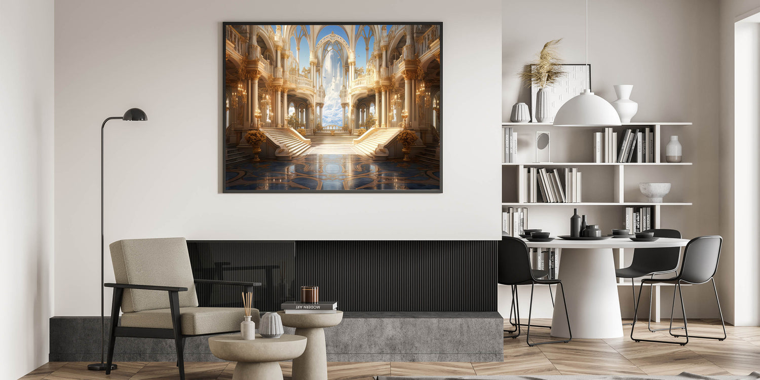 Elevate your space with the breathtaking beauty of this majestic grand palace interior, bathed in golden sunlight. The intricate arches, grand staircases, and luxurious decor come together to create a vision of regal elegance and splendor. This artwork captures the opulence and architectural brilliance of a royal palace, making it a stunning addition to any sophisticated home or office decor.