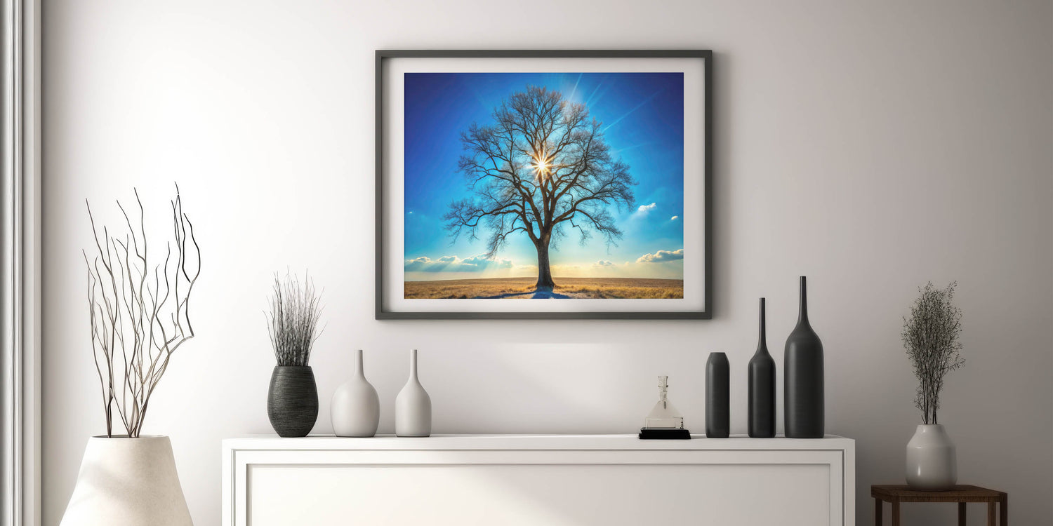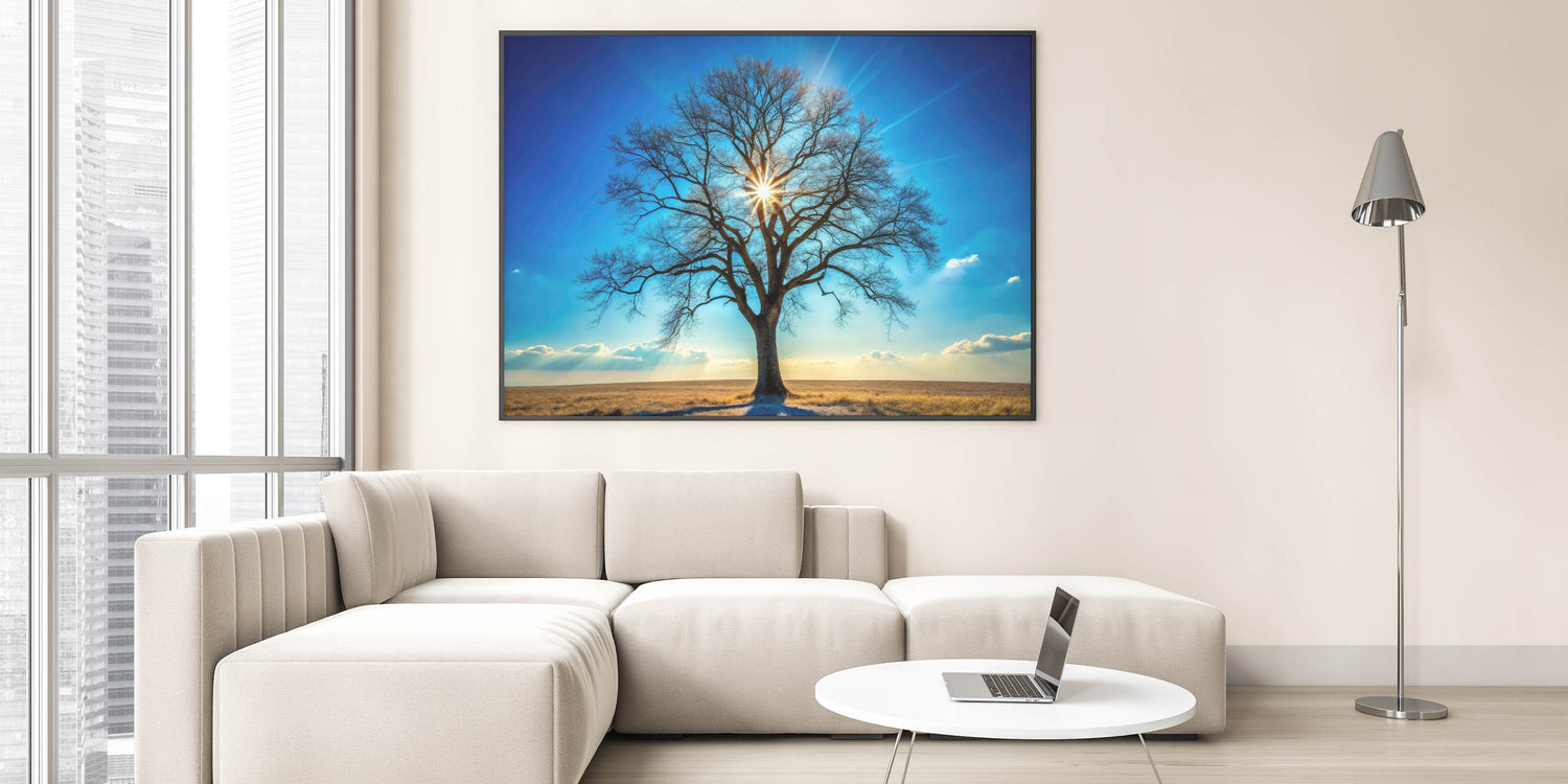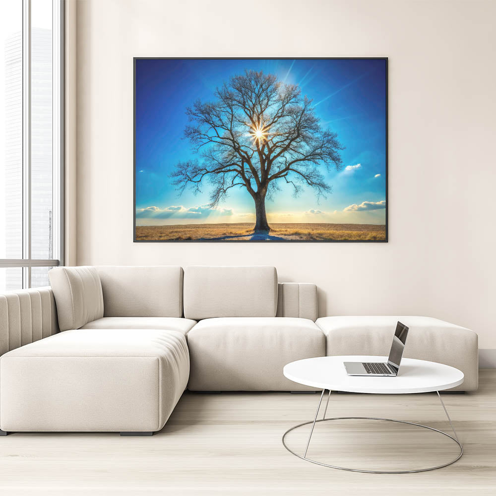 Experience the breathtaking beauty of nature with this fine art photography print featuring a solitary tree standing tall beneath a radiant blue sky. The sunburst effect through its branches adds an ethereal glow, while the golden grass below enhances the contrast, creating a harmonious and captivating scene.