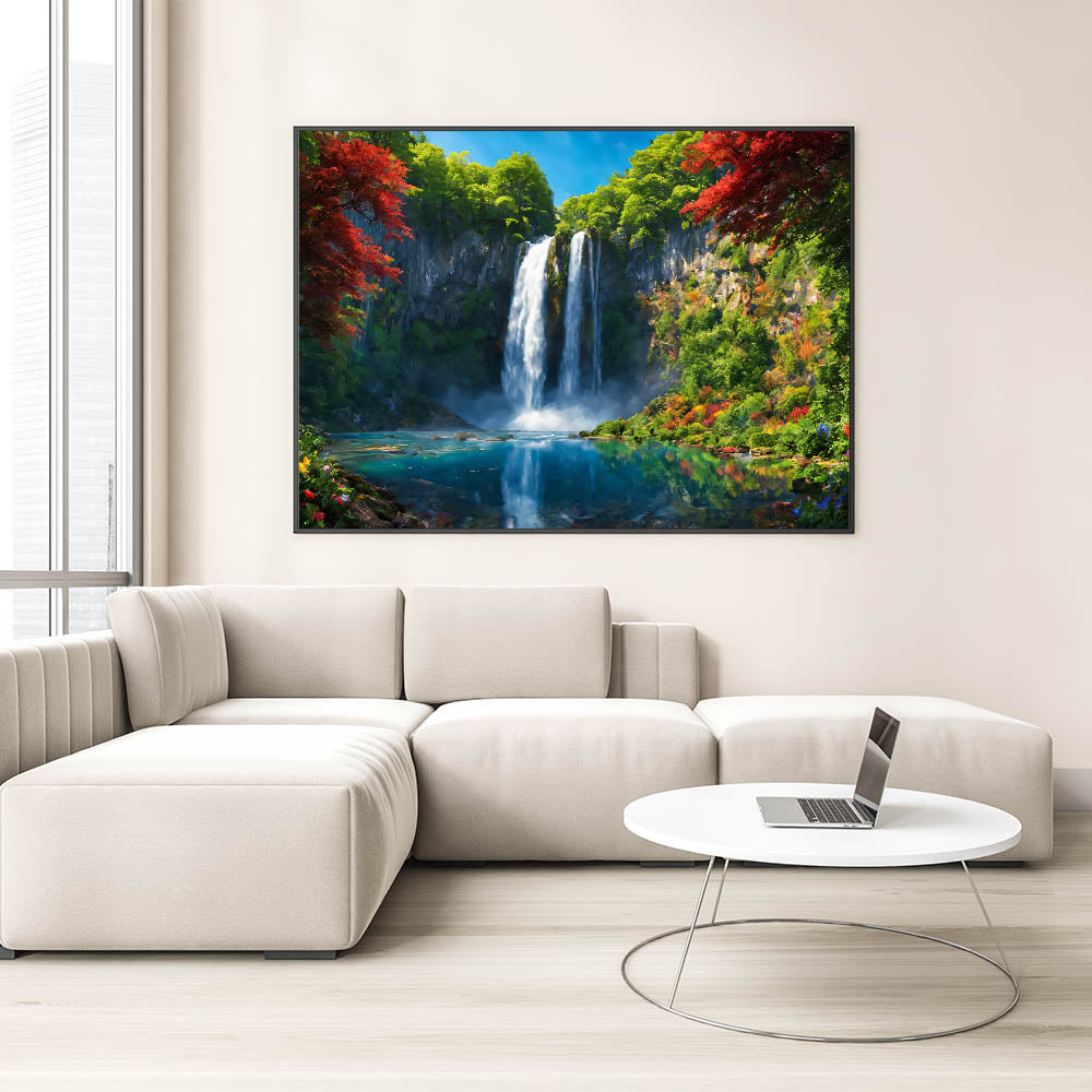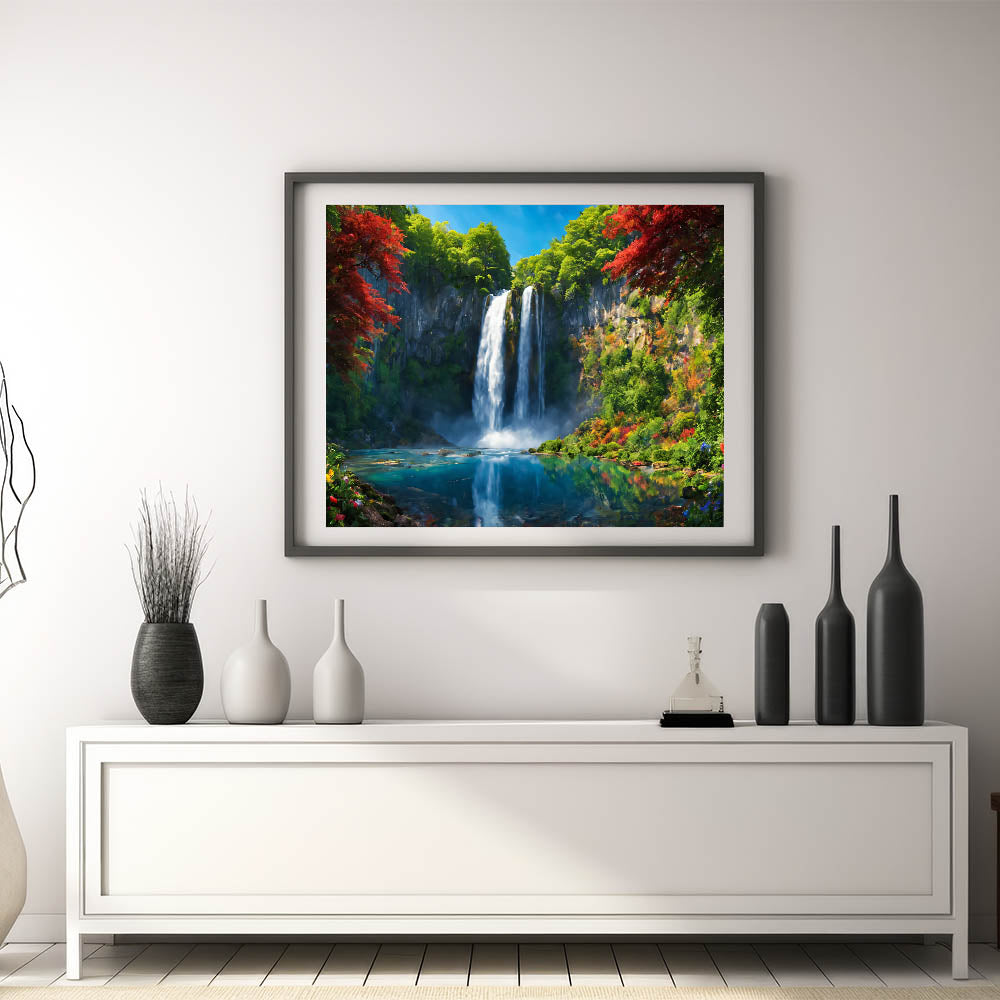 Bring the breathtaking beauty of nature into your home with this Majestic Waterfall Canvas. This stunning artwork captures a lush landscape where a powerful waterfall cascades into a crystal-clear pool, surrounded by vibrant greenery and colorful flowers. The vivid colors and intricate details make this painting a perfect centerpiece for any room, offering a window into the serene and majestic beauty of the natural world.