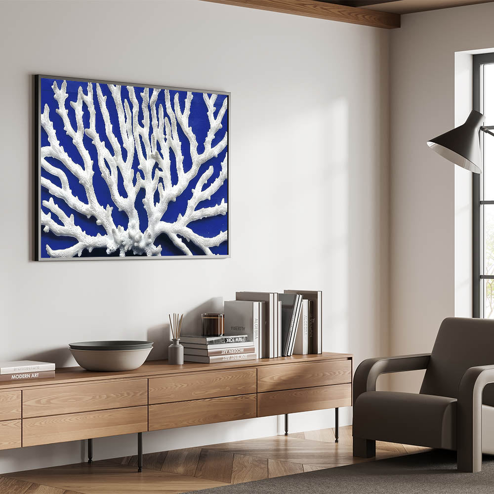 Transform your living space with this stunning marine botanical wall art, featuring a delicate white coral against a vibrant blue backdrop. This piece beautifully captures the serenity of underwater life and brings an elegant coastal touch to any room. Perfect for ocean enthusiasts, this artwork embodies the beauty of marine plants, making it ideal for beach-themed decor.