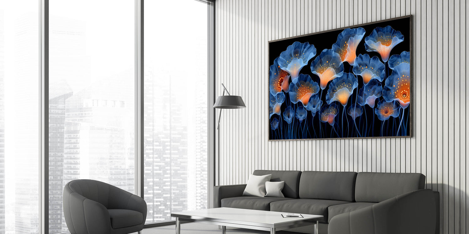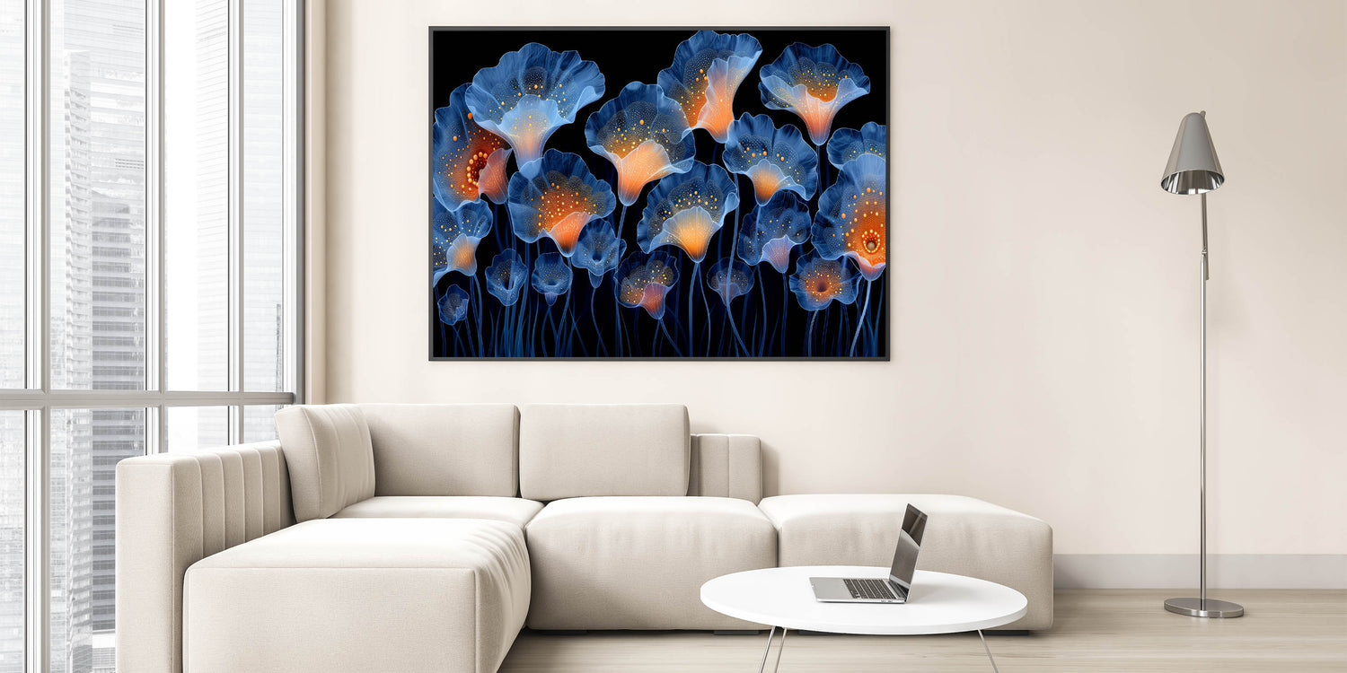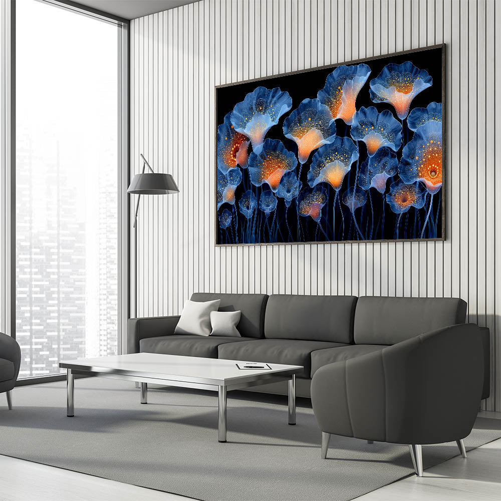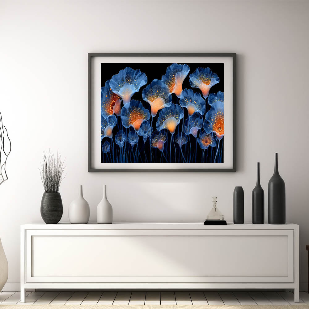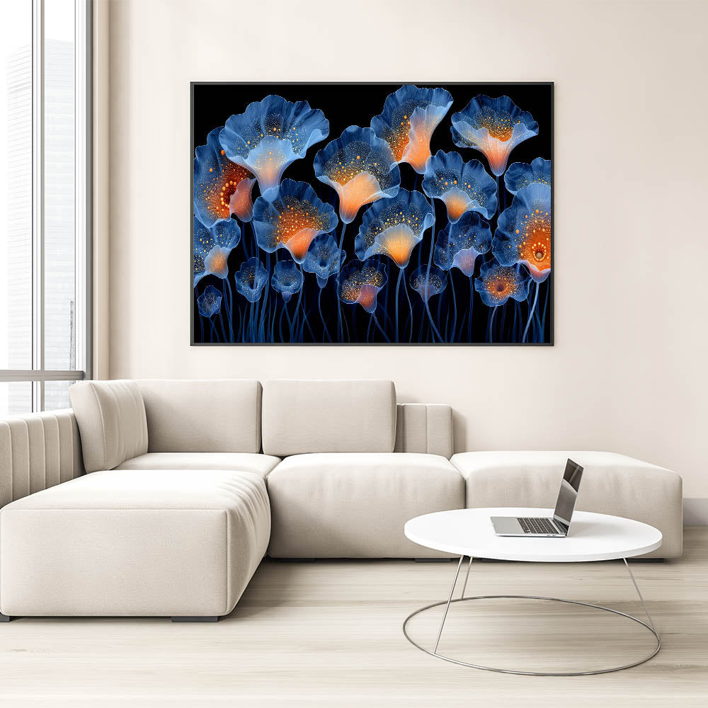 Illuminate your home with the ethereal beauty of this glowing marine botanical wall art. Featuring delicate, translucent blue coral-like plants with vibrant orange centers, this piece creates a striking contrast against a deep black background. The design evokes the mysterious beauty of the ocean’s depths, making it a perfect statement piece for modern and coastal interiors.