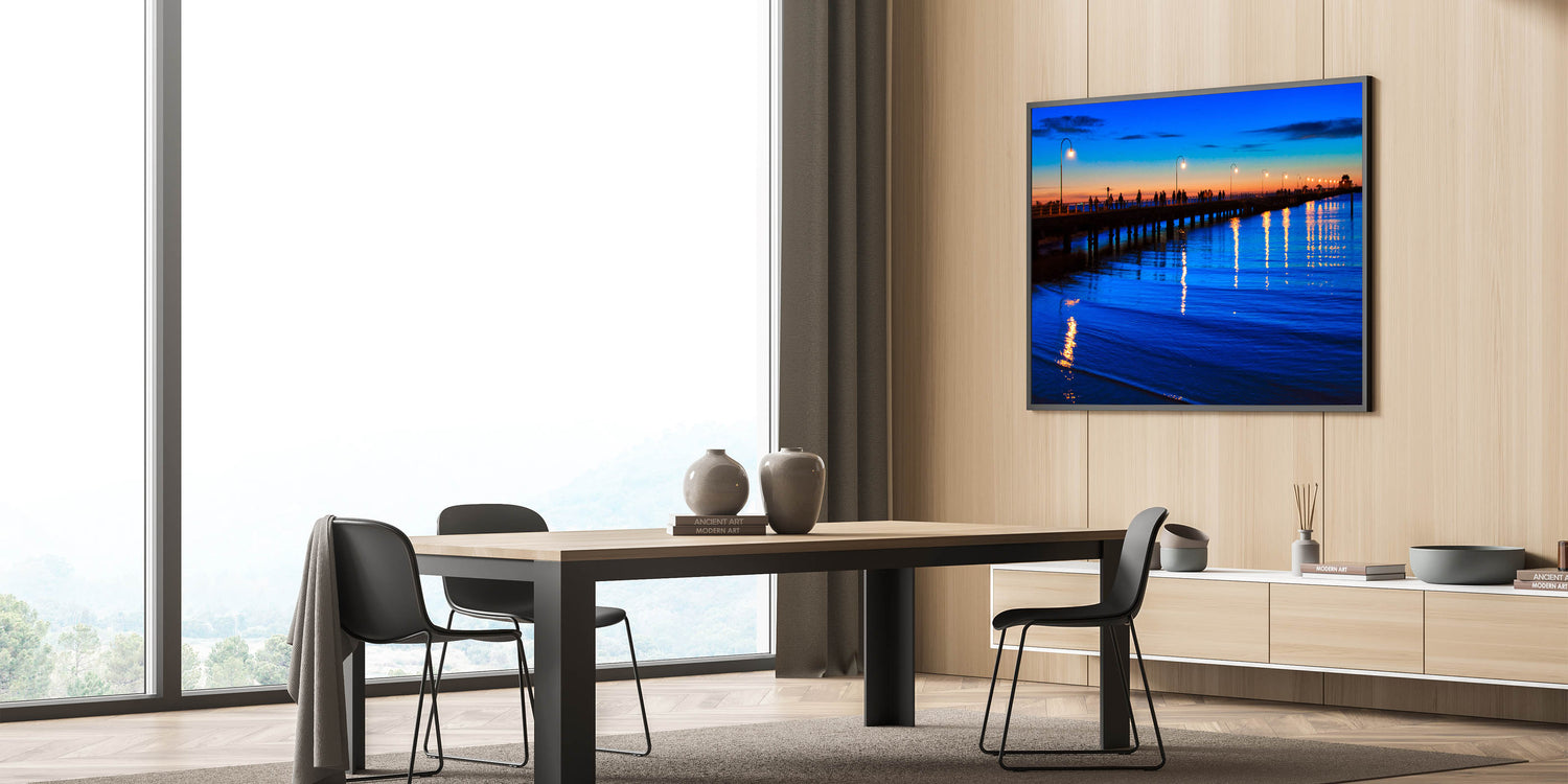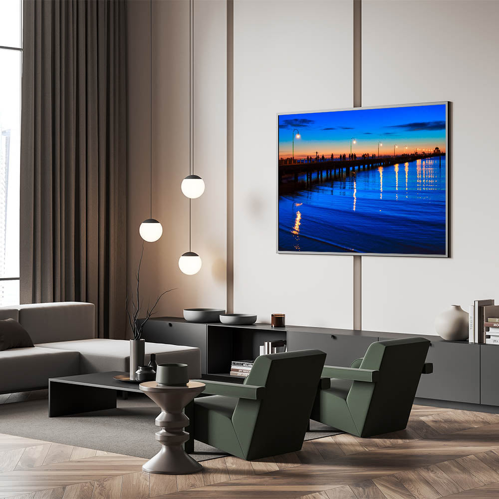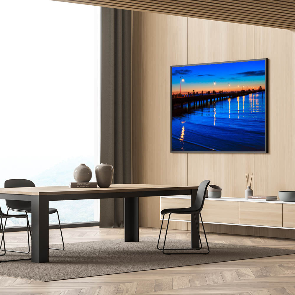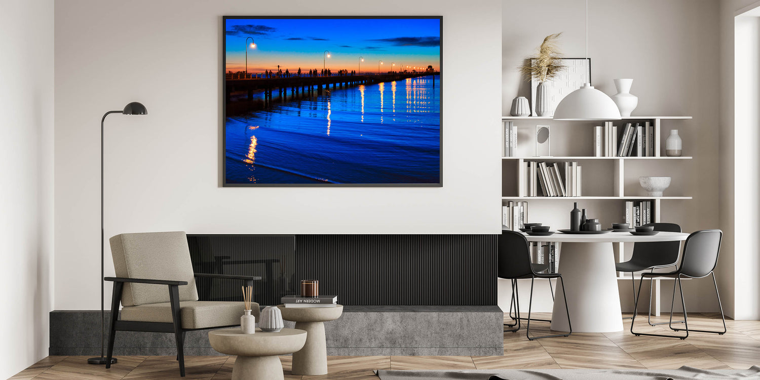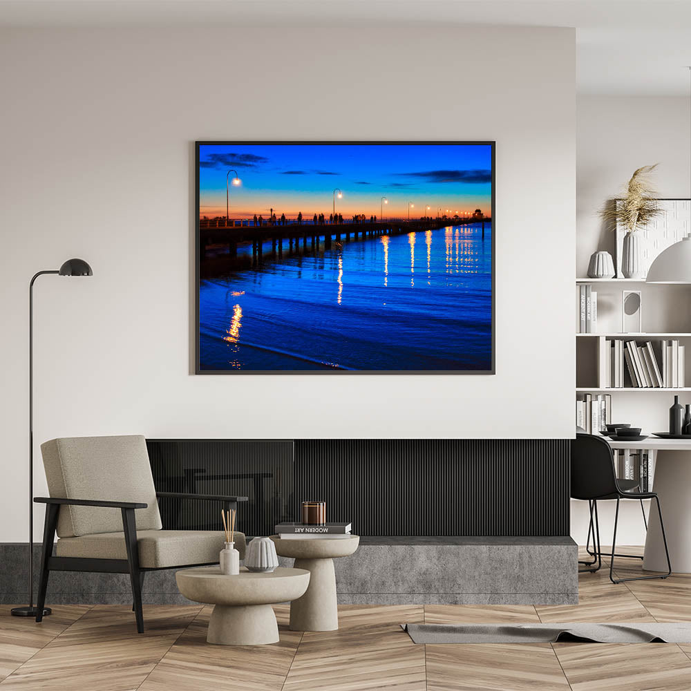 Experience the tranquil beauty of Melbourne’s coastline with this stunning sunset pier wall art. This piece features a beautifully lit pier, with silhouetted figures walking under glowing street lamps as the sun sets on the horizon. The rich blue hues of the water and the vibrant colors of the sky create a calming and serene atmosphere, making it perfect for any space where you want to introduce a sense of peace and reflection.