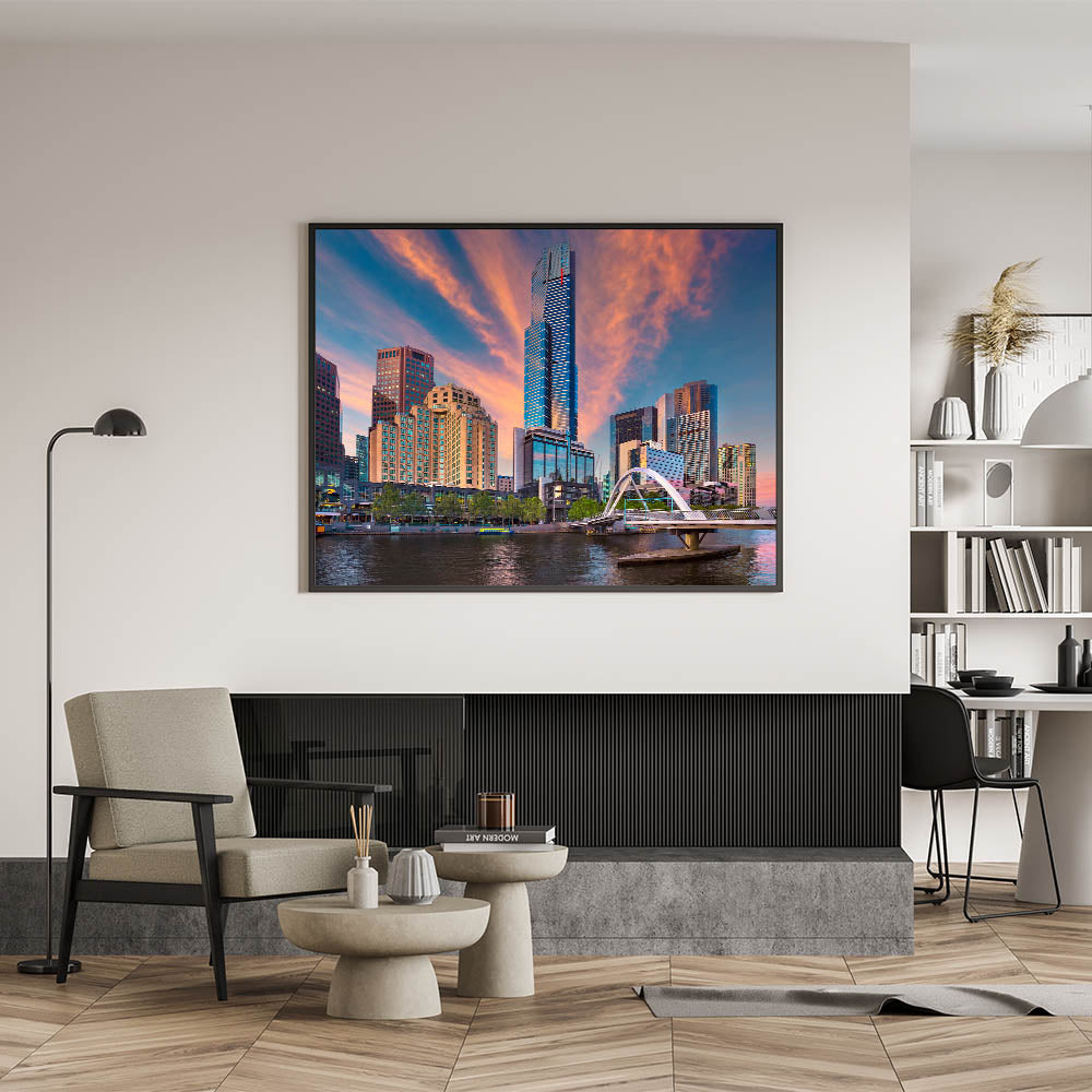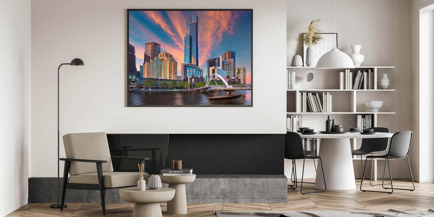Capture the stunning beauty of Melbourne at sunset with this striking wall art. Featuring the iconic city skyline, this artwork highlights the towering skyscrapers against a dramatic sky filled with pink and orange hues. The serene waters of the Yarra River reflect the colorful sky and modern architecture, making this piece a perfect addition to any urban decor lover's collection. Whether you're a fan of modern cityscapes or the charm of Melbourne, this canvas print brings the essence of the city into your home.