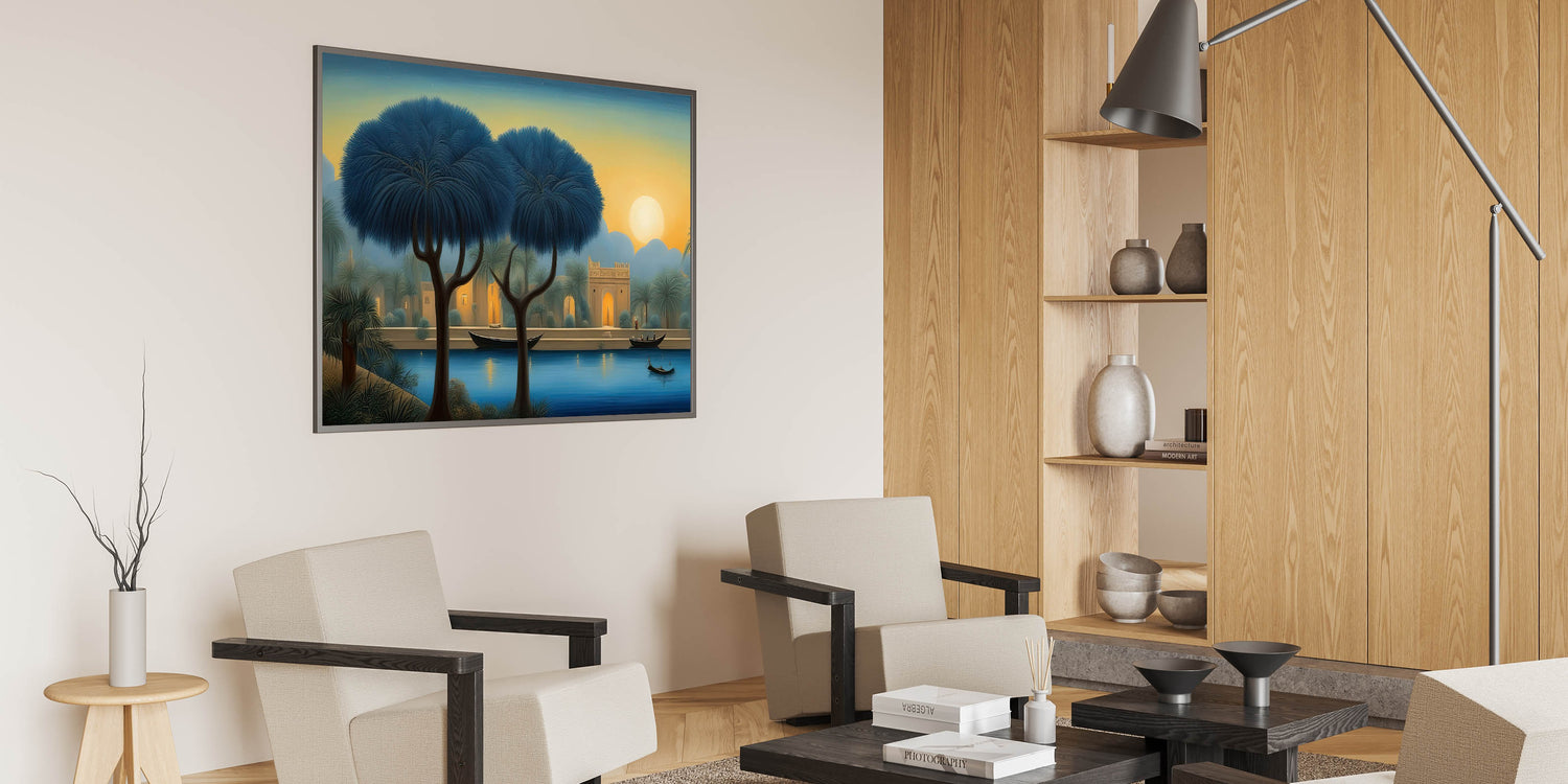 Embrace the serene beauty of the Mesopotamian landscape with this stunning Mesopotamian River at Dusk wall art. The tranquil scene features tall, elegant trees lining a calm river as the sun sets, casting a soft golden glow over the sky. The warm lights from the distant buildings add a magical touch, creating a perfect blend of natural beauty and architectural charm. This artwork captures the timeless elegance of Iraq’s riverside life and brings the peaceful atmosphere of a Middle Eastern evening into your home.