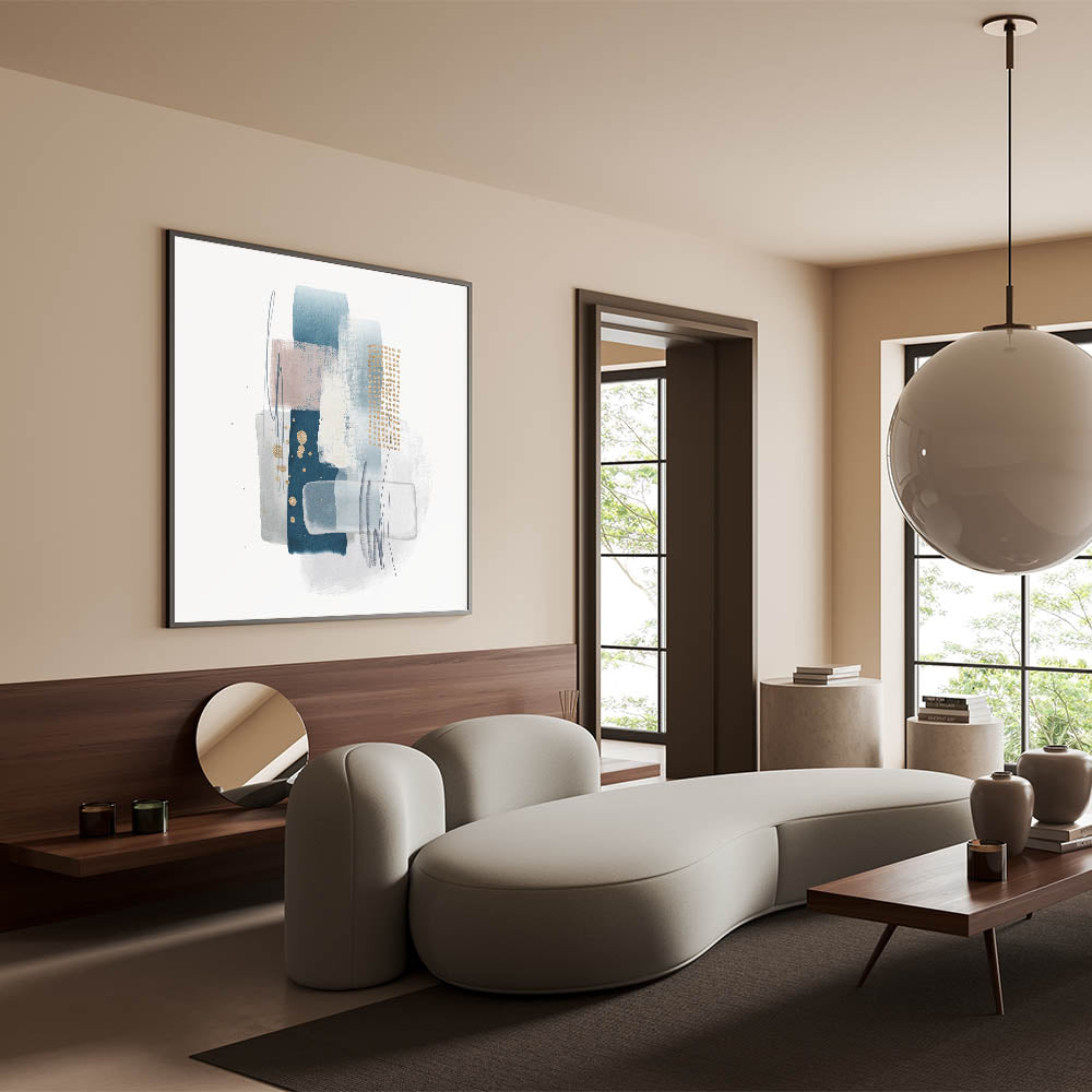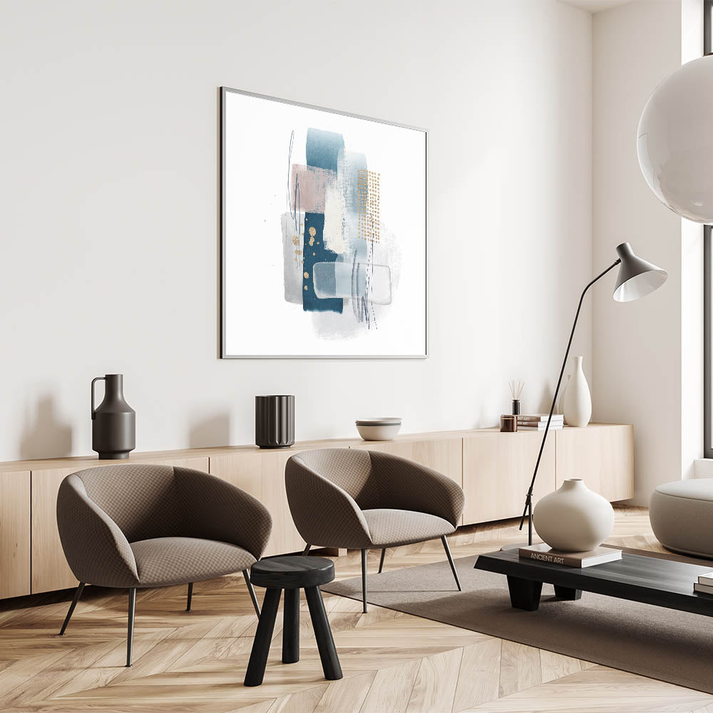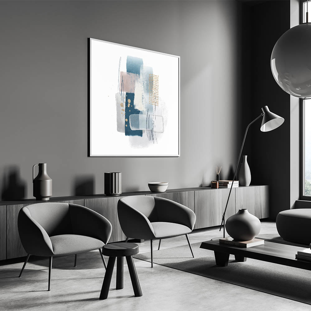 Cool, modern, and effortlessly elegant, this artwork embodies the essence of minimalist abstract canvas prints. With layered shades of navy, muted blue, soft gray, cream, and subtle blush, this piece brings a serene, sophisticated look to your walls. Gold detailing and sketch-style lines add texture and visual interest, making it a standout in our Geometric Minimalist Abstract Wall Art series.