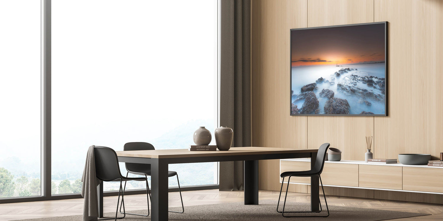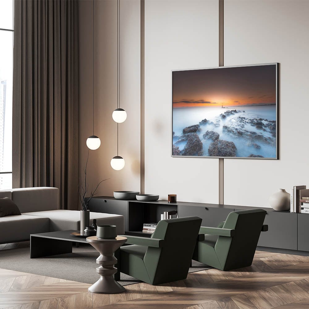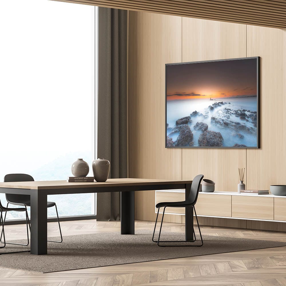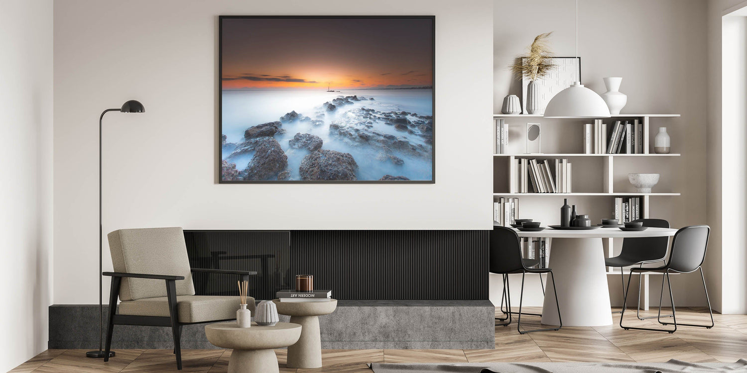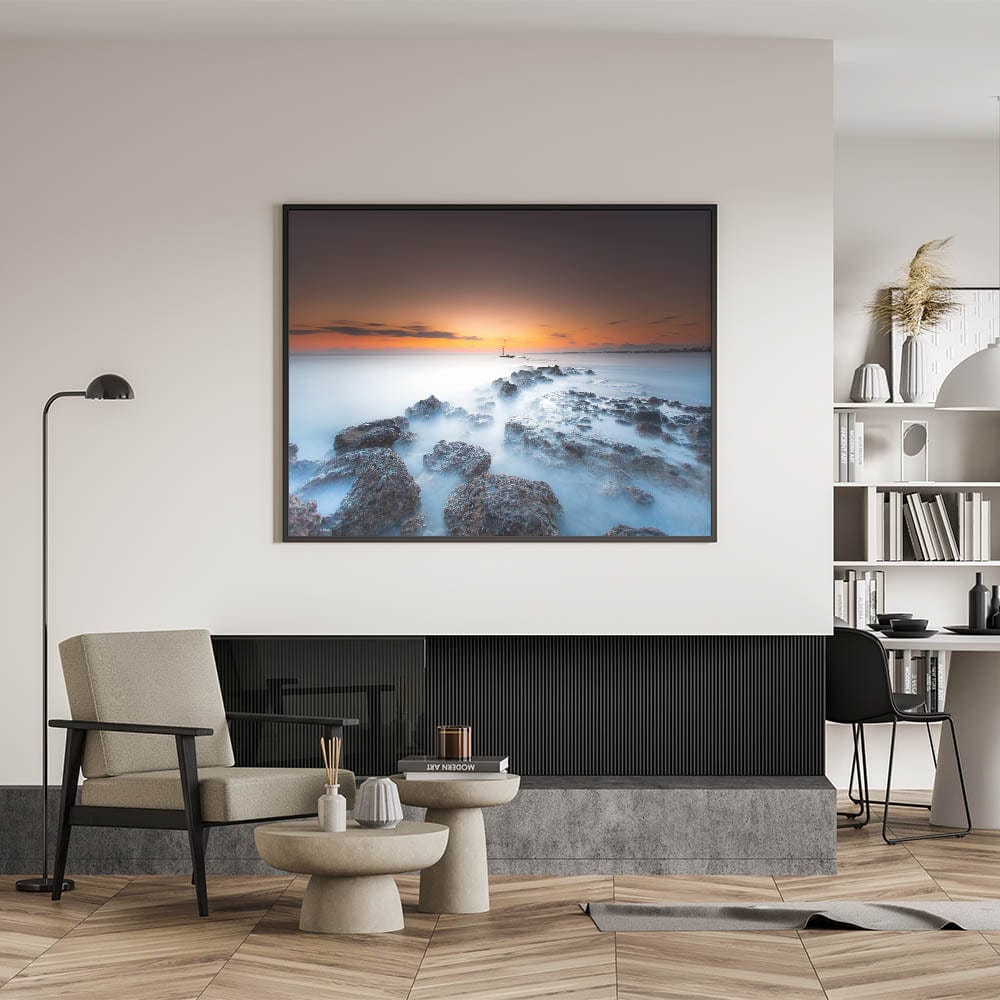 Step into a moment of stillness with this Minimalist Coastal Landscape Art, showcasing glowing sunset light cascading over a quiet, rocky shoreline. The ethereal mist across the sea, paired with soft orange and deep blue hues, offers a peaceful yet dramatic visual—perfect for interiors seeking calm and natural elegance.
