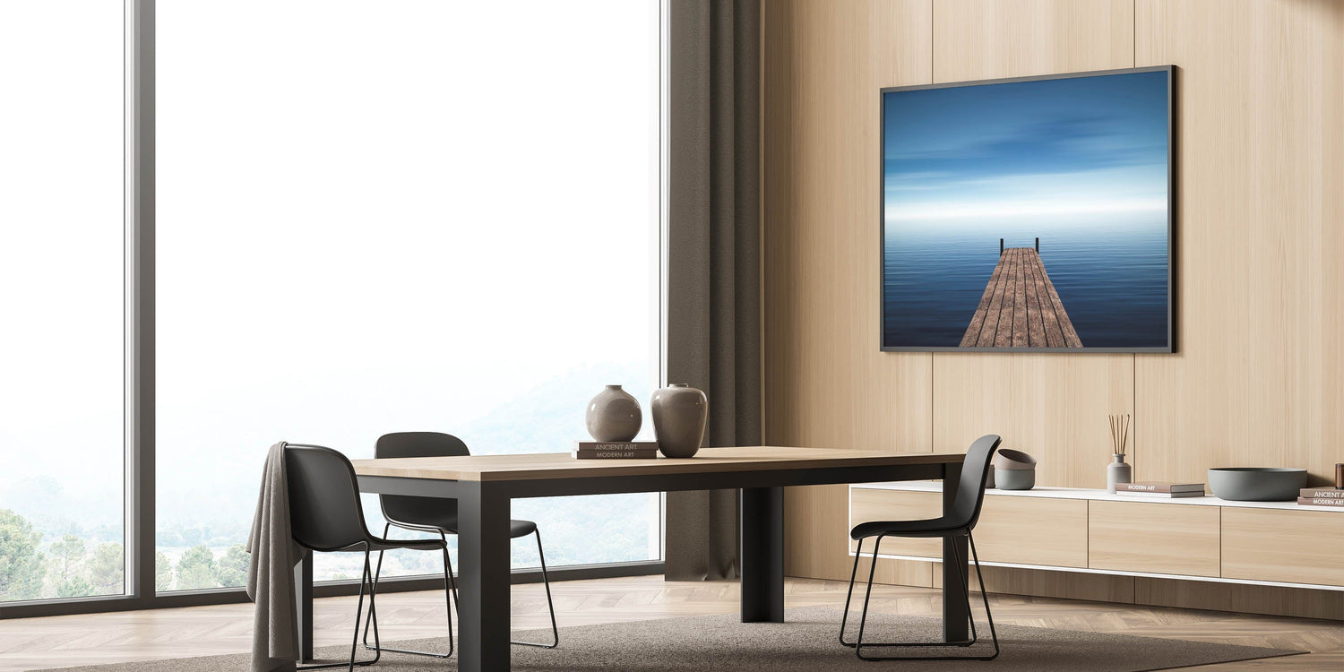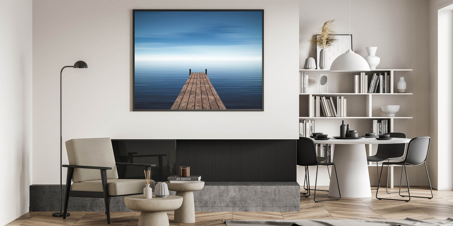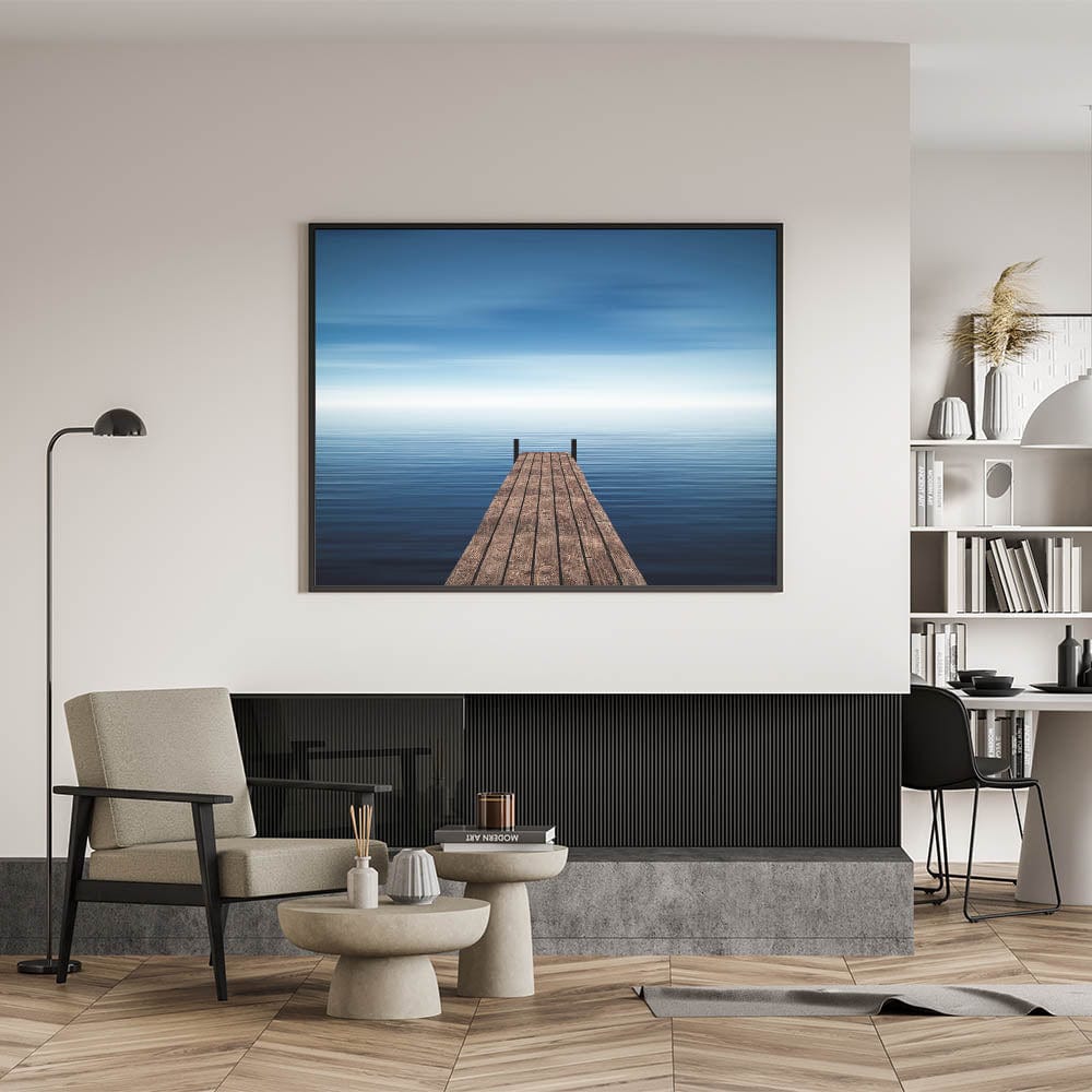 Invite serenity and space into your home with this Minimalist Coastal Landscape Art, featuring a solitary wooden pier stretching into endless blue water. The stillness of the sea and soft gradient sky evoke calm, introspection, and quiet freedom, making this piece a timeless addition to any minimalist or coastal-inspired interior.
