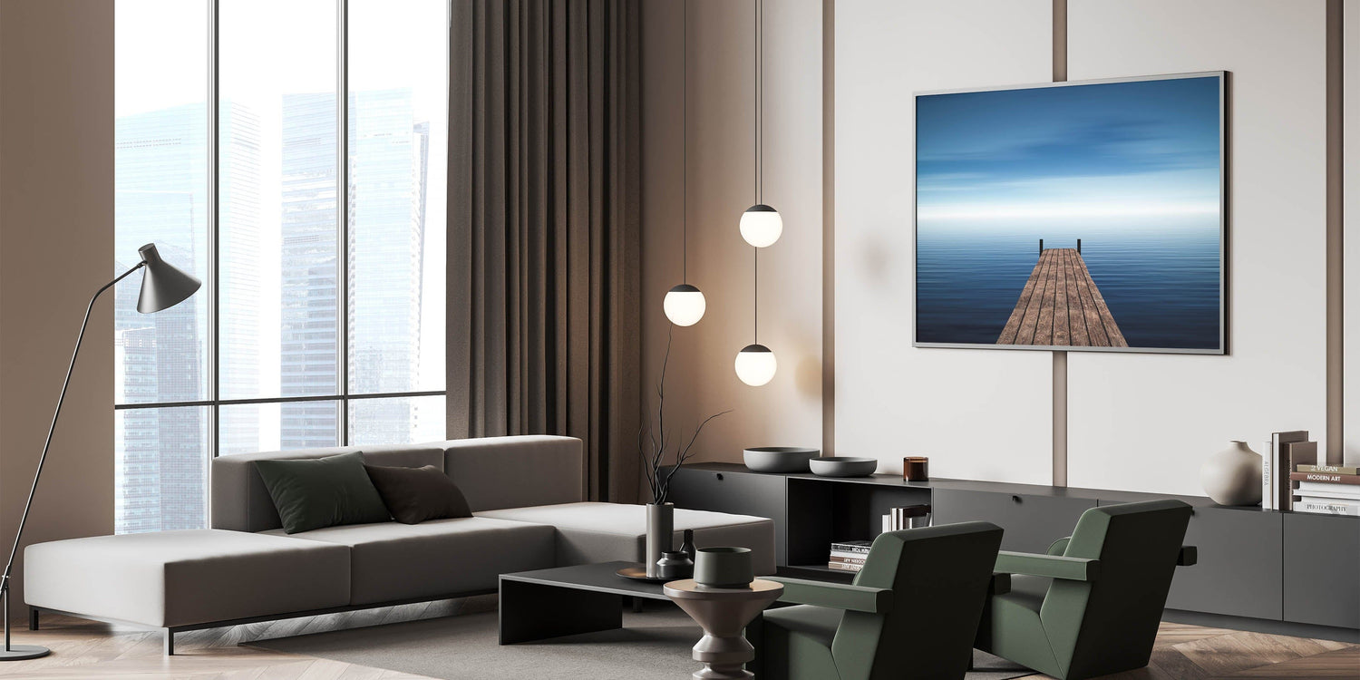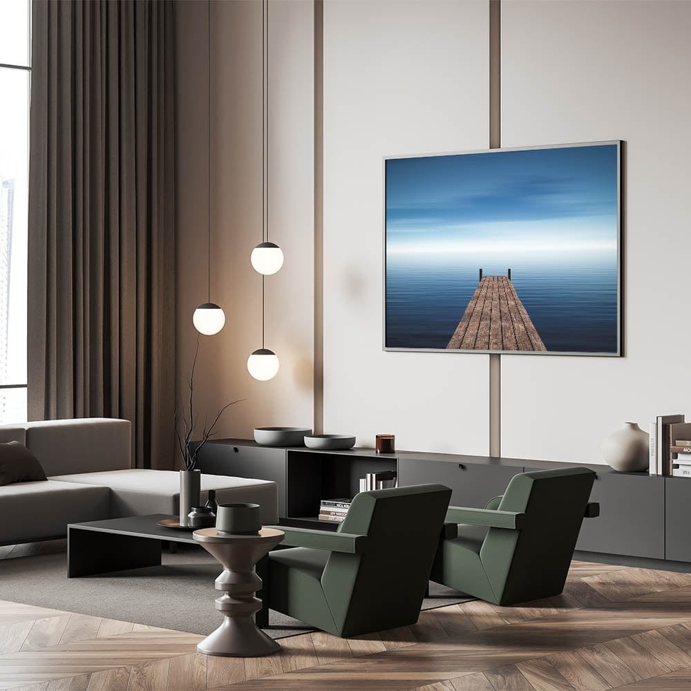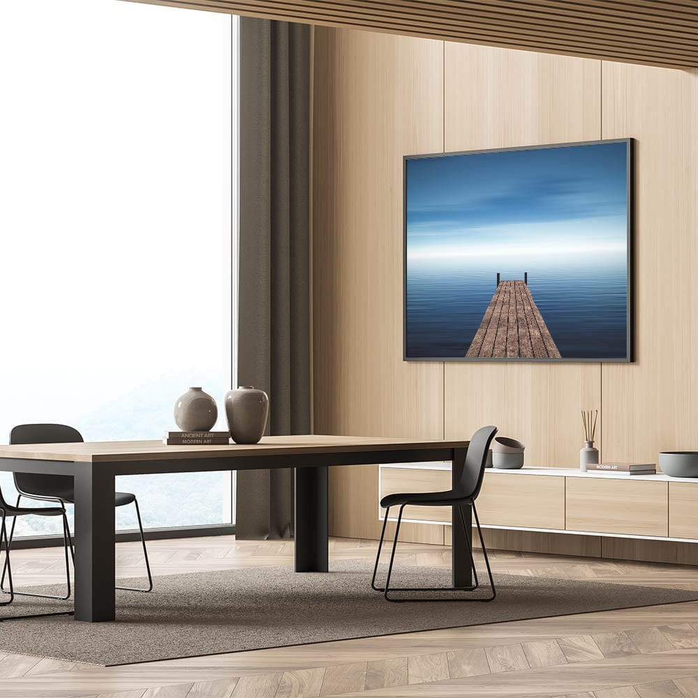 Invite serenity and space into your home with this Minimalist Coastal Landscape Art, featuring a solitary wooden pier stretching into endless blue water. The stillness of the sea and soft gradient sky evoke calm, introspection, and quiet freedom, making this piece a timeless addition to any minimalist or coastal-inspired interior.