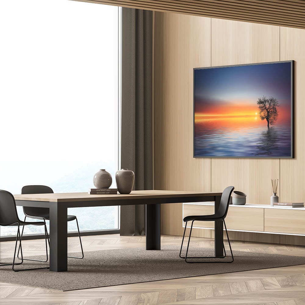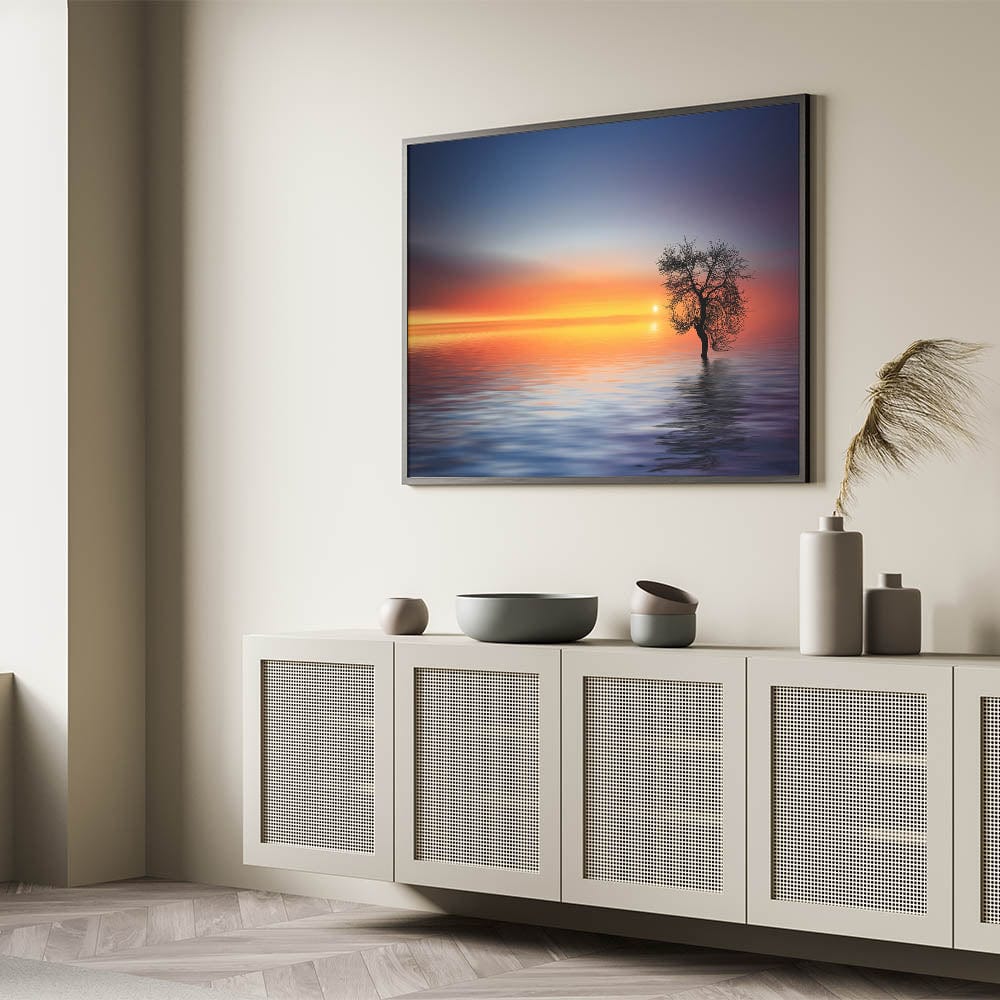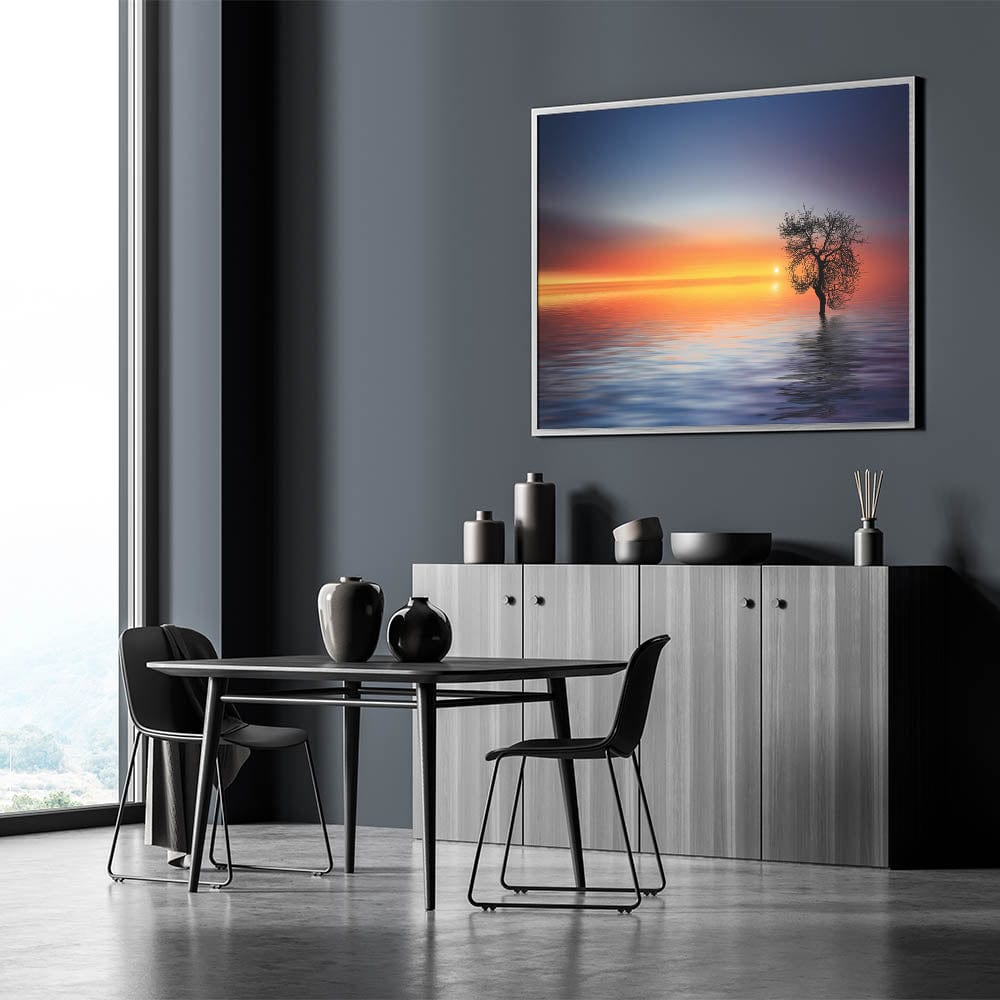 Infuse your interior with warmth and stillness through this dramatic Minimalist Landscape Artwork, showcasing a lone tree silhouetted against a brilliant sunset sky. Reflected in soft, rippling water, the scene transitions from deep navy and violet to fiery orange and gold, delivering both color and calm. Perfect for fans of Modern Minimalist Landscape Prints, this piece makes an instant statement.