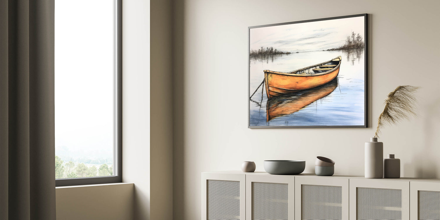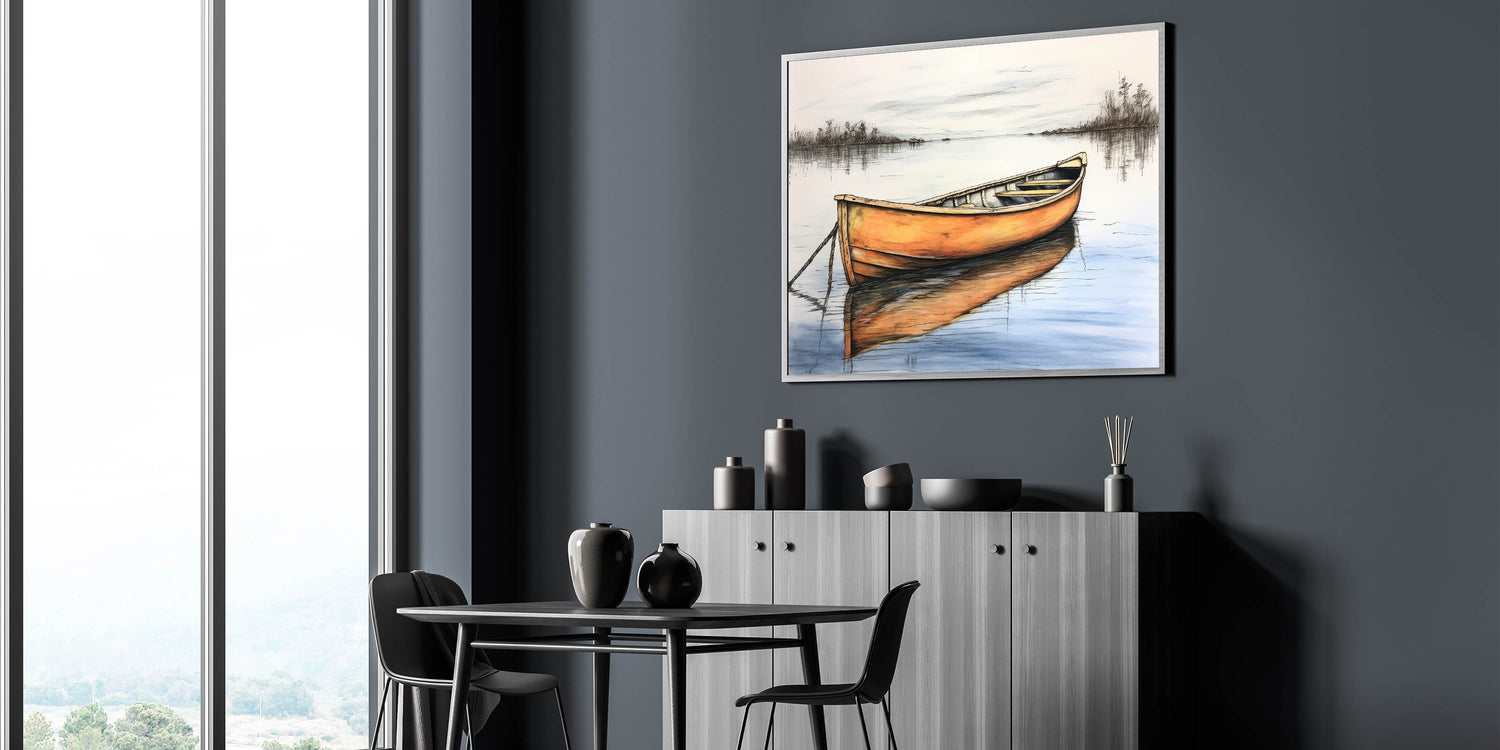 Embrace the beauty of simplicity with this minimalist rowboat wall art. This captivating piece features a lone wooden rowboat gently tethered on still waters, surrounded by a calm and serene environment. The clean lines and subtle color palette create a peaceful atmosphere, making this artwork a perfect addition to any space seeking tranquility and elegance. Ideal for contemporary or coastal-themed interiors, this handcrafted boat art is available in a variety of high-quality materials, including Stretched Canvas, Framed Canvas, Acrylic Glass, Framed Acrylic Glass, Framed Print, Rolled Canvas, and Rolled Print.