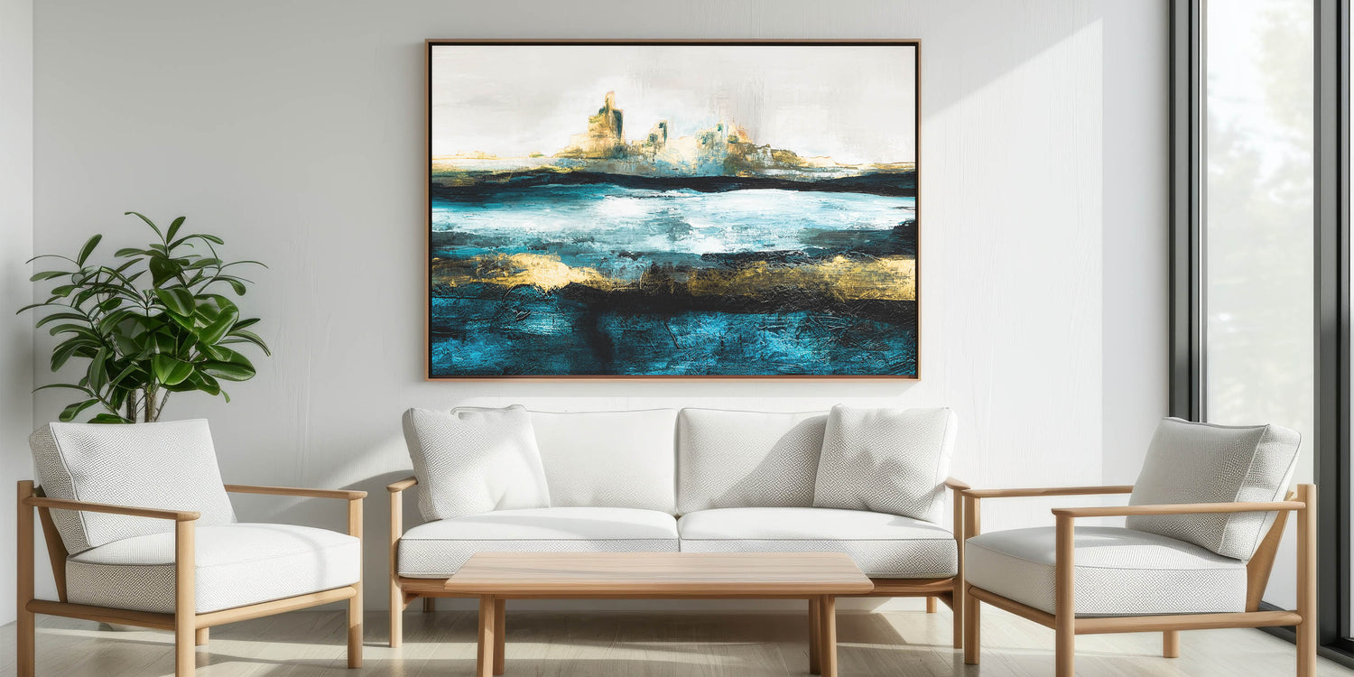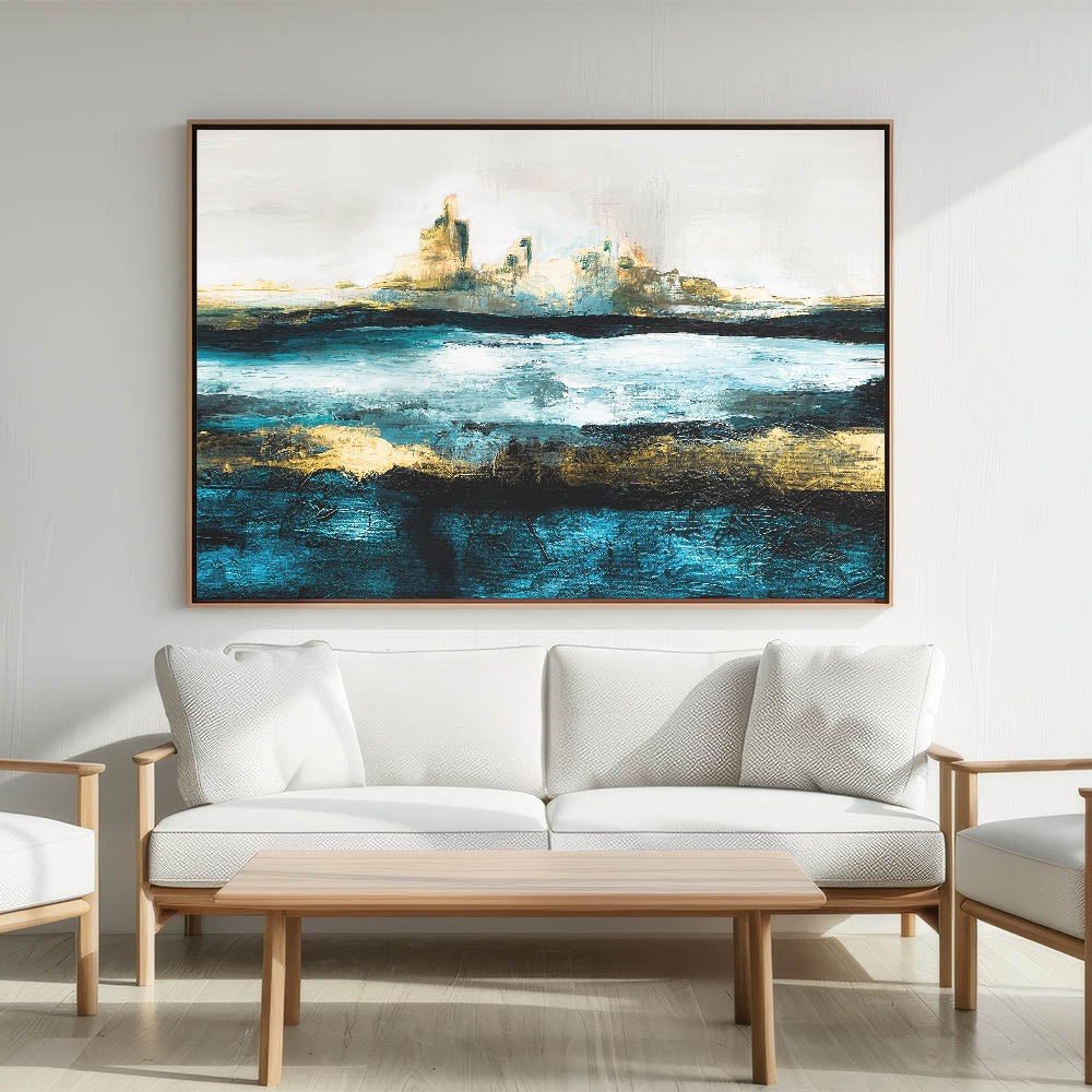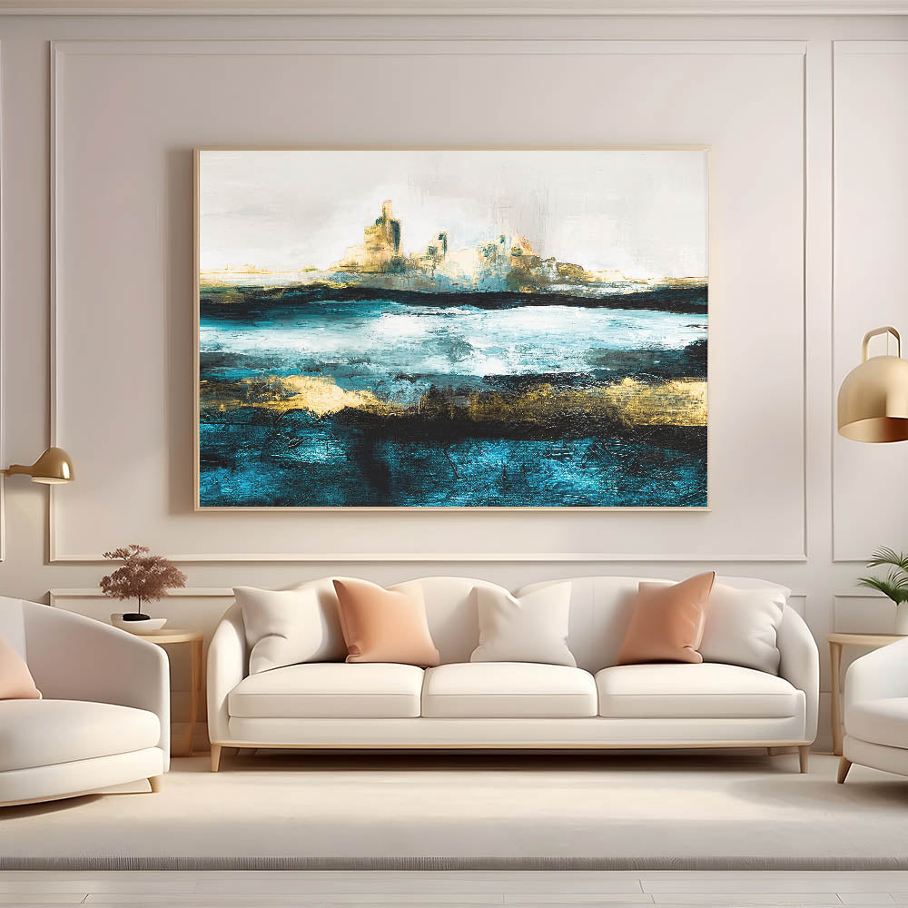 Introduce a stunning piece of abstract landscape art that beautifully captures the essence of natural scenery through bold textures and vibrant colors. This "Modern Landscape Abstract" wall art showcases a unique combination of deep blues, golden hues, and soft white tones, creating a captivating and contemporary representation of nature's beauty.