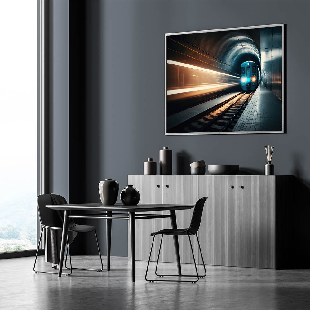 Immerse yourself in the energy of city life with this Modern Subway Speed Wall Art. This striking piece captures the motion and speed of a subway train racing through a tunnel, with vivid blue and warm orange lights contrasting against the dark, industrial surroundings. Perfect for urban spaces, this artwork brings a sense of dynamism and modernity to any room.