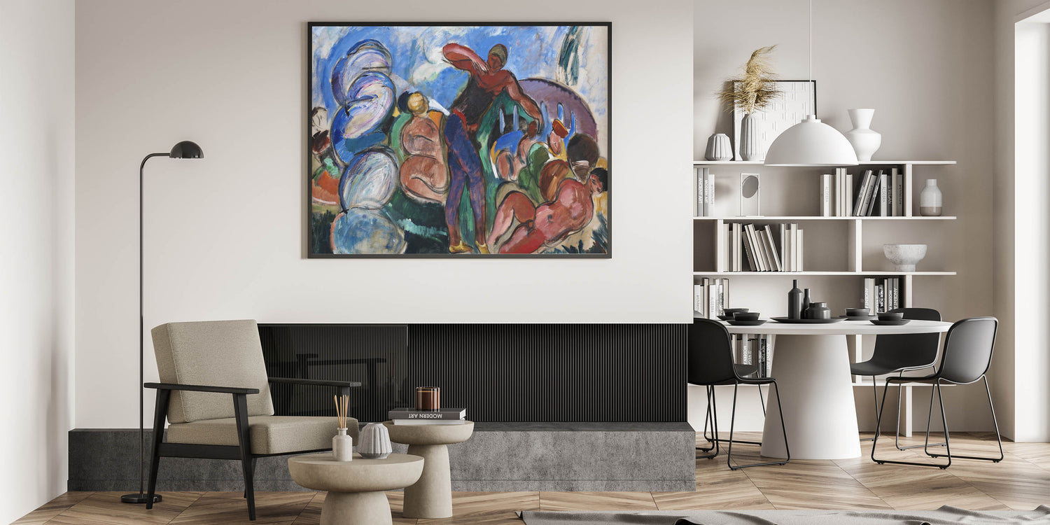 Infuse energy and vibrancy into your space with this Modern Wall Art piece, a bold and expressive composition by Jens Adolf Jerichau. This artwork captures dynamic figures in motion, brought to life through intense shades of blue, red, and earthy greens. Perfect for those who appreciate Contemporary Art Pieces that convey movement and emotion, this Abstract Modern Art piece makes a striking addition to any room.
