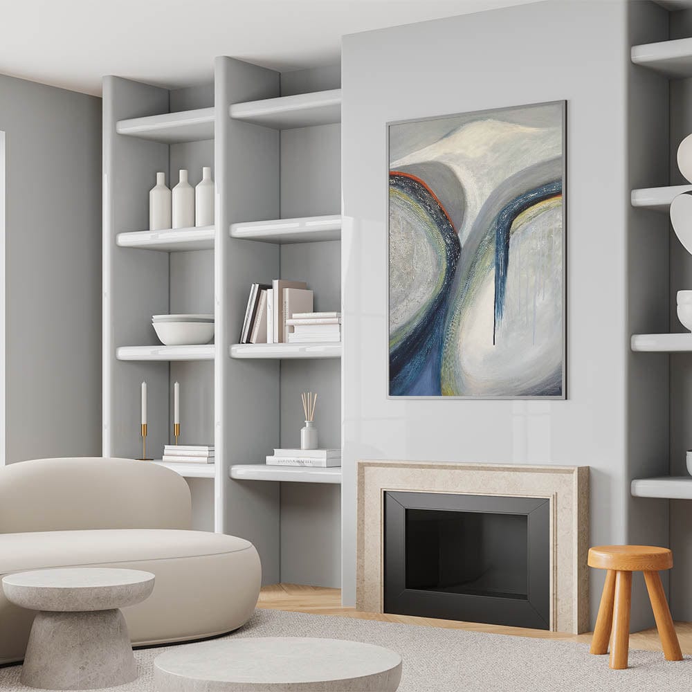 Enhance your space with this moody modern wall art, a captivating blend of gray, deep blue, and soft white with hints of orange. The fluid, layered composition evokes a sense of movement and elegance, making it an eye-catching addition to any contemporary setting. This abstract canvas wall art is perfect for those who appreciate refined, modern aesthetics.