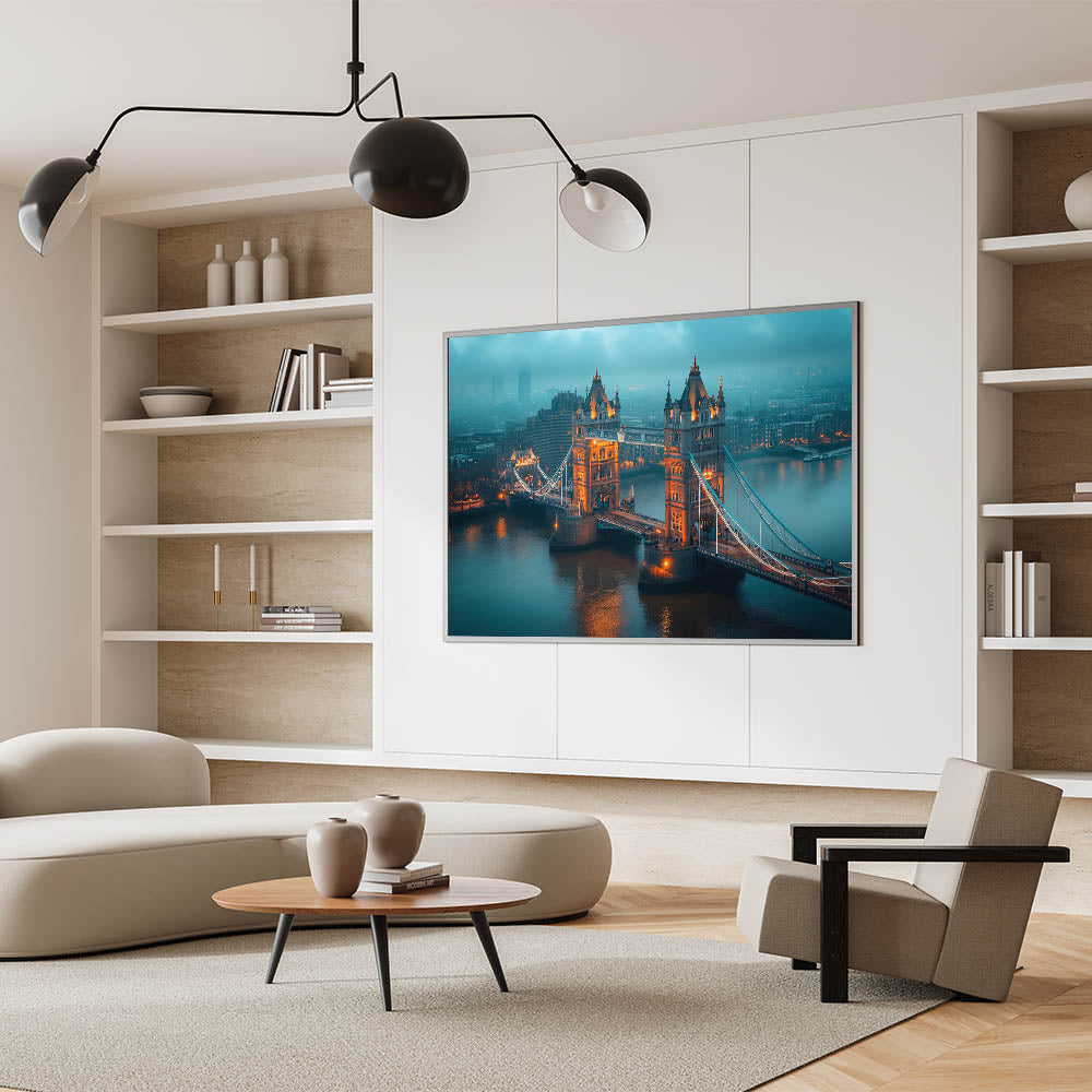 Bring the mysterious allure of London into your space with this atmospheric wall art featuring the Tower Bridge shrouded in early morning mist. The warm lights of the bridge pierce through the fog, creating a stunning contrast against the cool, muted tones of the city. This piece perfectly captures the moody and iconic essence of London at dawn, making it a captivating addition to any home or office decor.