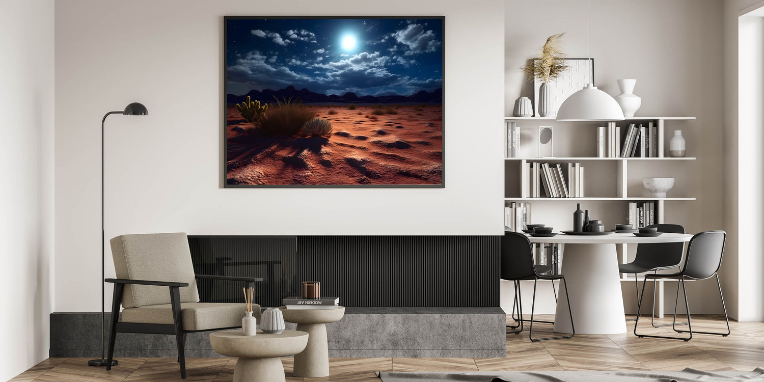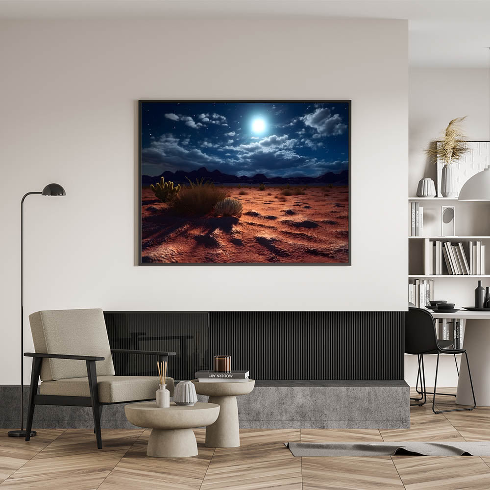 Step into the mysterious allure of the desert at night with this enchanting wall art, featuring a moonlit landscape that captures the serene beauty of the desert under a starlit sky. The soft glow of the moon casts gentle shadows across the desert floor, highlighting the delicate plants and rugged terrain in a mesmerizing play of light and shadow. This artwork is perfect for adding a touch of calm and mystery to any room.