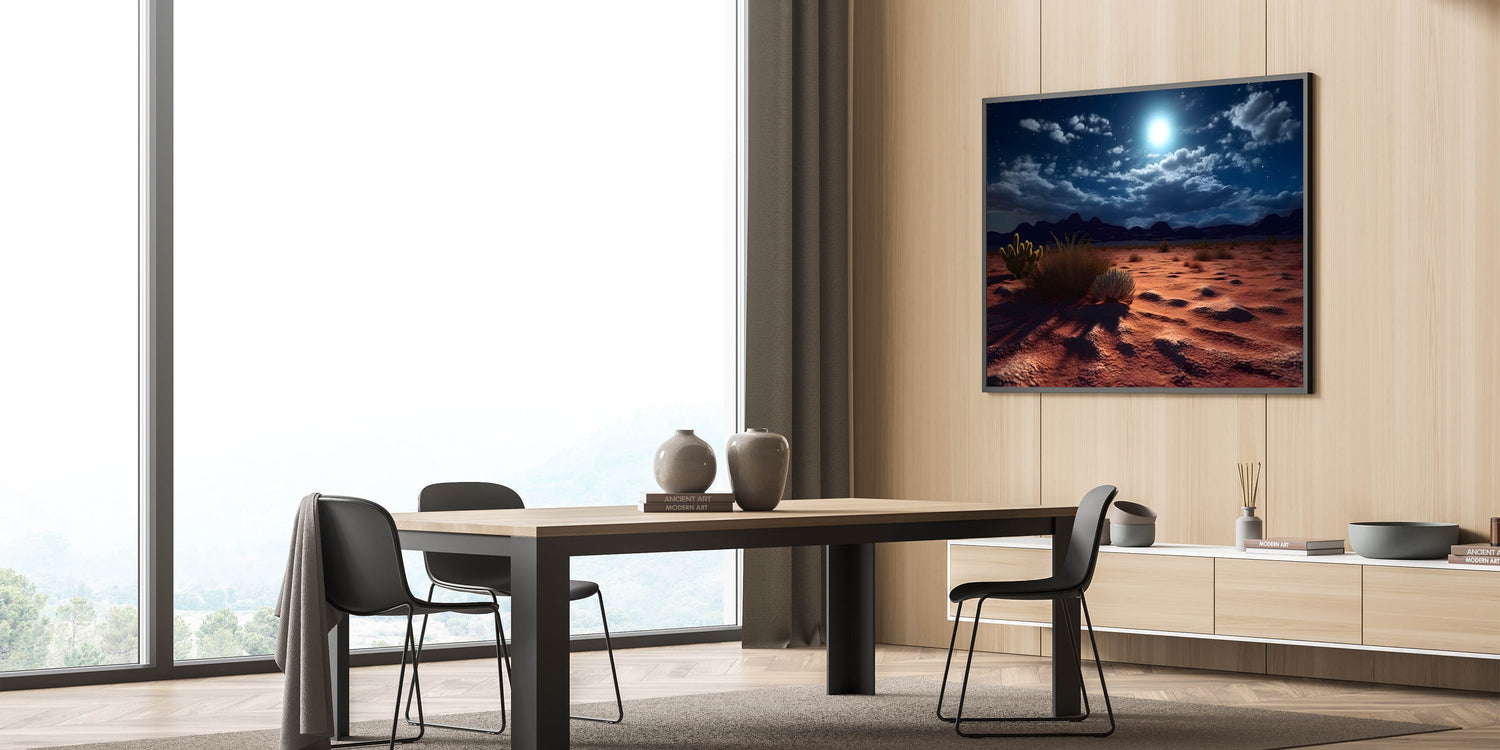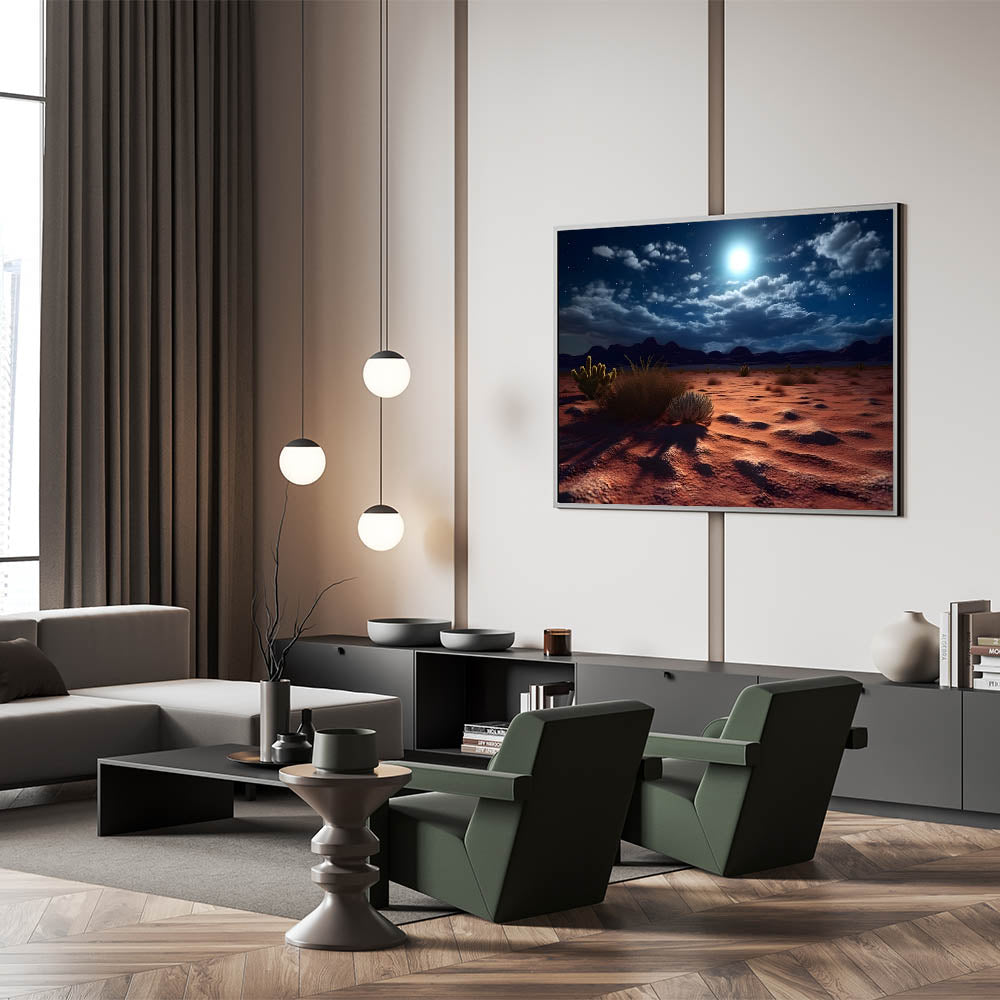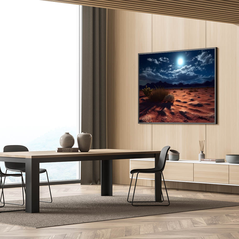 Transform your home with this captivating piece of moonlit desert wall art. Whether displayed in a bedroom, living room, or office, this artwork will infuse your space with the tranquil beauty of a desert night. Don’t miss the opportunity to add this stunning representation of the desert’s nighttime magic to your collection.