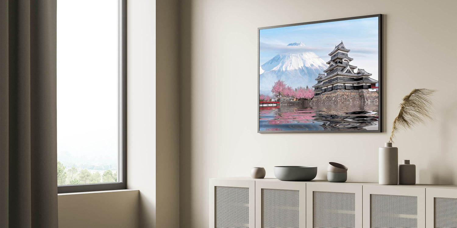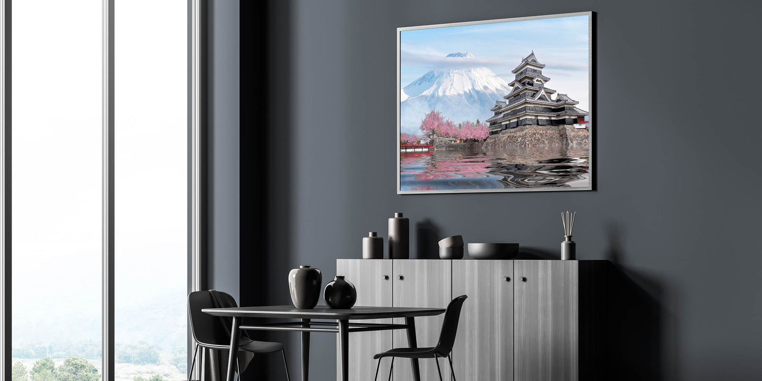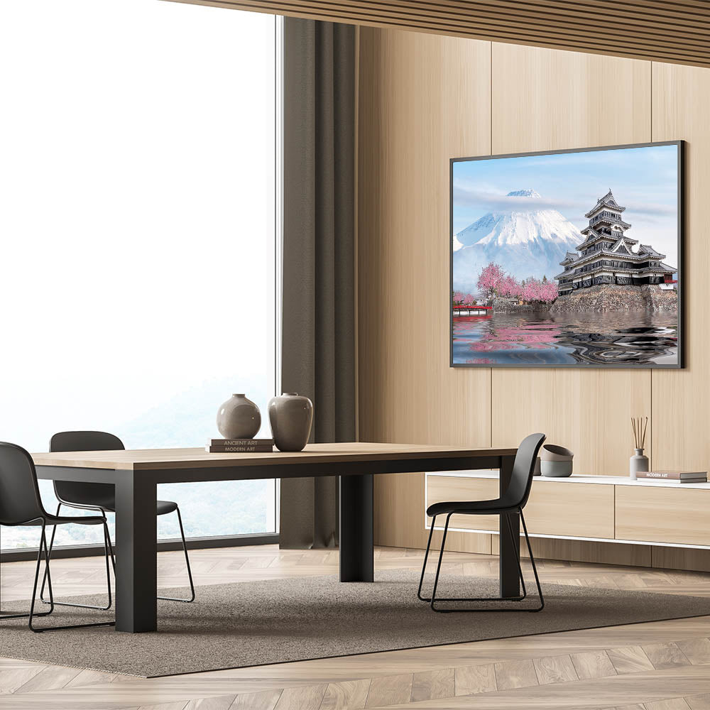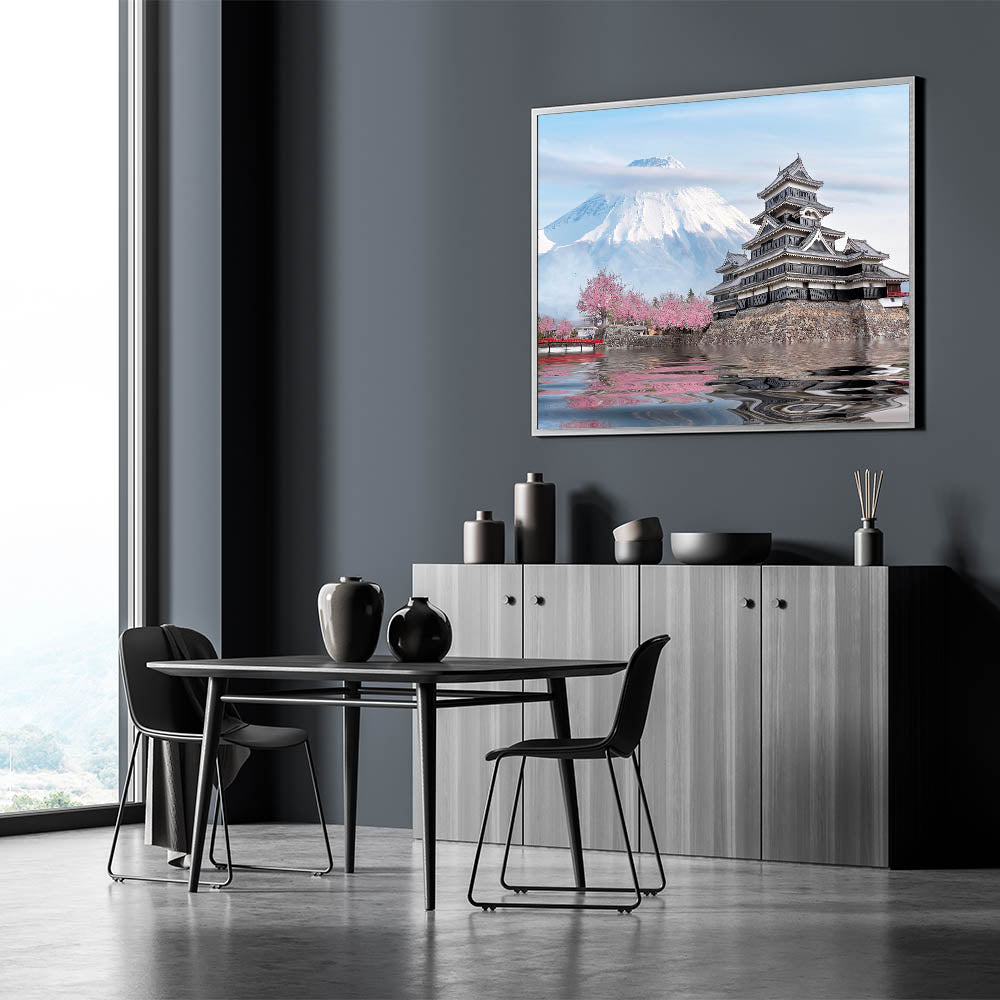 - High-quality Japanese castle and Mount Fuji landscape canvas print available in stretched canvas, framed canvas, and acrylic glass.