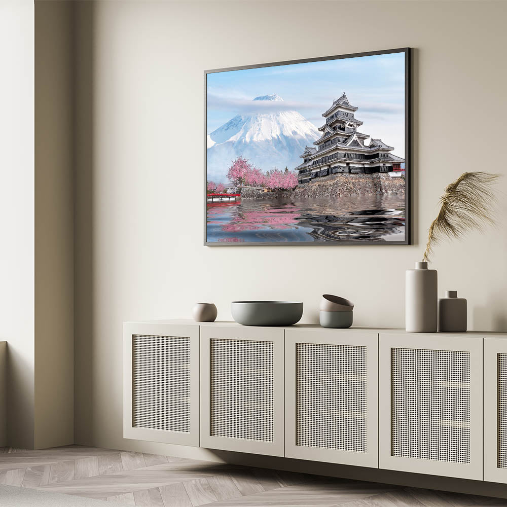 This artwork is perfect for anyone who appreciates Japan’s architectural heritage and natural beauty, bringing the serenity of Mount Fuji and the grace of cherry blossoms into your home.