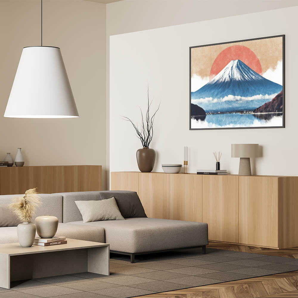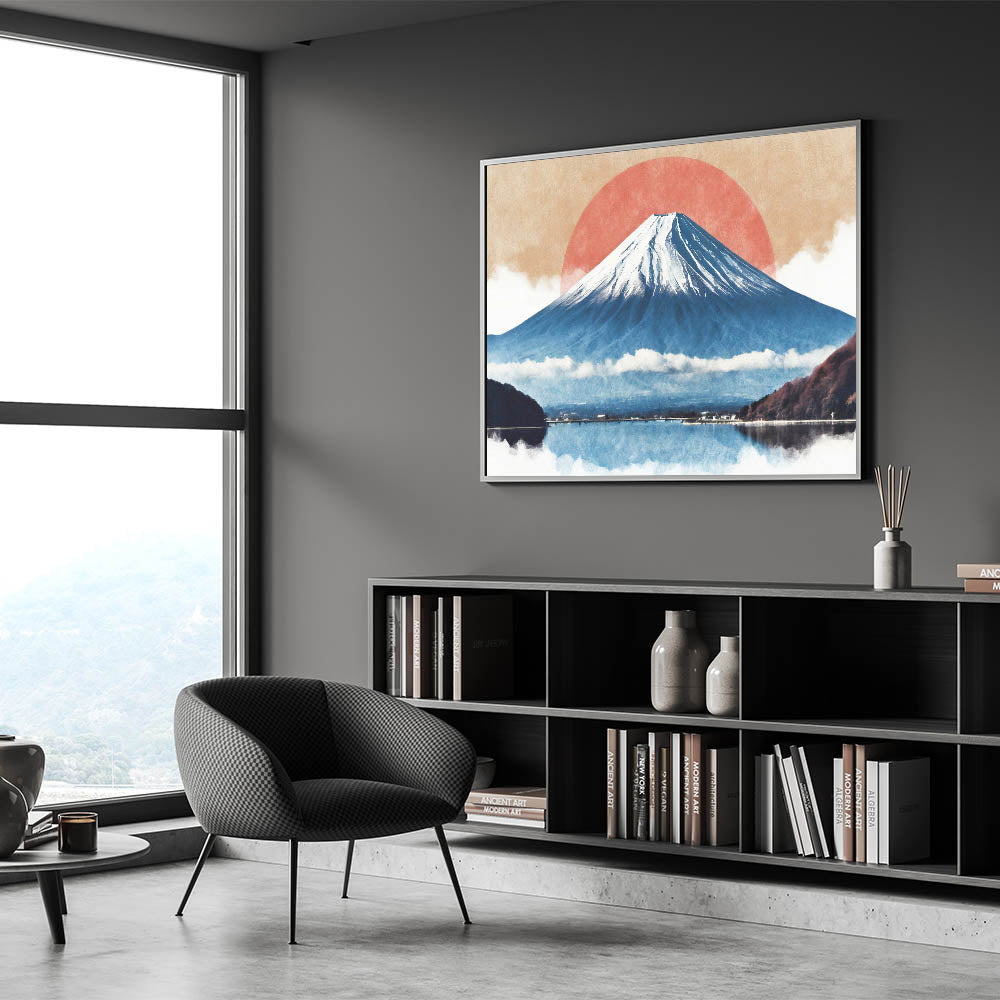 Add a touch of minimalist elegance to your home with this stunning Mount Fuji artwork, featuring the iconic mountain framed by a glowing sunrise. The simplicity of the design, combined with rich colors and sharp contrasts, makes this piece perfect for lovers of Japanese scenic art. Whether you're looking to enhance your living room, office, or bedroom, this artwork will bring a sense of tranquility and beauty to your space.