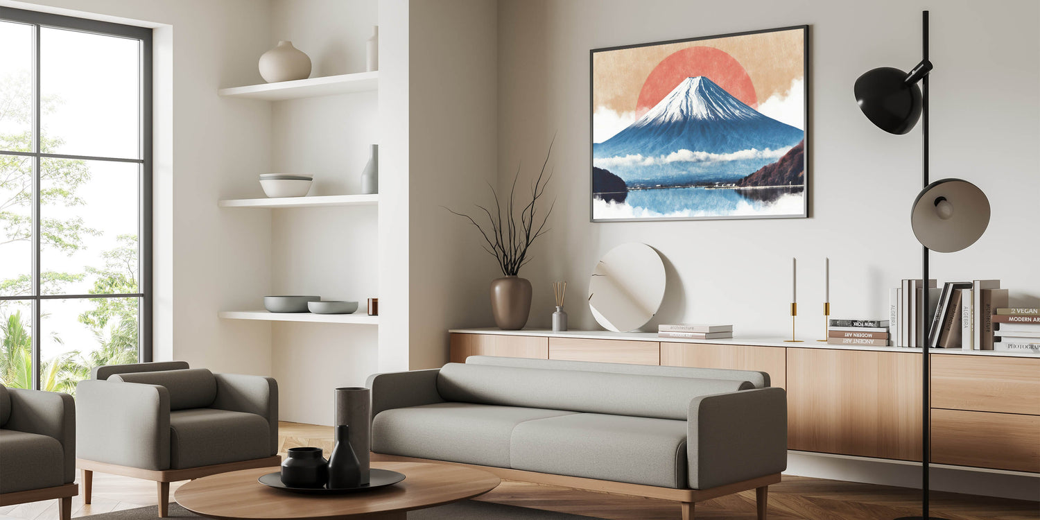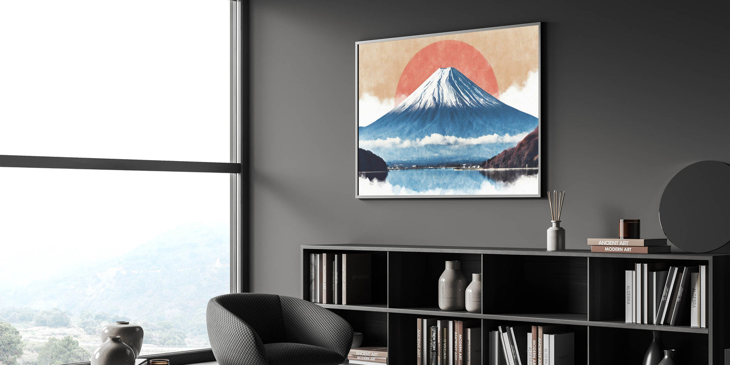 - Striking minimalist Mount Fuji canvas art with a bold sunrise backdrop