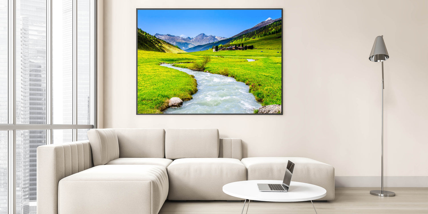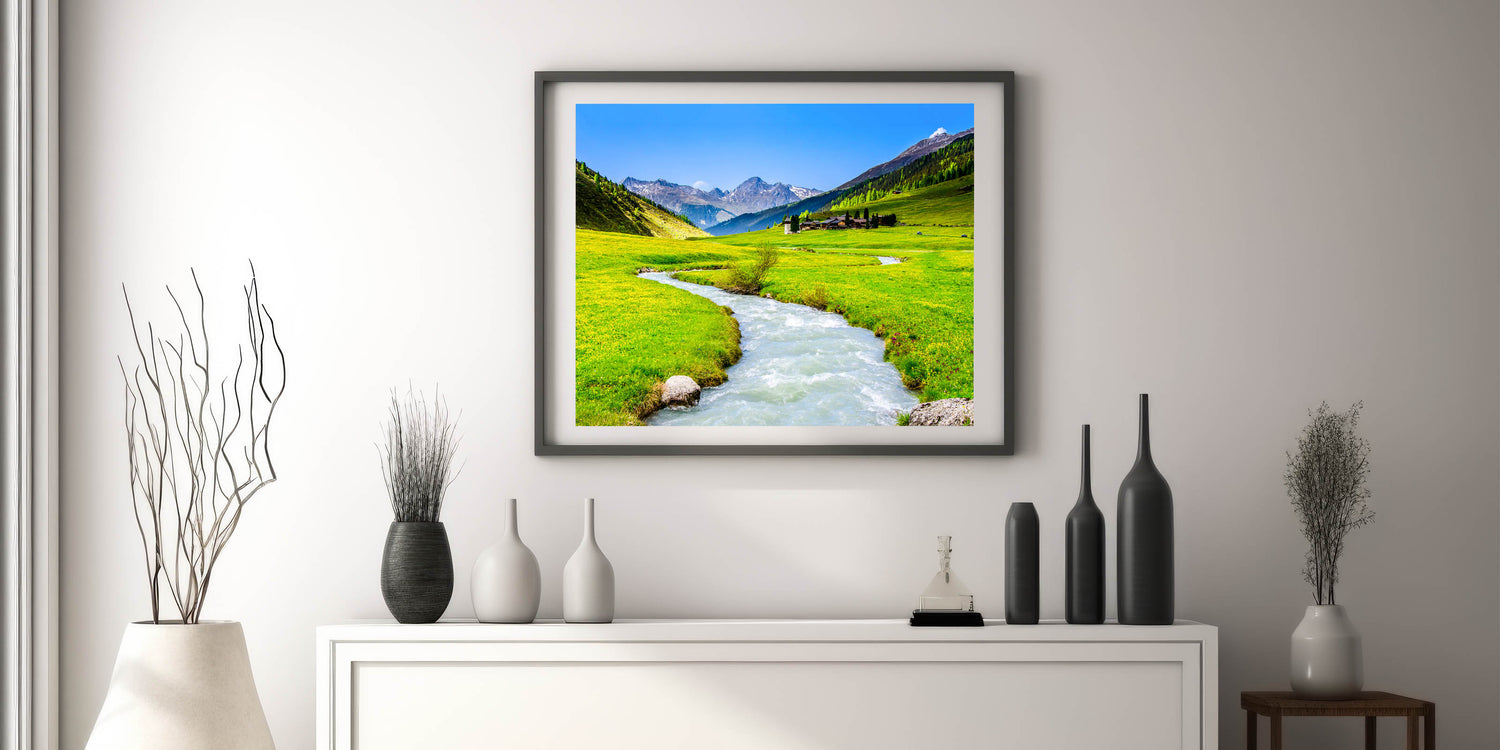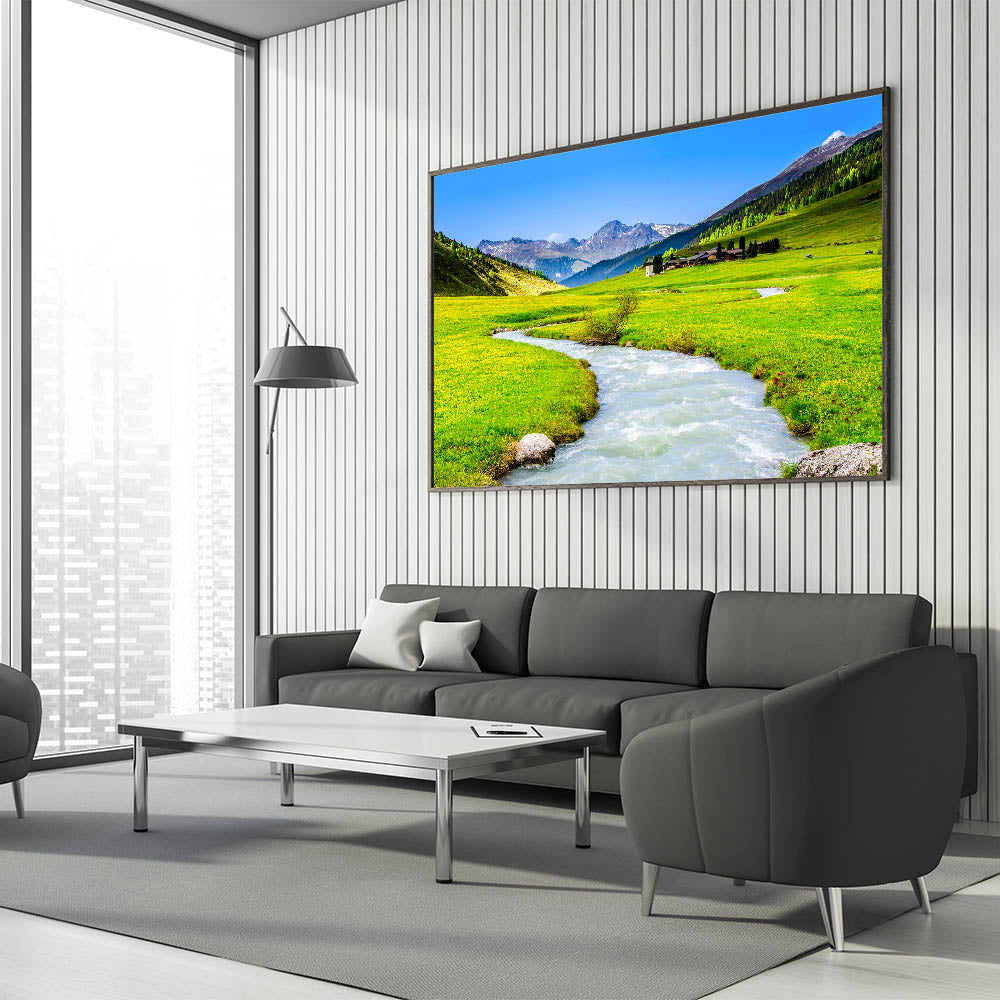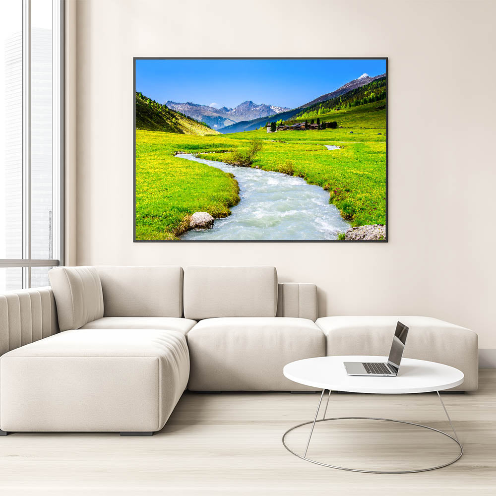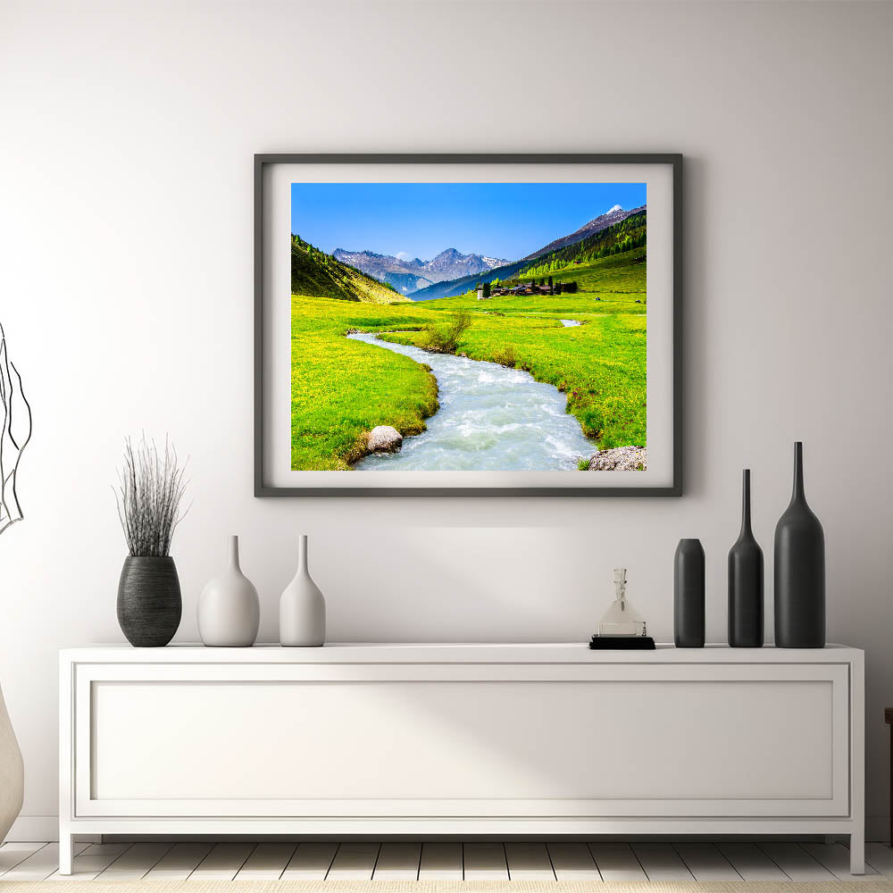 Immerse yourself in the serene beauty of this stunning marsh and swamp wall art, featuring a crystal-clear mountain stream winding through a lush green valley. The vivid colors and peaceful scenery make this artwork a perfect addition to any room, bringing the tranquility and majesty of nature into your home.