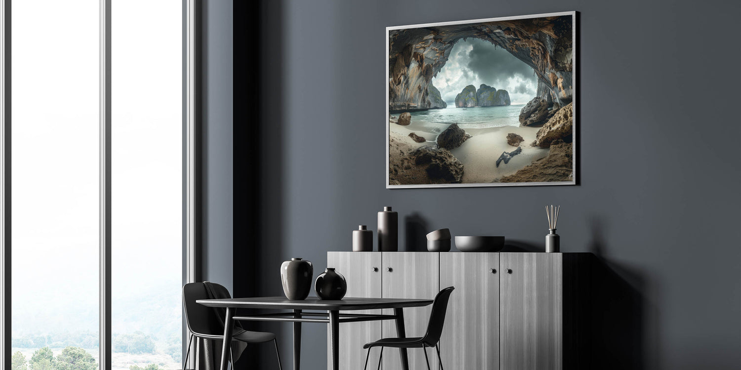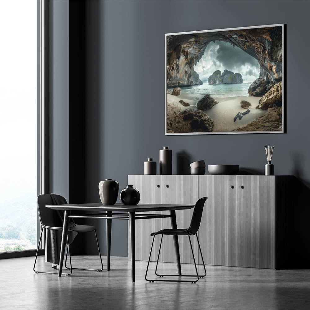Unveil the mystery and beauty of Thailand with our "Mystic Cave Beach - Dramatic Coastal Thailand Canvas Art." This piece transports viewers to a secluded cave beach, where towering rock formations frame a serene coastal view under a moody sky, creating a captivating and almost otherworldly atmosphere.