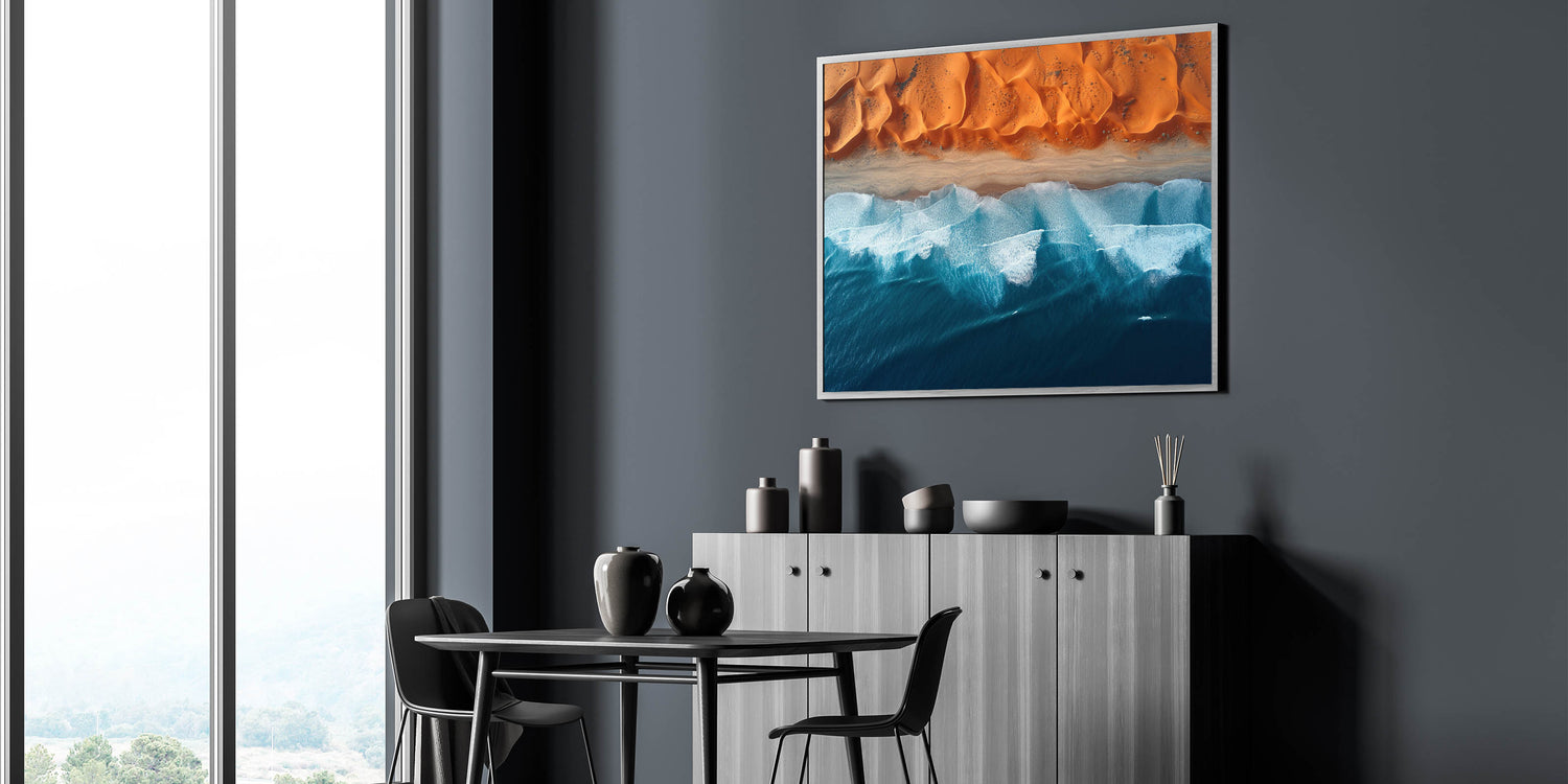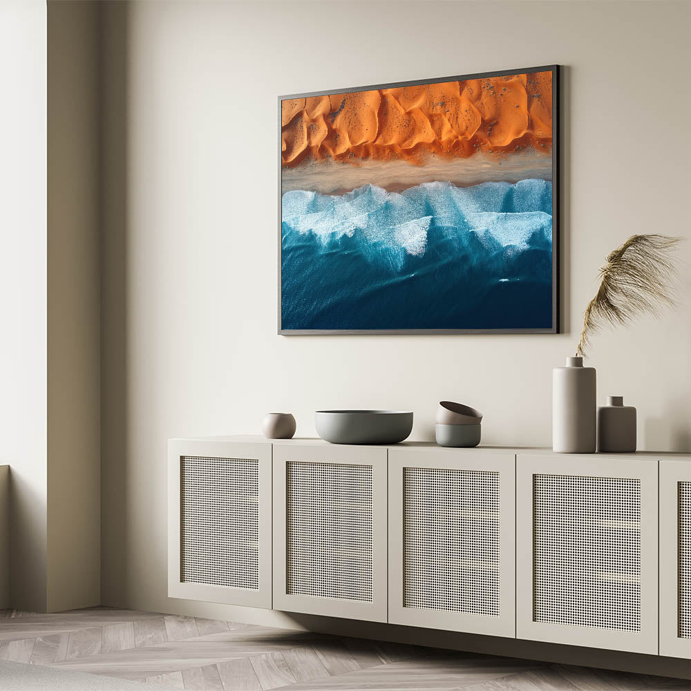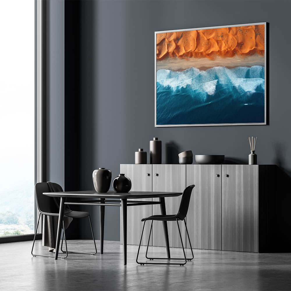 This mesmerizing aerial wall art showcases the captivating meeting point between the Namibian desert and the powerful ocean waves. The vivid contrast between the rich orange dunes and the deep blue sea creates a striking composition that draws the viewer into the heart of nature’s beauty. This unique view of Namibia’s coastline offers a perfect blend of the rugged desert and the serene ocean, bringing a touch of tranquility and wonder to any room.