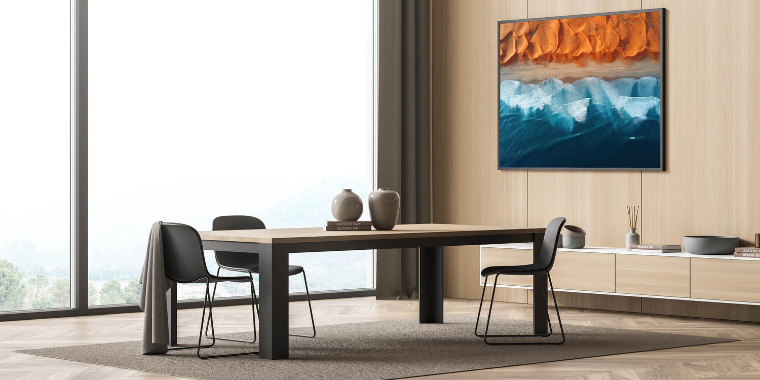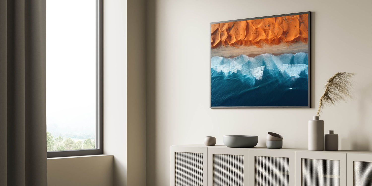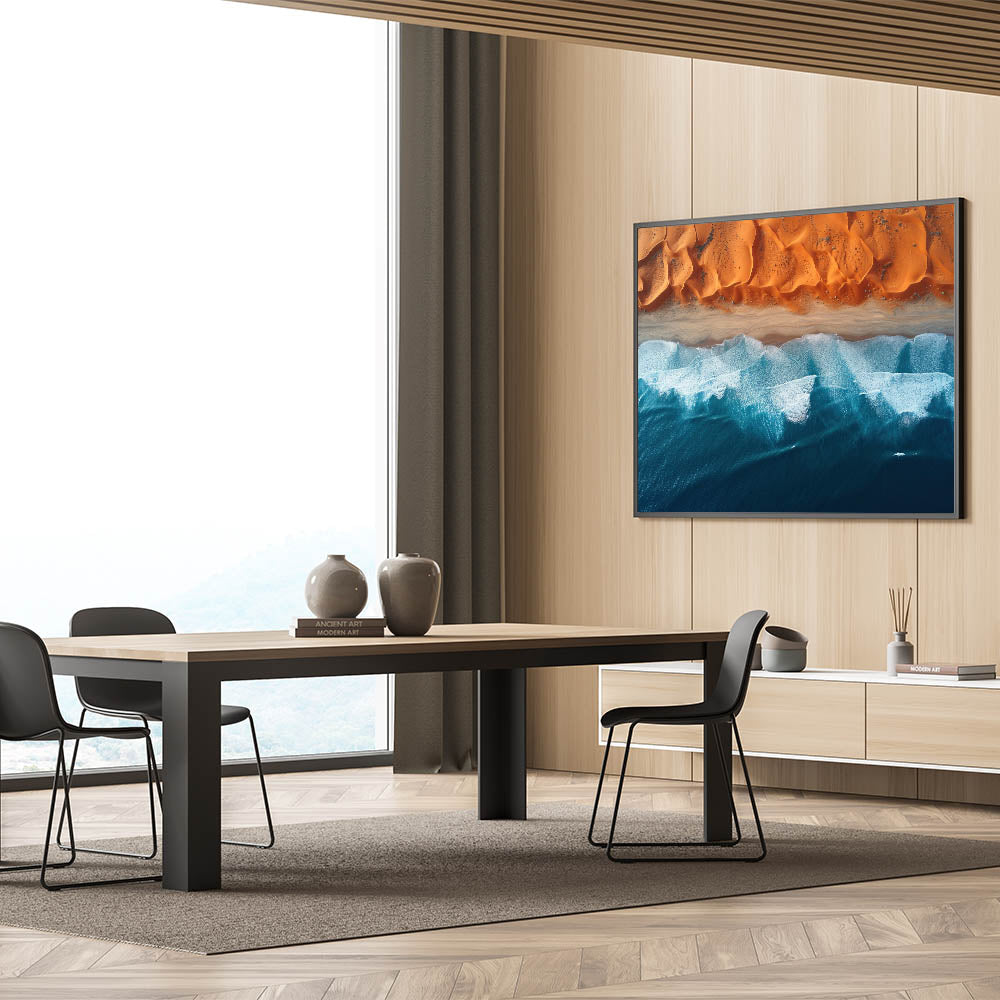 This mesmerizing aerial wall art showcases the captivating meeting point between the Namibian desert and the powerful ocean waves. The vivid contrast between the rich orange dunes and the deep blue sea creates a striking composition that draws the viewer into the heart of nature’s beauty. This unique view of Namibia’s coastline offers a perfect blend of the rugged desert and the serene ocean, bringing a touch of tranquility and wonder to any room.