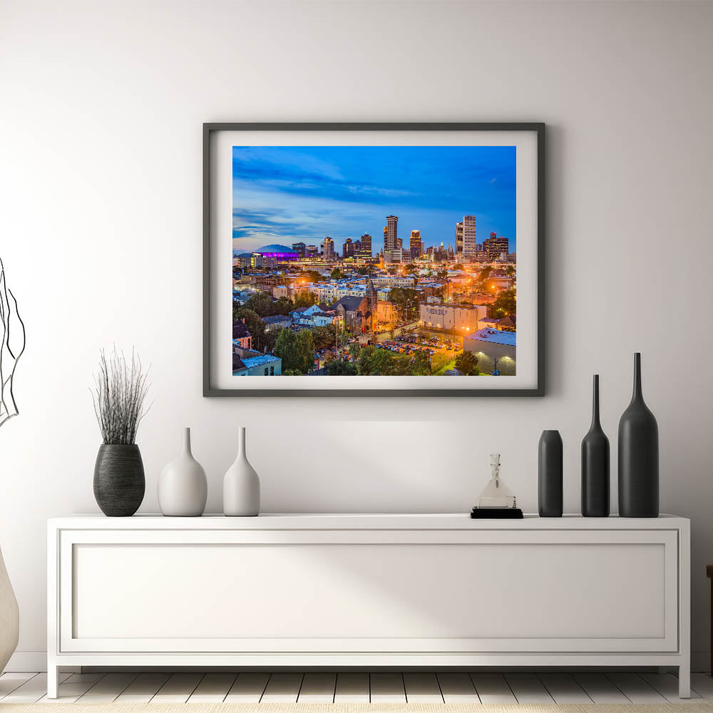 Experience the dynamic beauty of New Orleans with this vibrant evening cityscape photography print. The stunning blend of warm and cool tones captures the lively spirit of the city, making it a perfect addition to any space seeking a touch of urban charm. The iconic skyline, including the famous Superdome, is bathed in the warm glow of city lights, providing a captivating view that brings New Orleans to life.