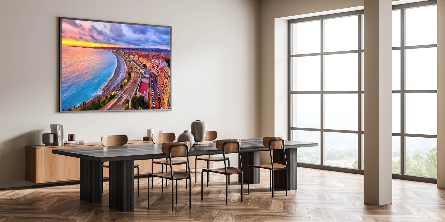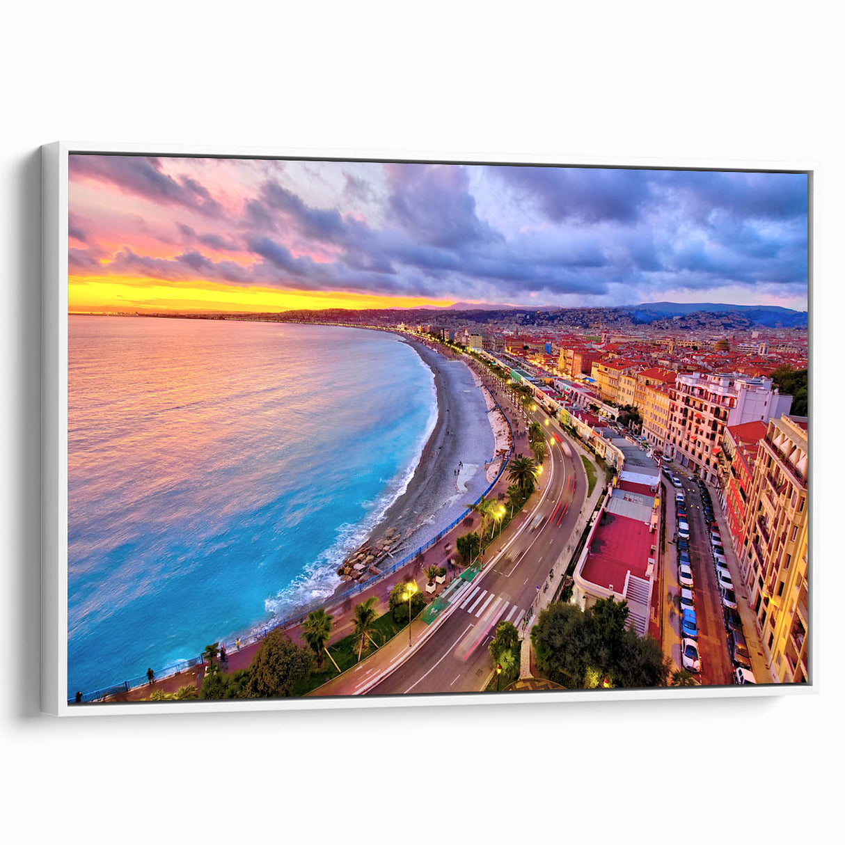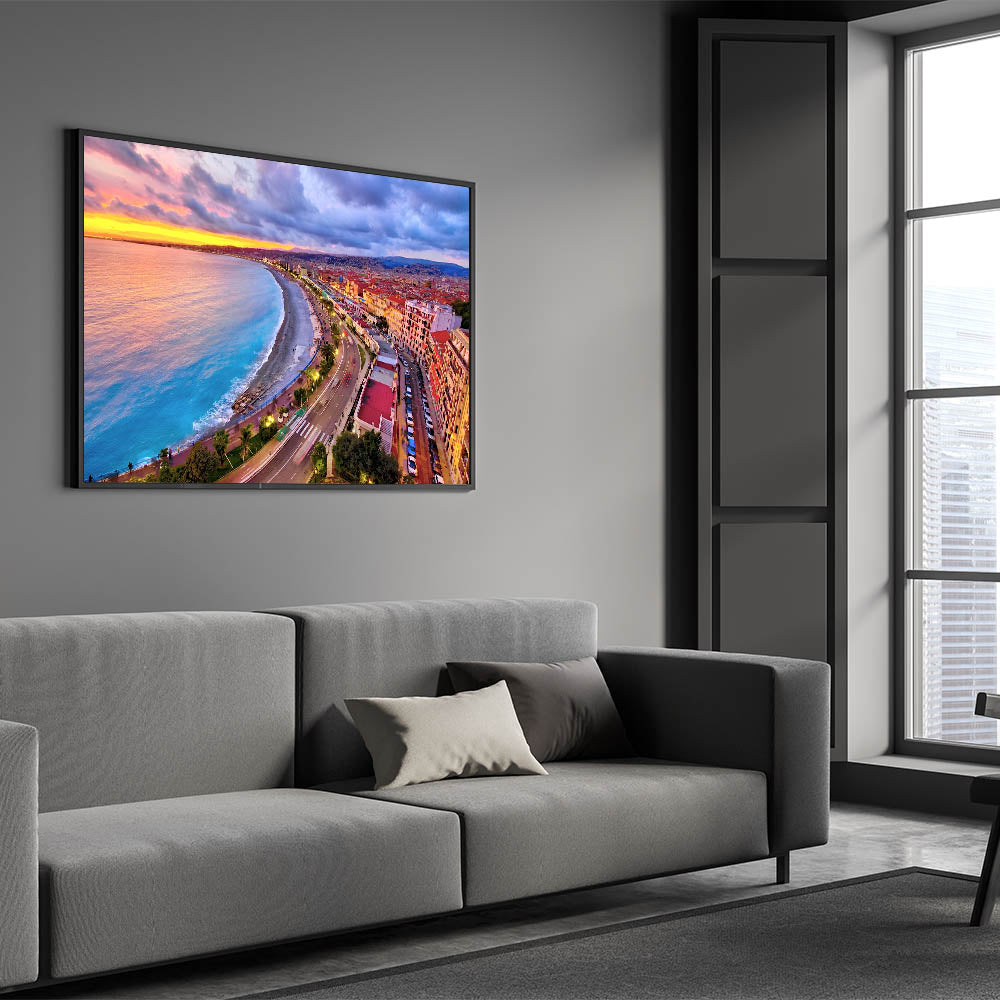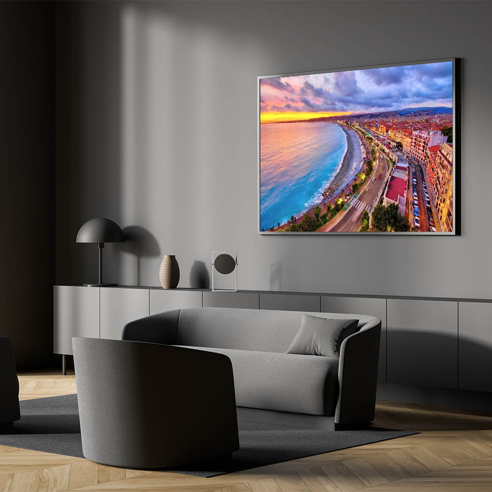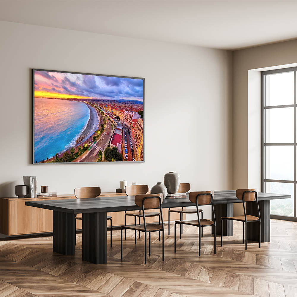 Capture the vibrant energy of Nice, France, with this stunning Nice Cityscape Art. This artwork features a breathtaking view of the Promenade des Anglais during sunset, where the skies burst with hues of pink, orange, and purple, reflecting on the Mediterranean Sea. The curved coastline, bustling promenade, and radiant city lights make this Scenic Nice Canvas a lively addition to any space. Perfect for those looking to bring a piece of the French Riviera’s beauty into their home.