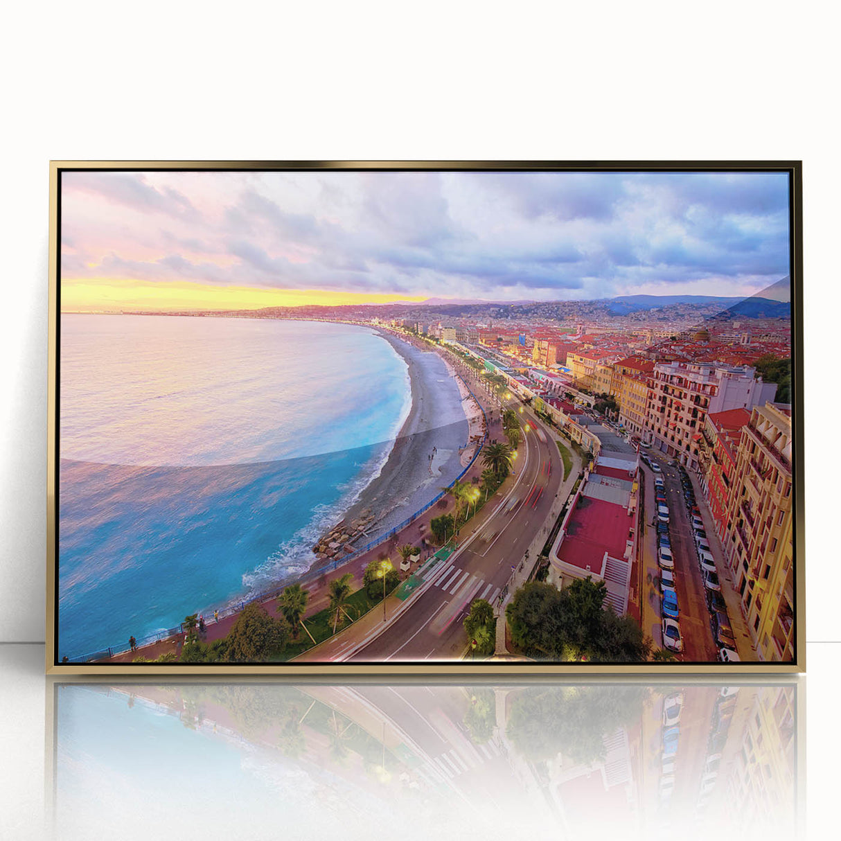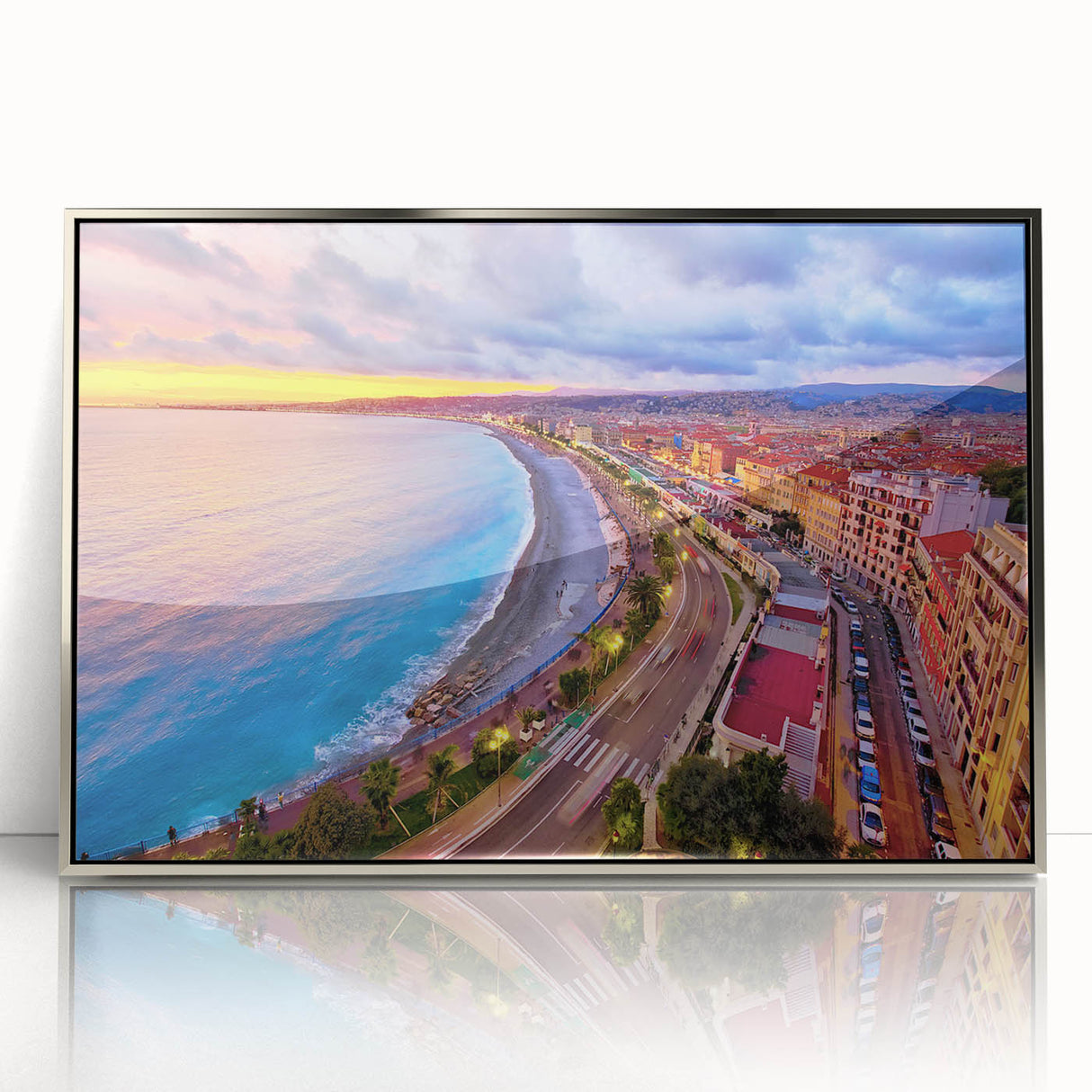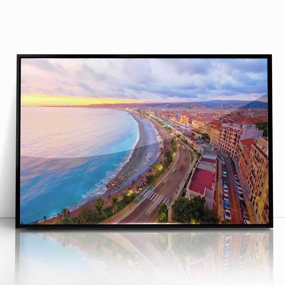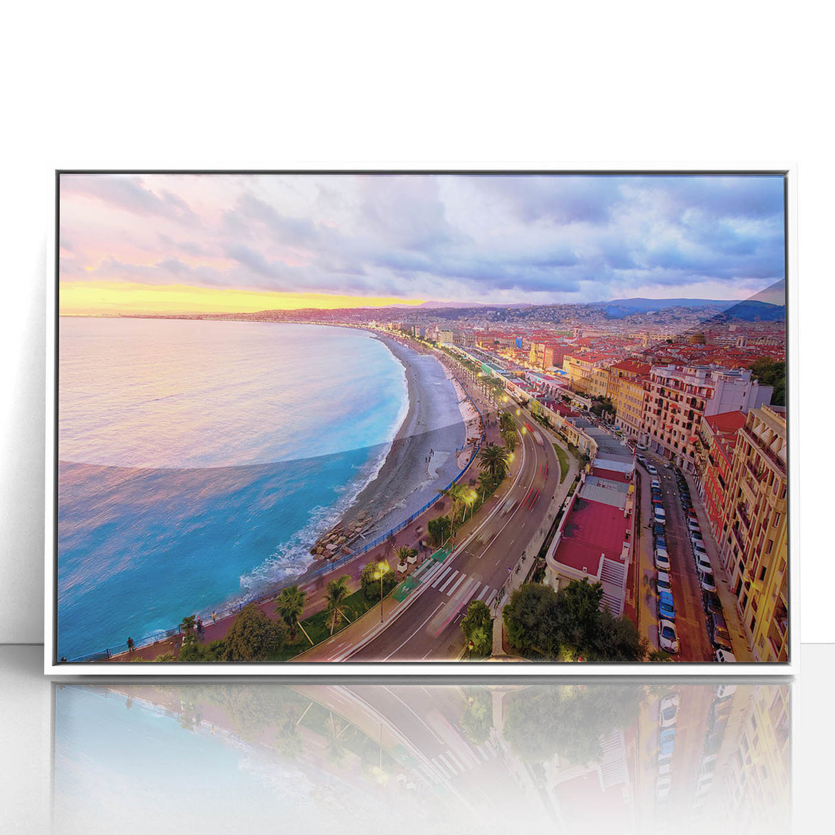 Capture the vibrant energy of Nice, France, with this stunning Nice Cityscape Art. This artwork features a breathtaking view of the Promenade des Anglais during sunset, where the skies burst with hues of pink, orange, and purple, reflecting on the Mediterranean Sea. The curved coastline, bustling promenade, and radiant city lights make this Scenic Nice Canvas a lively addition to any space. Perfect for those looking to bring a piece of the French Riviera’s beauty into their home.