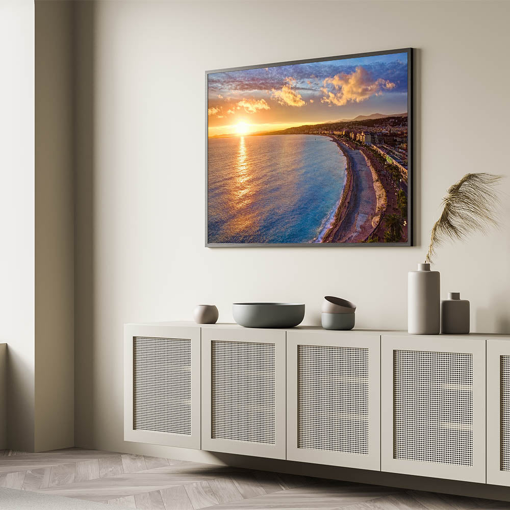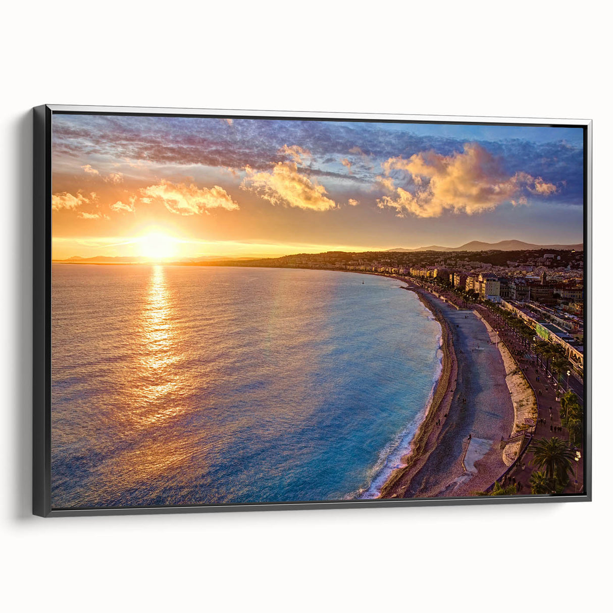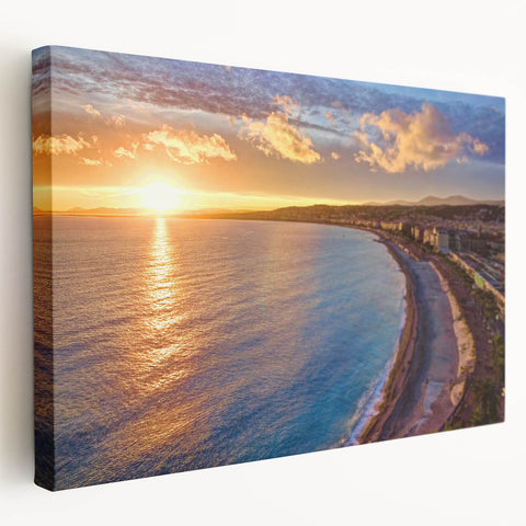 Bring the golden glow of a Mediterranean sunset into your home with this stunning Nice Coastal Art. Capturing the iconic Promenade des Anglais at sunset, this artwork features the brilliant orange and yellow hues of the setting sun as they reflect over the calm Mediterranean waters. The peaceful atmosphere, coupled with the lively energy of the coastline, makes this Scenic Nice Canvas a perfect addition to any space, offering a touch of elegance and serenity.