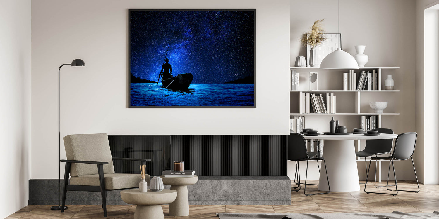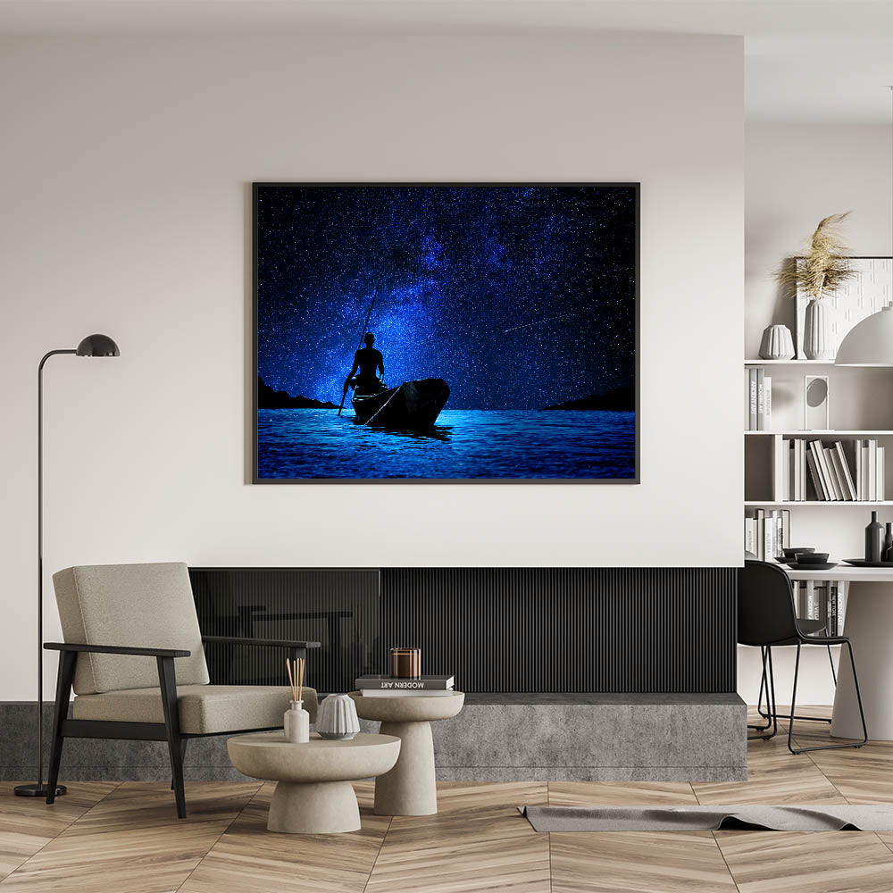 Embrace the mystical beauty of Mali’s night sky with this breathtaking wall art, featuring a silhouette of a fisherman against a backdrop of shimmering stars. The deep blues and twinkling lights create a mesmerizing scene that captures the peaceful solitude of night fishing in Africa. This artwork evokes a sense of wonder and tranquility, making it a perfect addition to any room that could benefit from a touch of serenity.