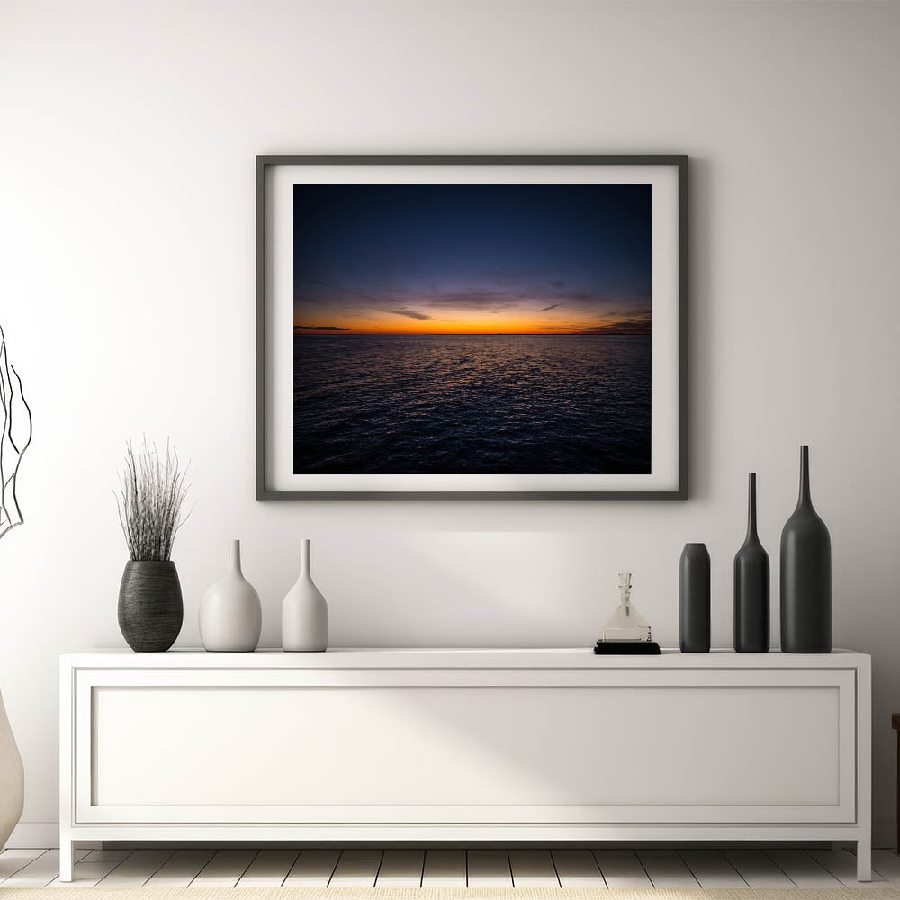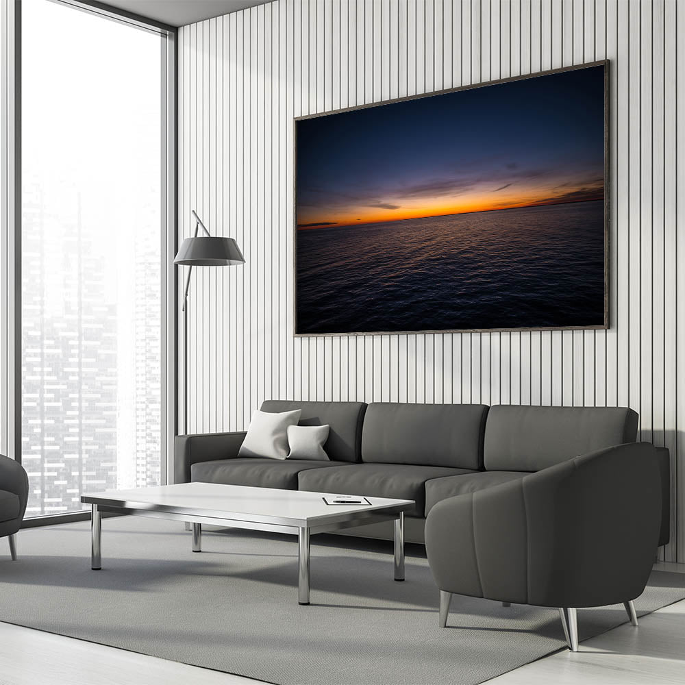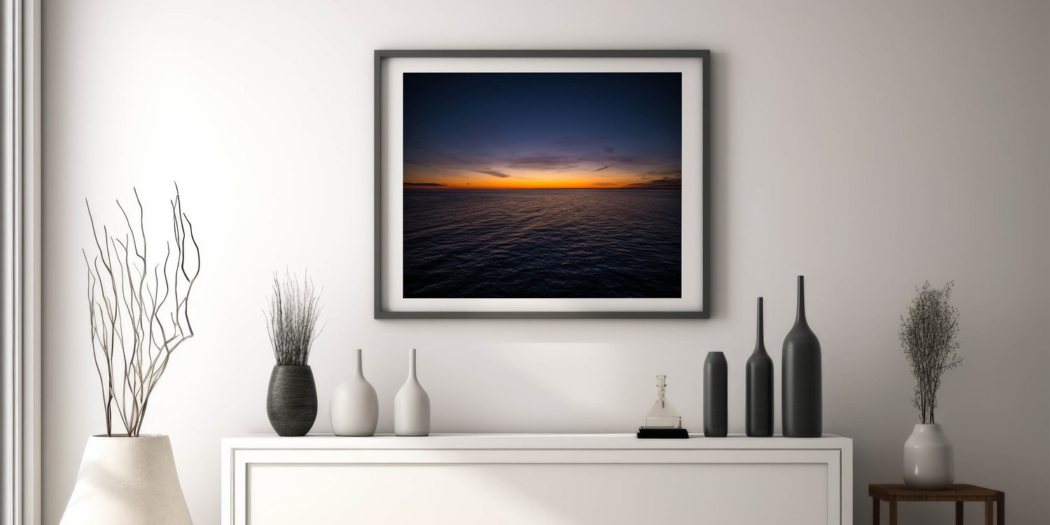 Embrace the tranquil beauty of a New Brunswick sunset over the open ocean with this stunning wall art. The soft hues of the setting sun cast a peaceful glow over the water, creating a serene, minimalist composition that will bring calm and elegance to any room. Perfect for those who appreciate simplicity and natural beauty, this artwork will transform your space into a peaceful retreat.