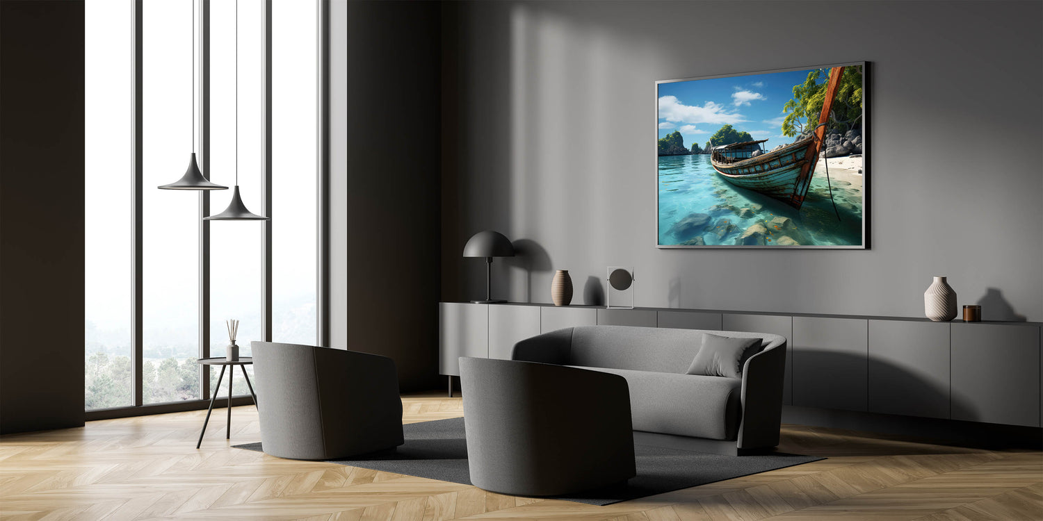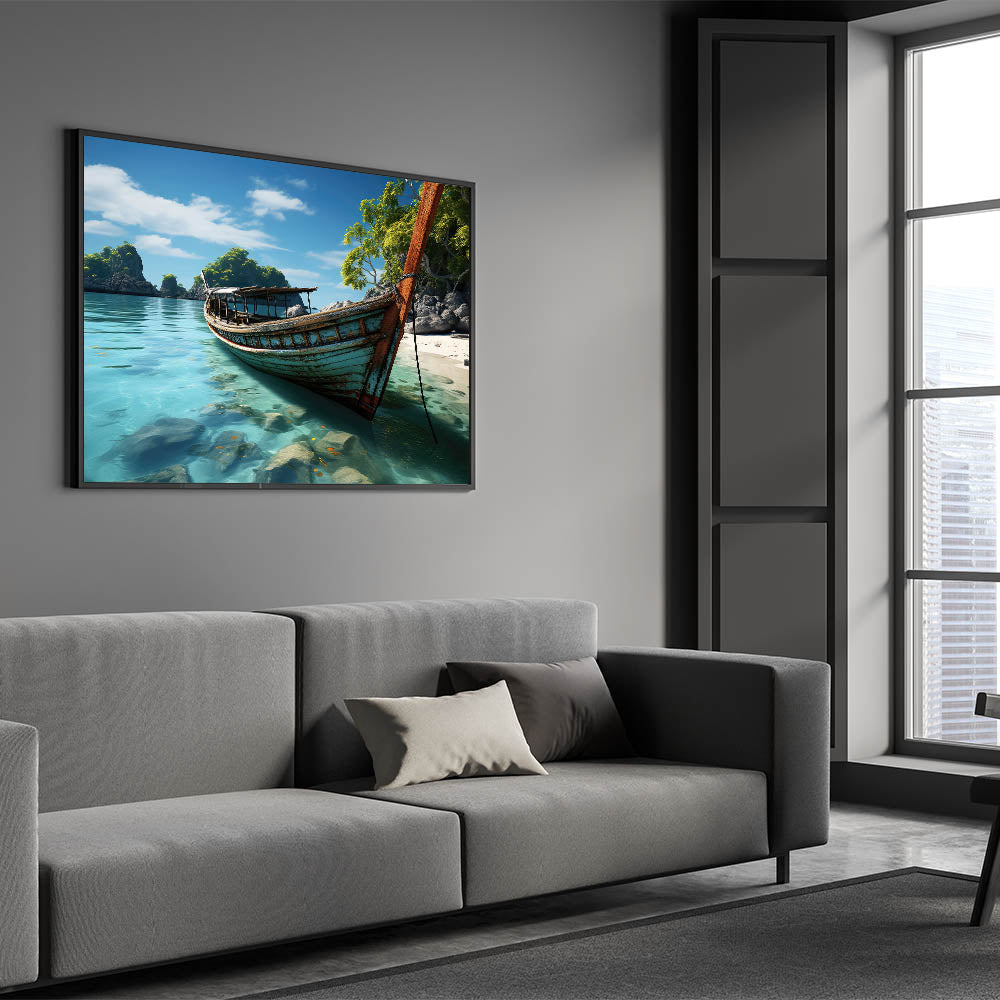 Discover the untouched charm of Thailand with our "Old Thai Boat on Tranquil Beach - Tropical Canvas Art." This artwork captures a peaceful moment on a secluded Thai beach, where a time-worn boat rests on the crystal-clear waters, surrounded by lush tropical greenery and dramatic rock formations.