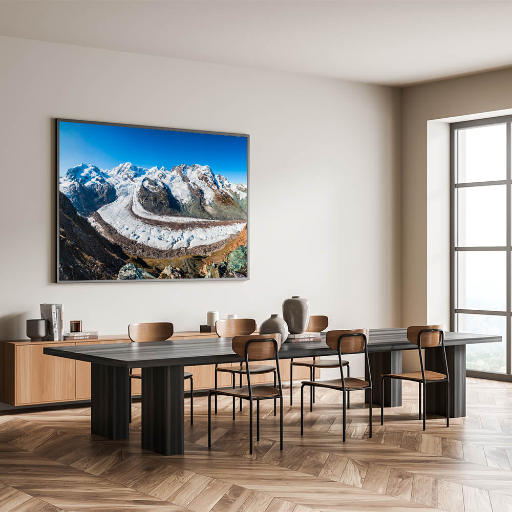 Embrace the awe-inspiring beauty of the mountains with this panoramic glacier landscape art. This stunning piece showcases a breathtaking view of a massive glacier winding through rugged mountain terrain. The crisp white snow contrasts beautifully with the rich earth tones of the surrounding rocks, all under a clear, vibrant blue sky. This majestic glacier wall art is perfect for those who seek to bring the grandeur of nature into their living or working spaces.