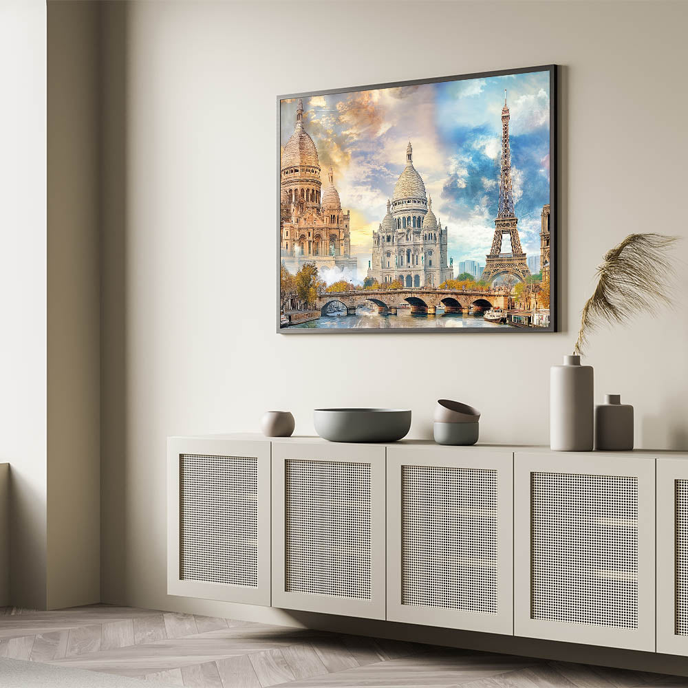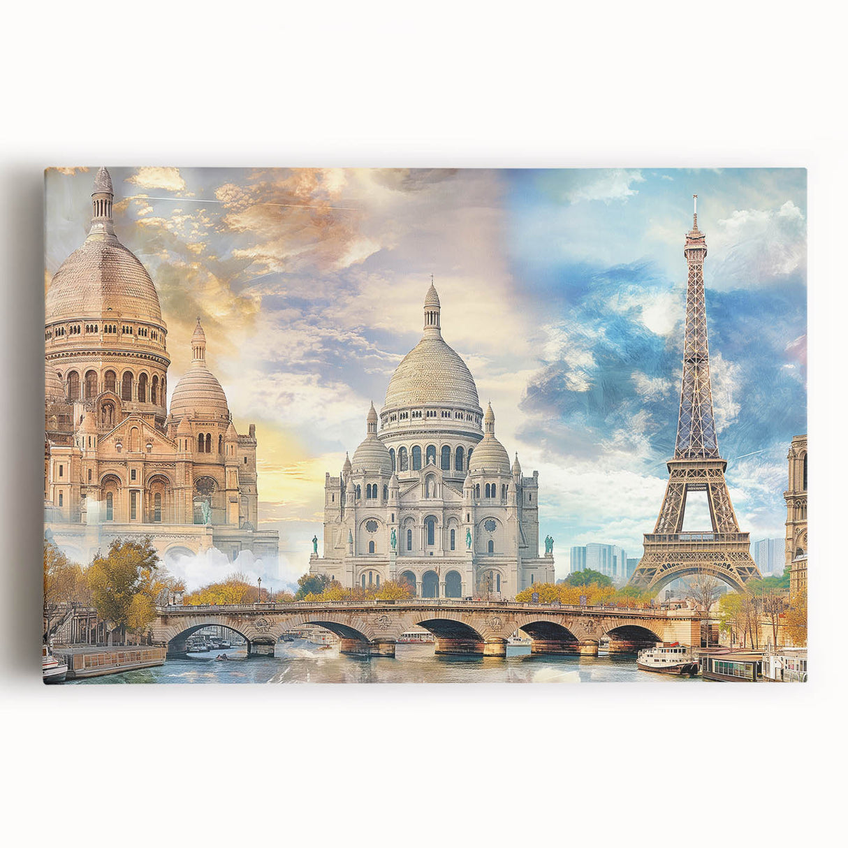 Immerse yourself in the romance and beauty of Paris with this captivating artwork featuring the iconic Eiffel Tower and Sacré-Cœur. This beautiful Paris canvas print offers a stunning combination of Parisian architecture and scenic views, perfect for anyone who loves French wall decor. With soft pastel tones and detailed imagery, this high-quality Paris artwork will add a sophisticated touch to any room.