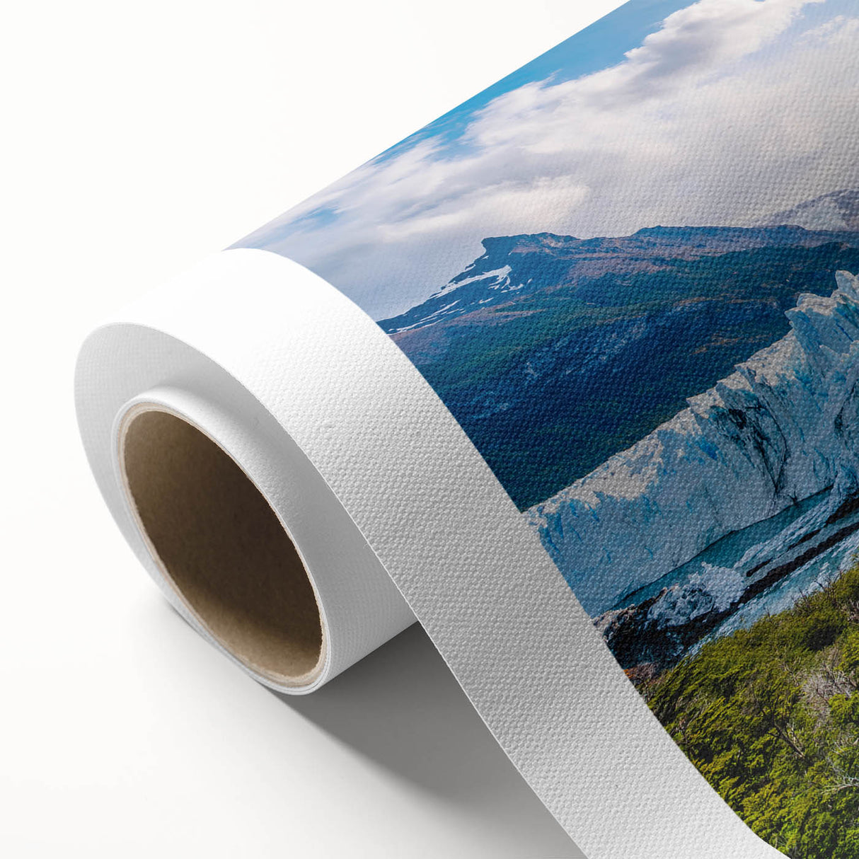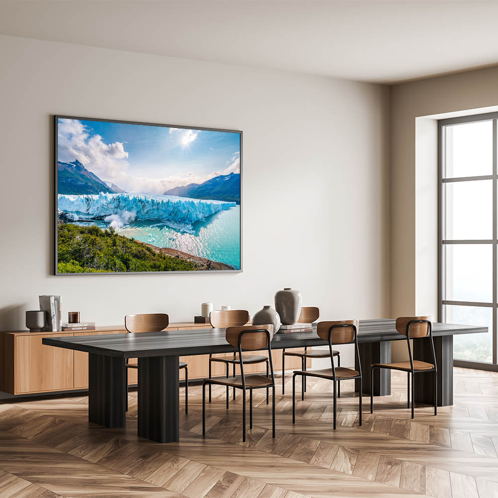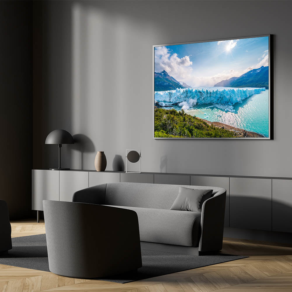 Capture the grandeur of the Patagonian glaciers with our "Patagonia Glacier Art." This stunning photograph showcases the vibrant blue ice formations and the expansive mountainous backdrop under a radiant sun, providing a glimpse into one of the world's most untouched natural environments.