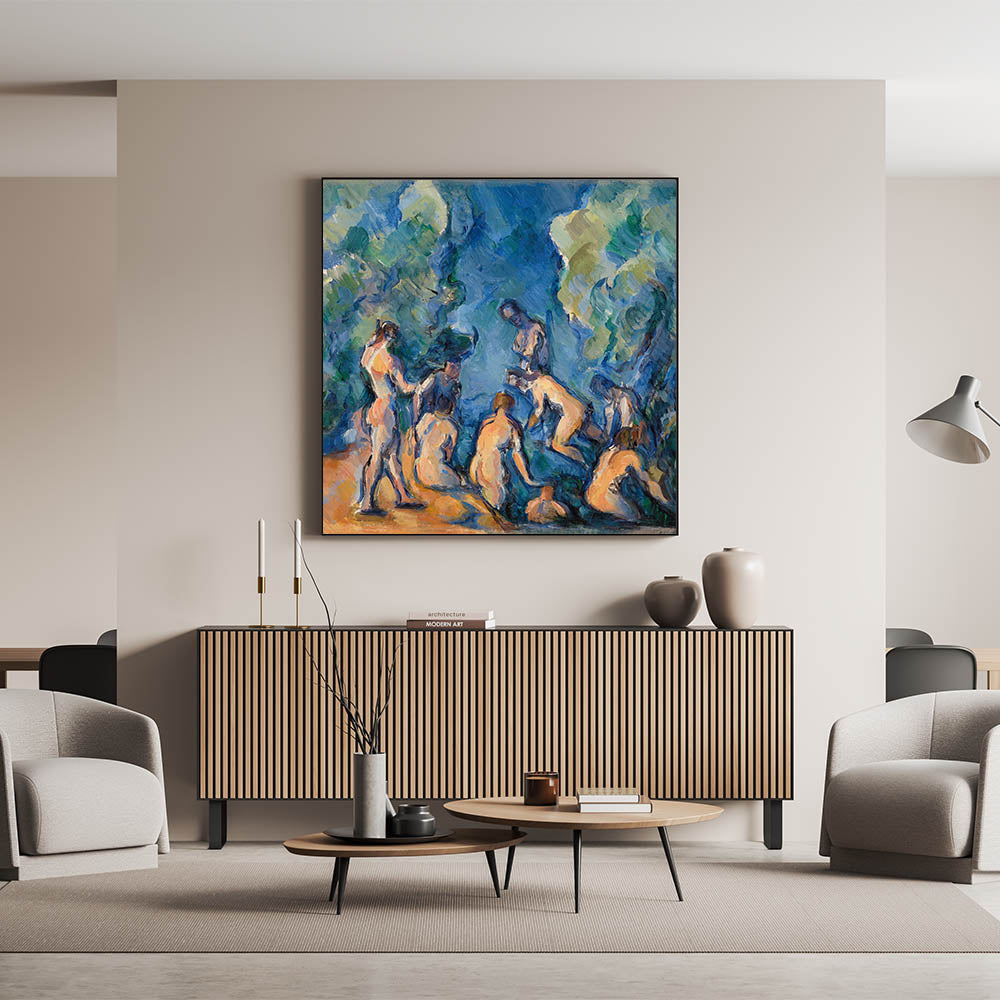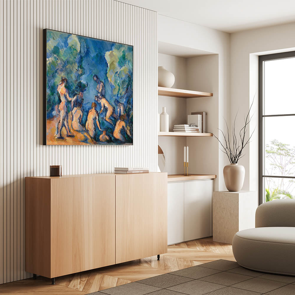 Enhance your space with this vibrant reproduction of Paul Cezanne’s iconic scene of bathers in nature. Known for his unique approach to the human form and the use of expressive brushstrokes, Cezanne captures the natural beauty and fluidity of the human body in this stunning Post-Impressionist piece. The vivid blues and greens of the background contrast beautifully with the warm skin tones of the figures, creating a harmonious and captivating composition.