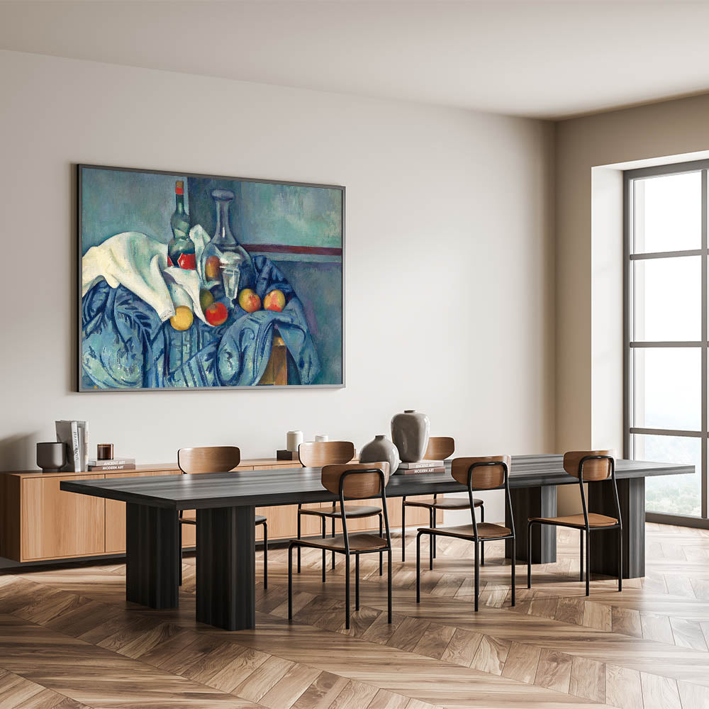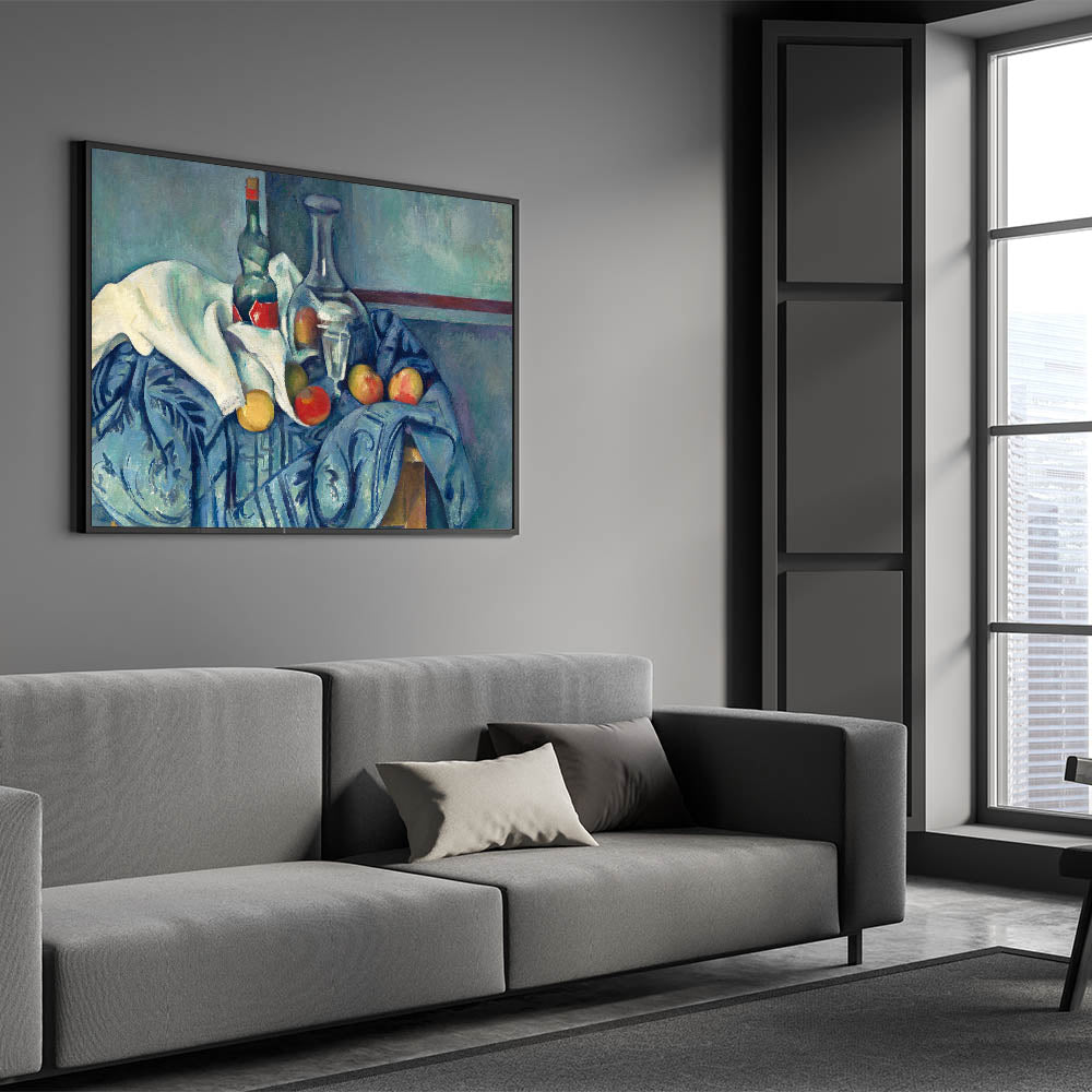 Add timeless elegance to your home with this exquisite reproduction of Paul Cézanne's still life featuring a bottle, fruit, and delicate drapery. The rich textures of the fabric and the reflective quality of the glass are beautifully rendered, showing Cézanne’s skillful handling of light and shadow. The vibrant colors of the fruit contrast with the cool blues and whites of the background, creating a balanced composition that is both serene and dynamic.