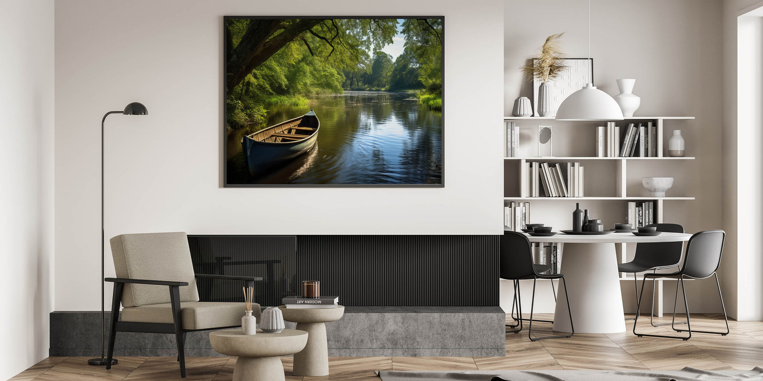Peaceful Rowboat on Forest River - Serene Coastal Wall Art Print